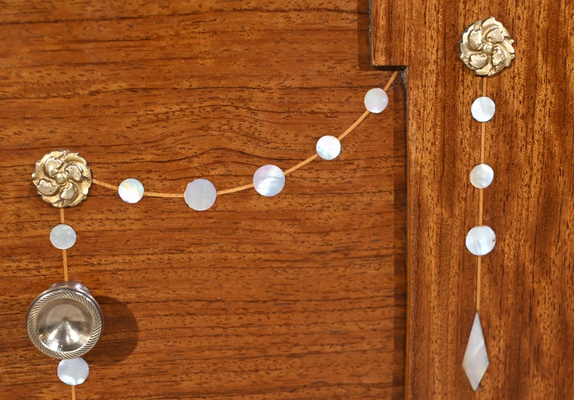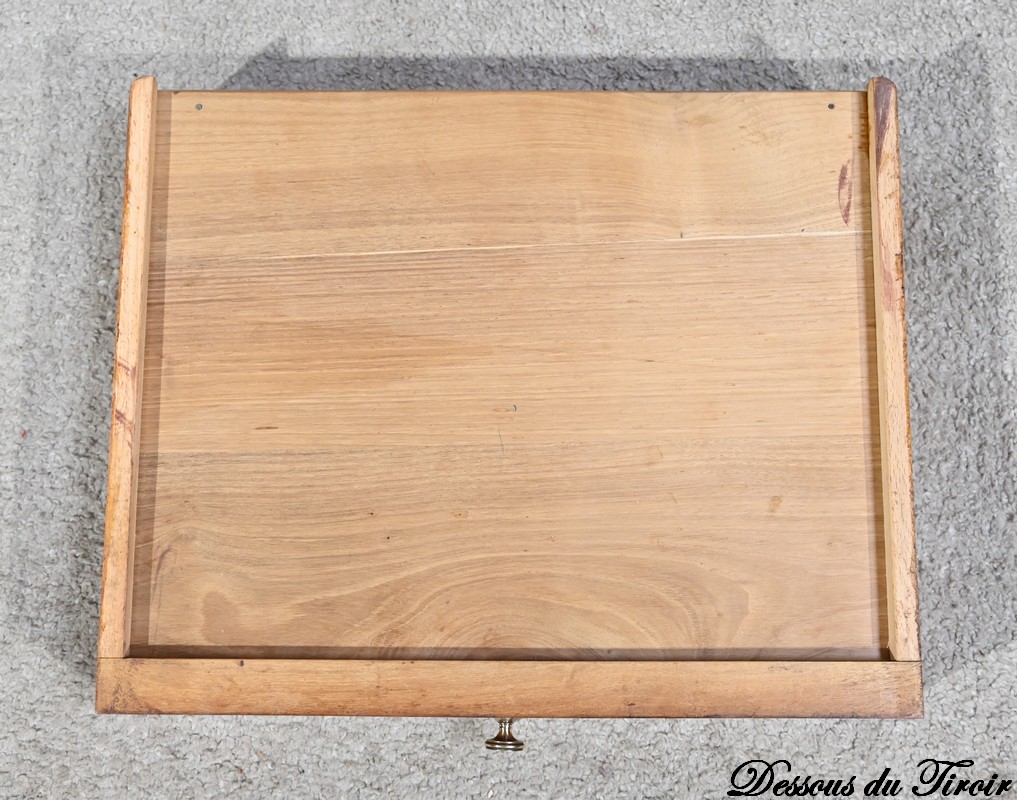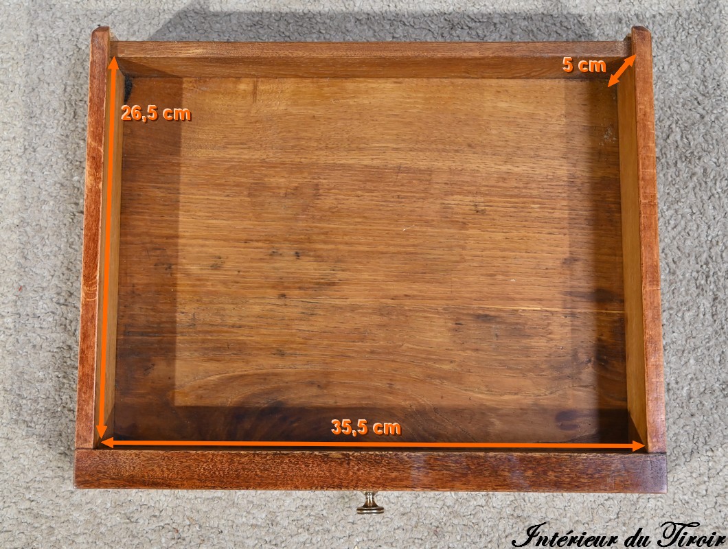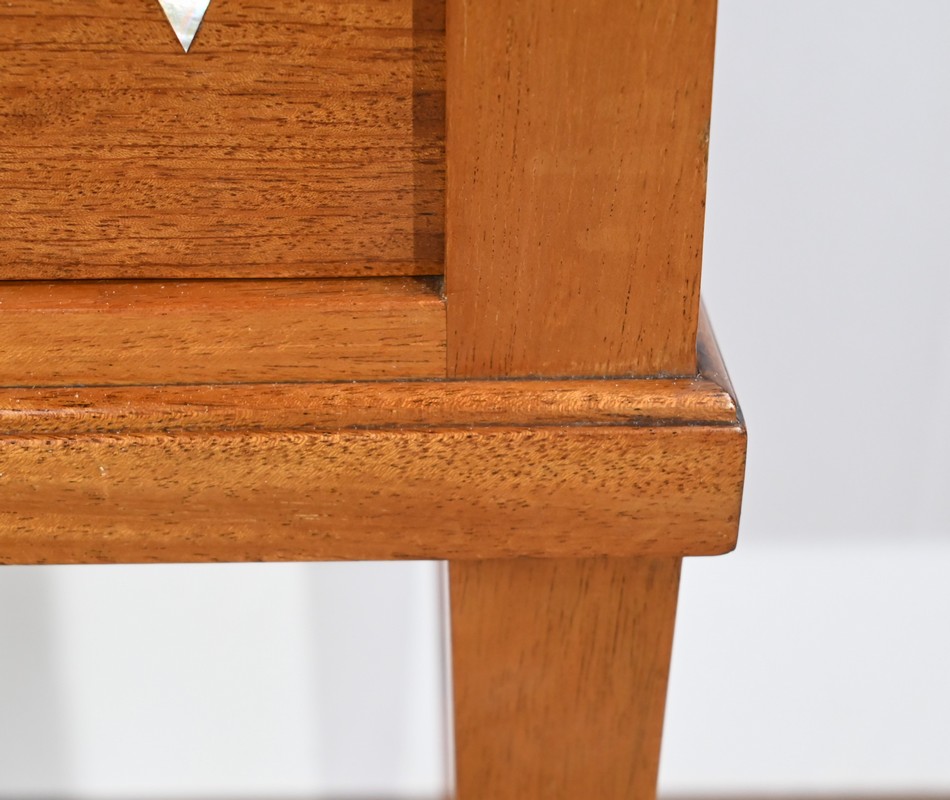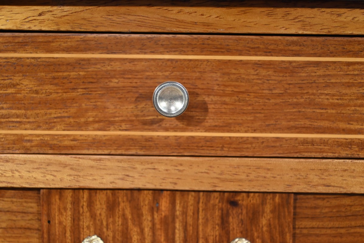 Il ouvre en ceinture par un tiroir en acajou moiré, à bouton cuvette, incrusté de filets de citronnier.