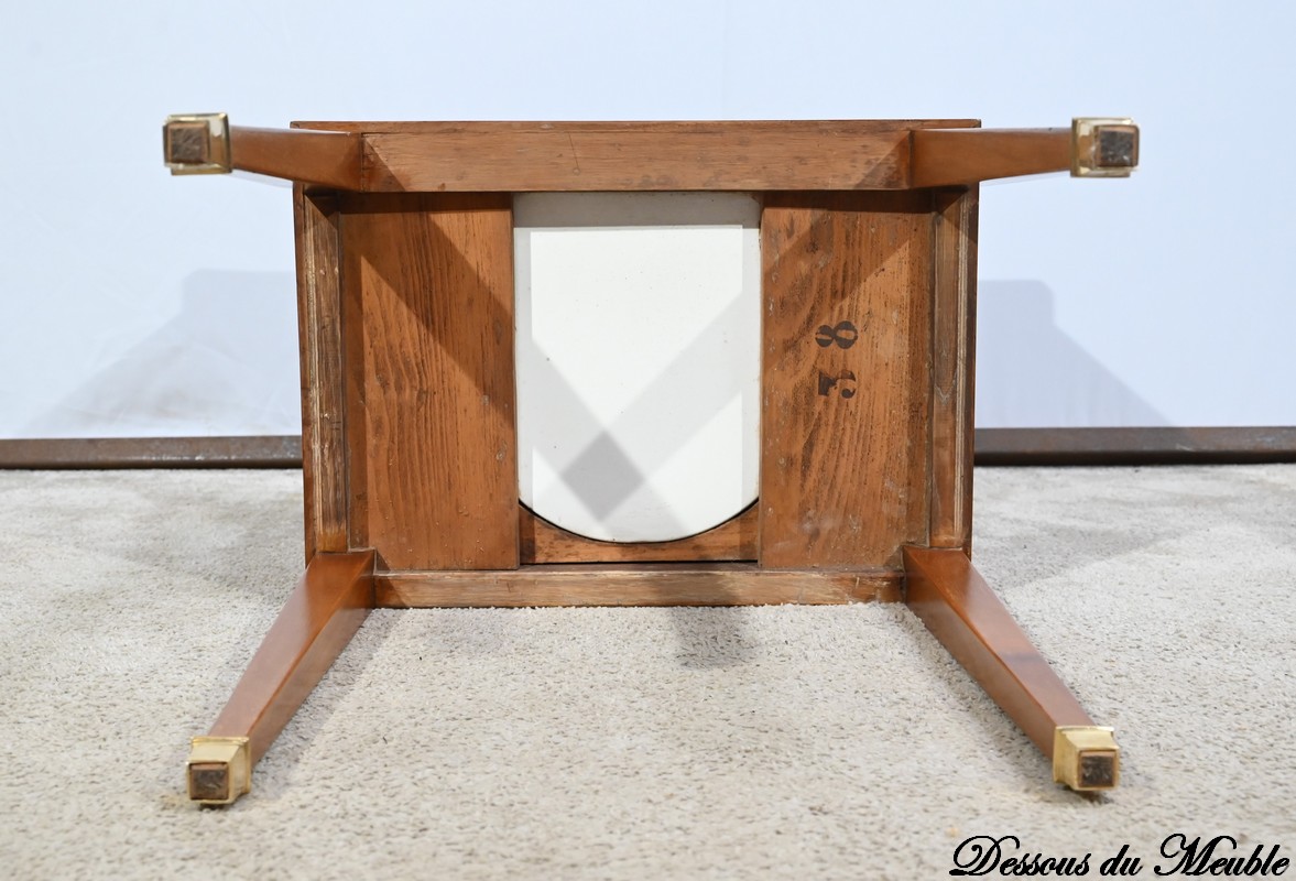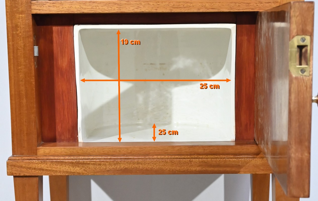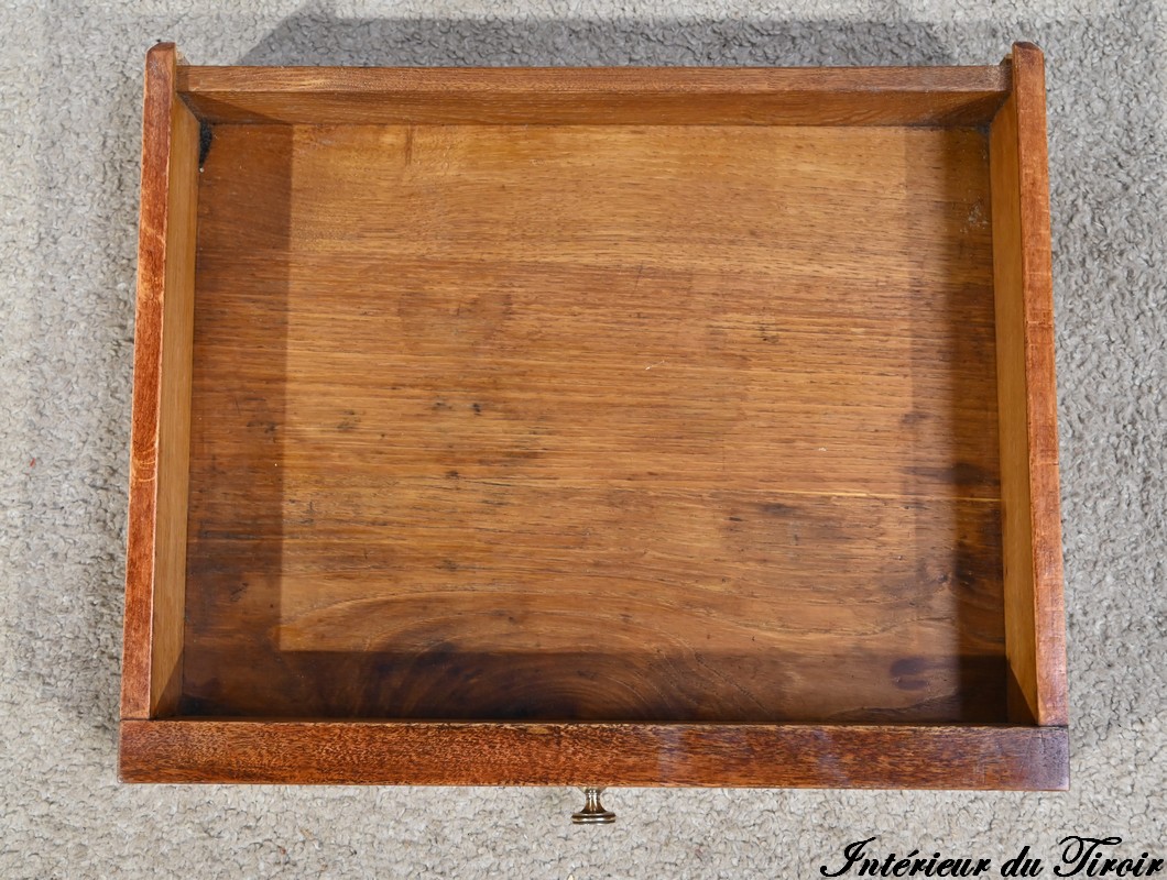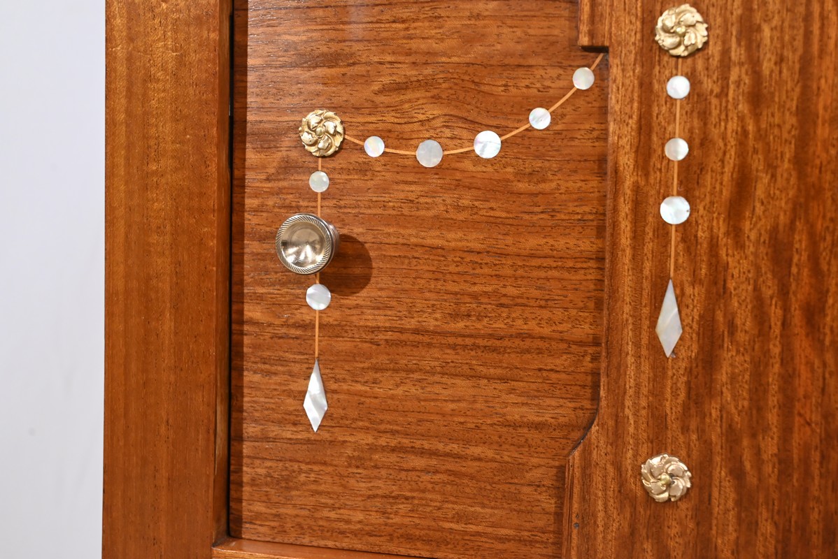 Il ouvre en ceinture par un tiroir en acajou moiré, à bouton cuvette, incrusté de filets de citronnier.