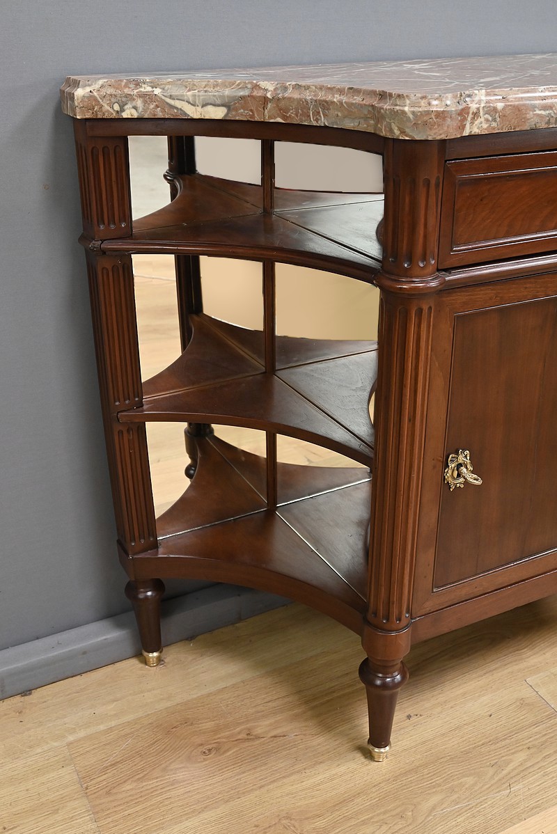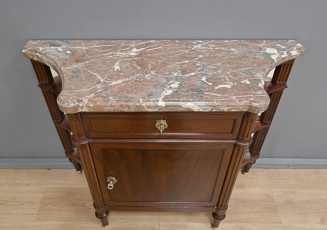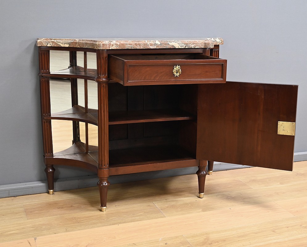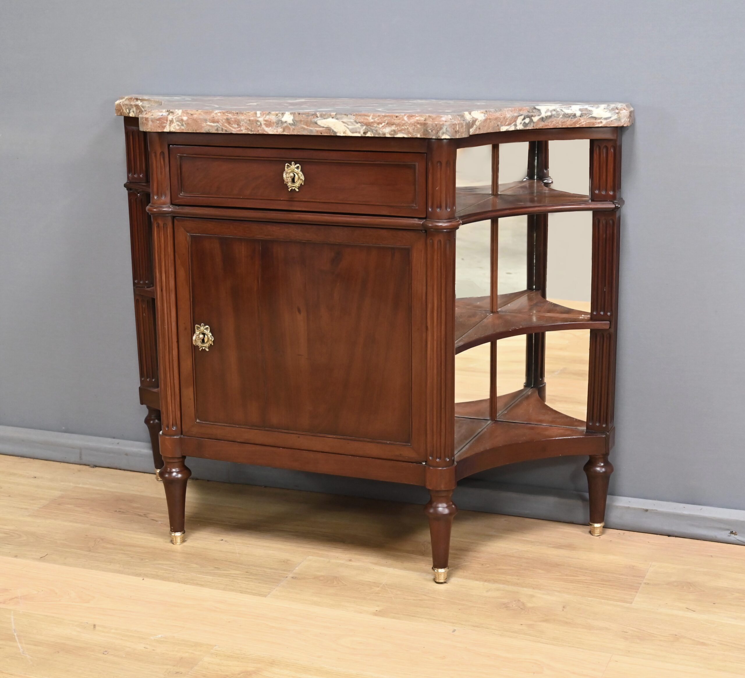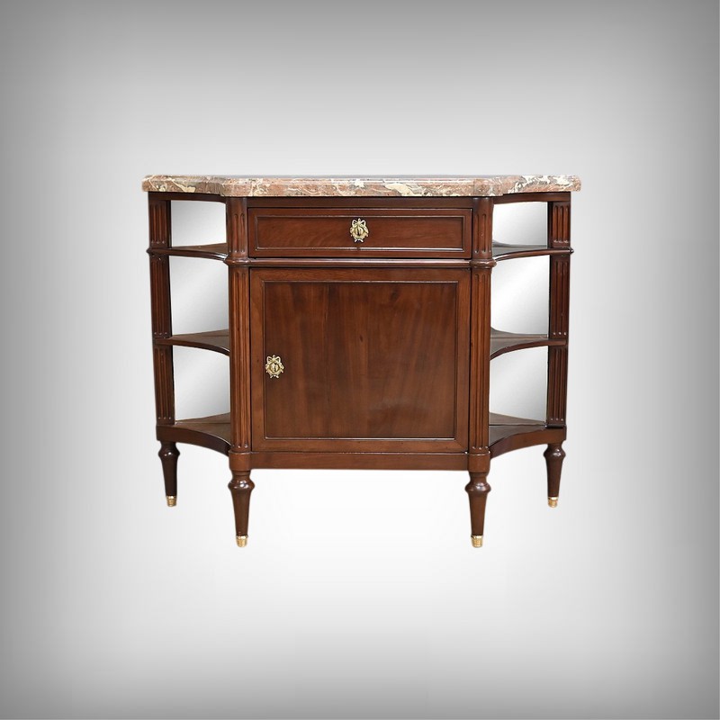 Ce ravissant petit meuble desserte en acajou de style Louis XVI, datant du XIXe siècle, séduit par l’élégance de ses lignes et la richesse de ses détails. Il est sommé d’un épais marbre Brèche de Bohème, sculpté d’une gorge périphérique qui souligne les formes du meuble. Ce dernier est muni de côtés concaves et d’angles avant arrondis, conférant à l’ensemble une silhouette douce et harmonieuse. Ce meuble est muni d’un tiroir et d’une porte, tous deux ornés d’une entrée enrubannée en bronze doré, typique du style Louis XVI. Une clé ouvragée accompagne la serrure, qui est en parfait état de fonctionnement.