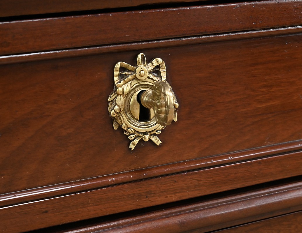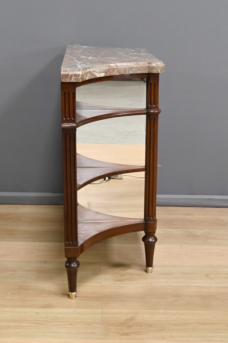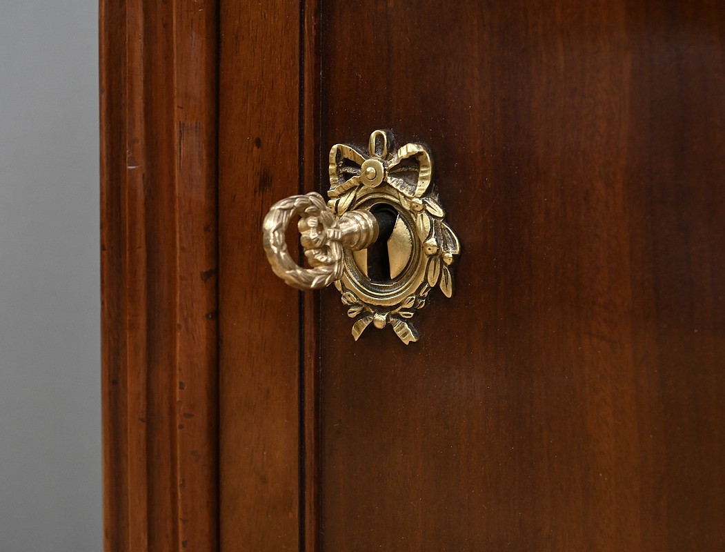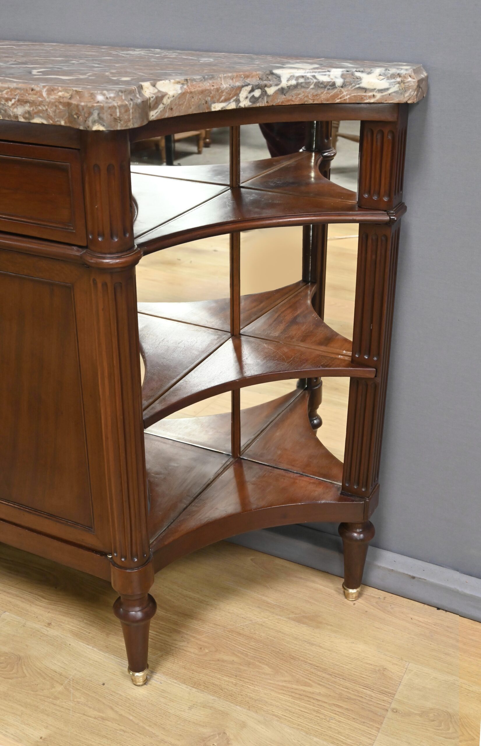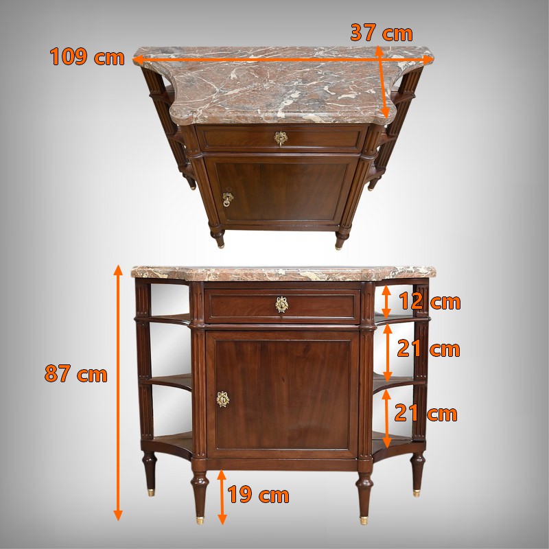 Ce ravissant petit meuble desserte en acajou de style Louis XVI, datant du XIXe siècle, séduit par l’élégance de ses lignes et la richesse de ses détails. Il est sommé d’un épais marbre Brèche de Bohème, sculpté d’une gorge périphérique qui souligne les formes du meuble. Ce dernier est muni de côtés concaves et d’angles avant arrondis, conférant à l’ensemble une silhouette douce et harmonieuse. Ce meuble est muni d’un tiroir et d’une porte, tous deux ornés d’une entrée enrubannée en bronze doré, typique du style Louis XVI. Une clé ouvragée accompagne la serrure, qui est en parfait état de fonctionnement.