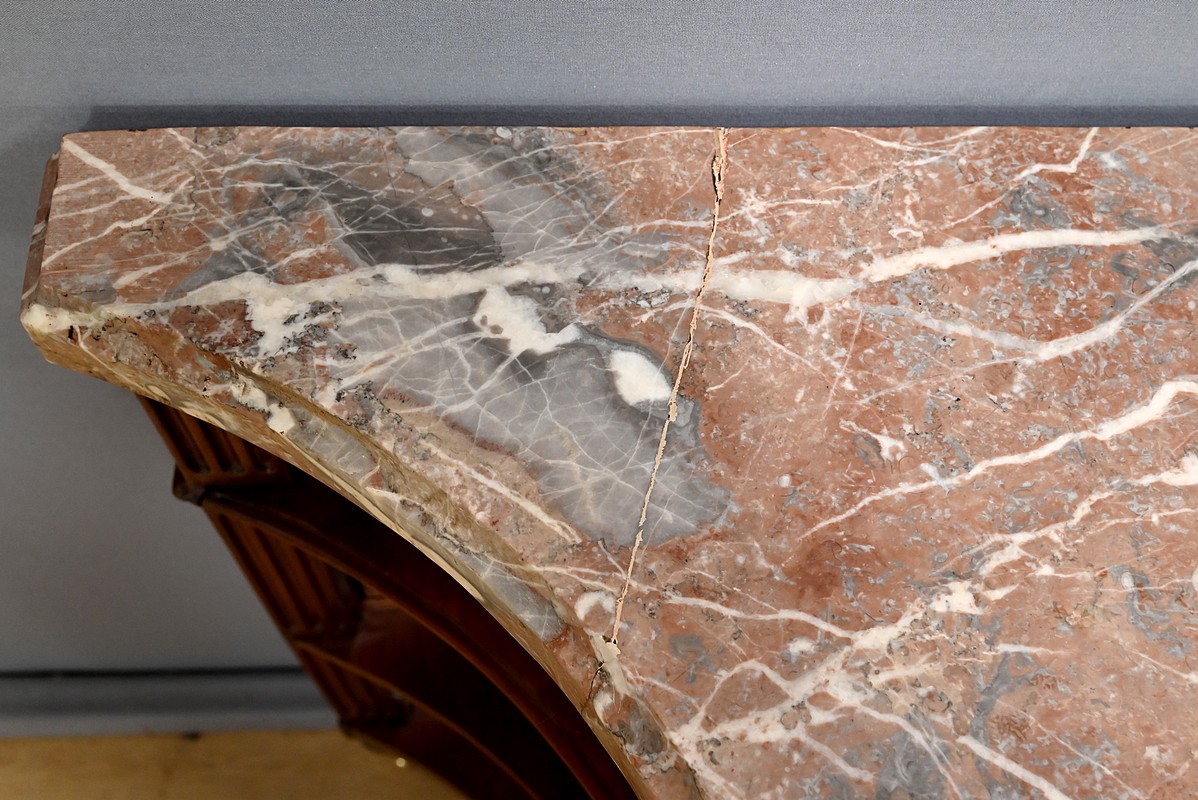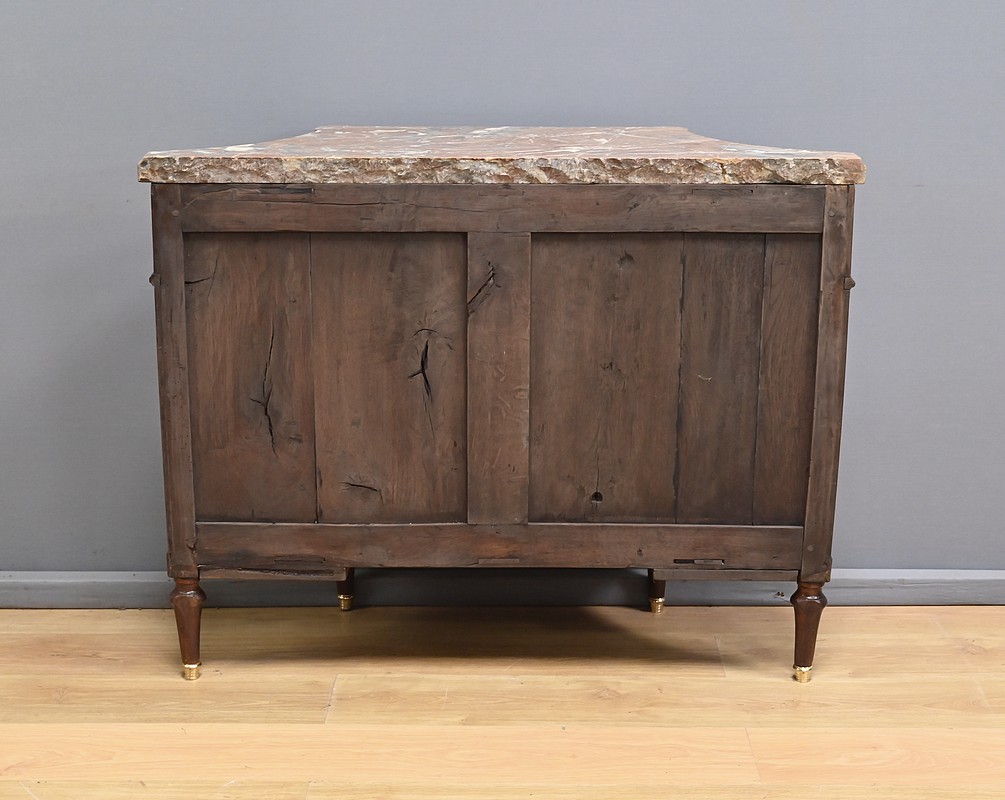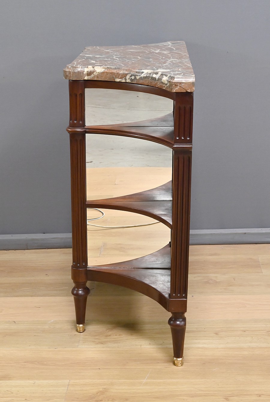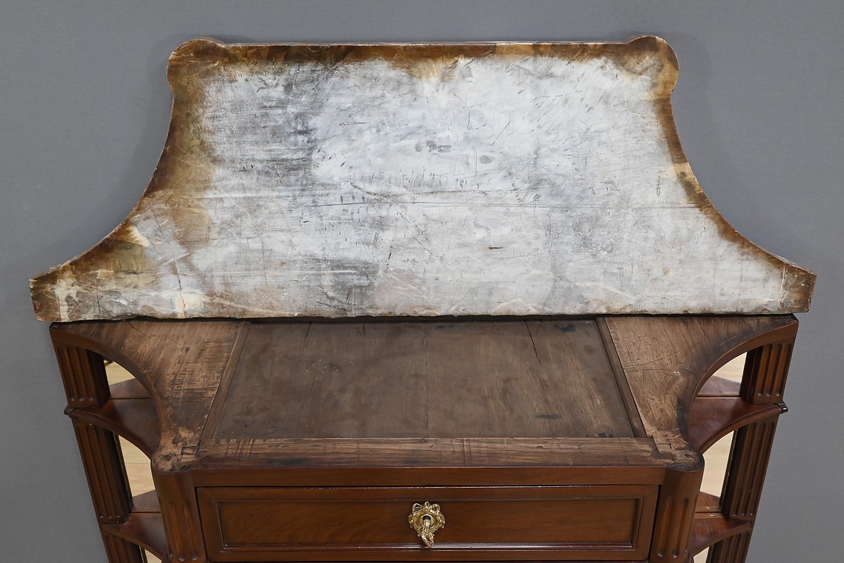 Ce ravissant petit meuble desserte en acajou de style Louis XVI, datant du XIXe siècle, séduit par l’élégance de ses lignes et la richesse de ses détails. Il est sommé d’un épais marbre Brèche de Bohème, sculpté d’une gorge périphérique qui souligne les formes du meuble. Ce dernier est muni de côtés concaves et d’angles avant arrondis, conférant à l’ensemble une silhouette douce et harmonieuse. Ce meuble est muni d’un tiroir et d’une porte, tous deux ornés d’une entrée enrubannée en bronze doré, typique du style Louis XVI. Une clé ouvragée accompagne la serrure, qui est en parfait état de fonctionnement.