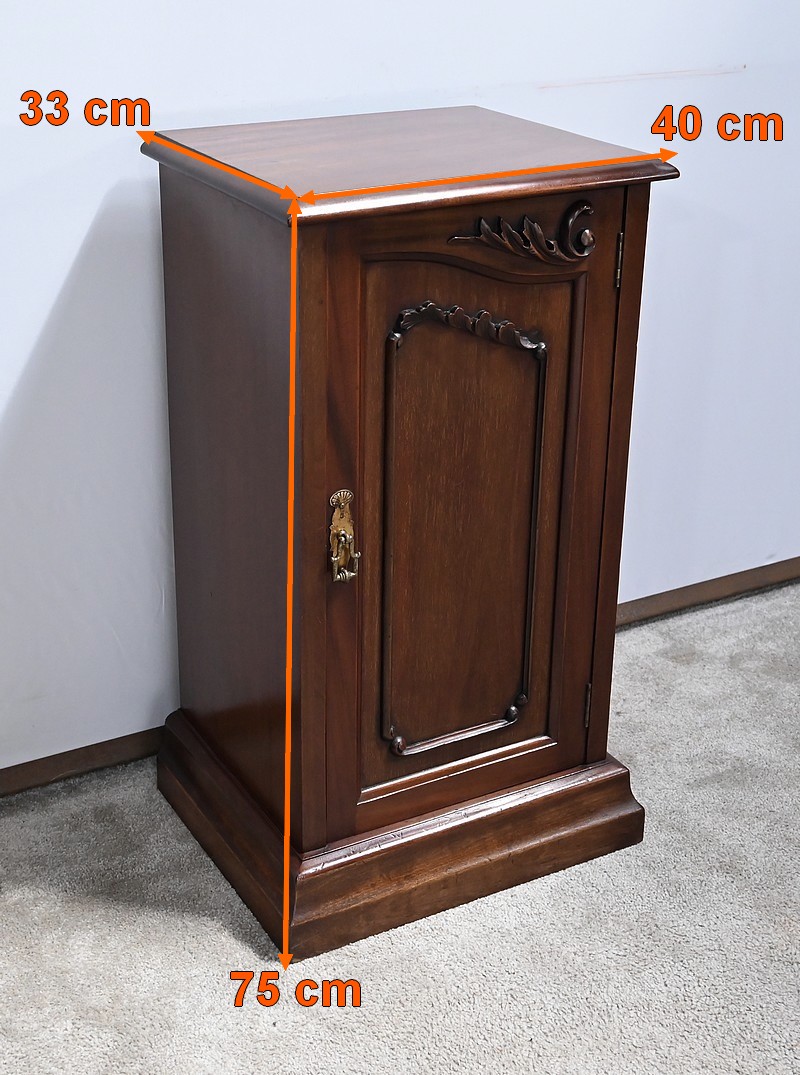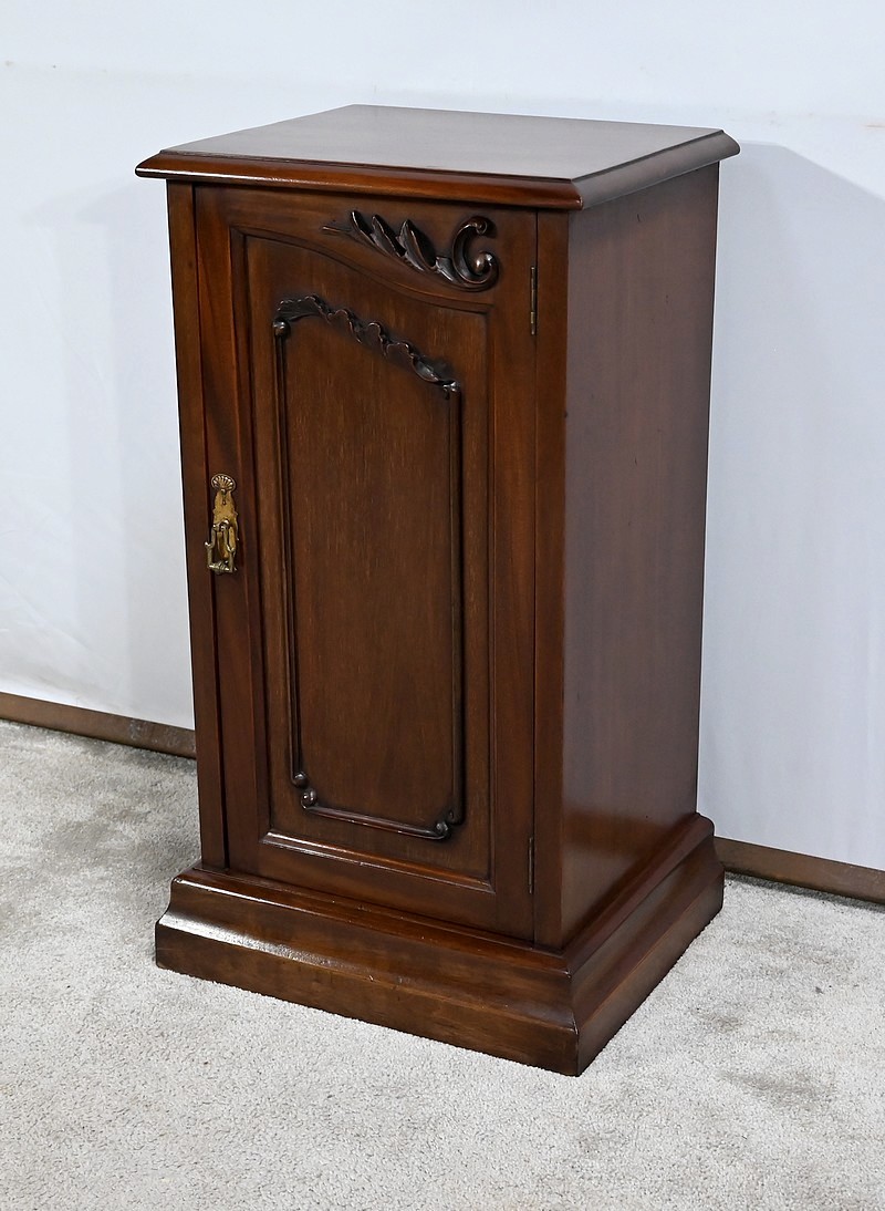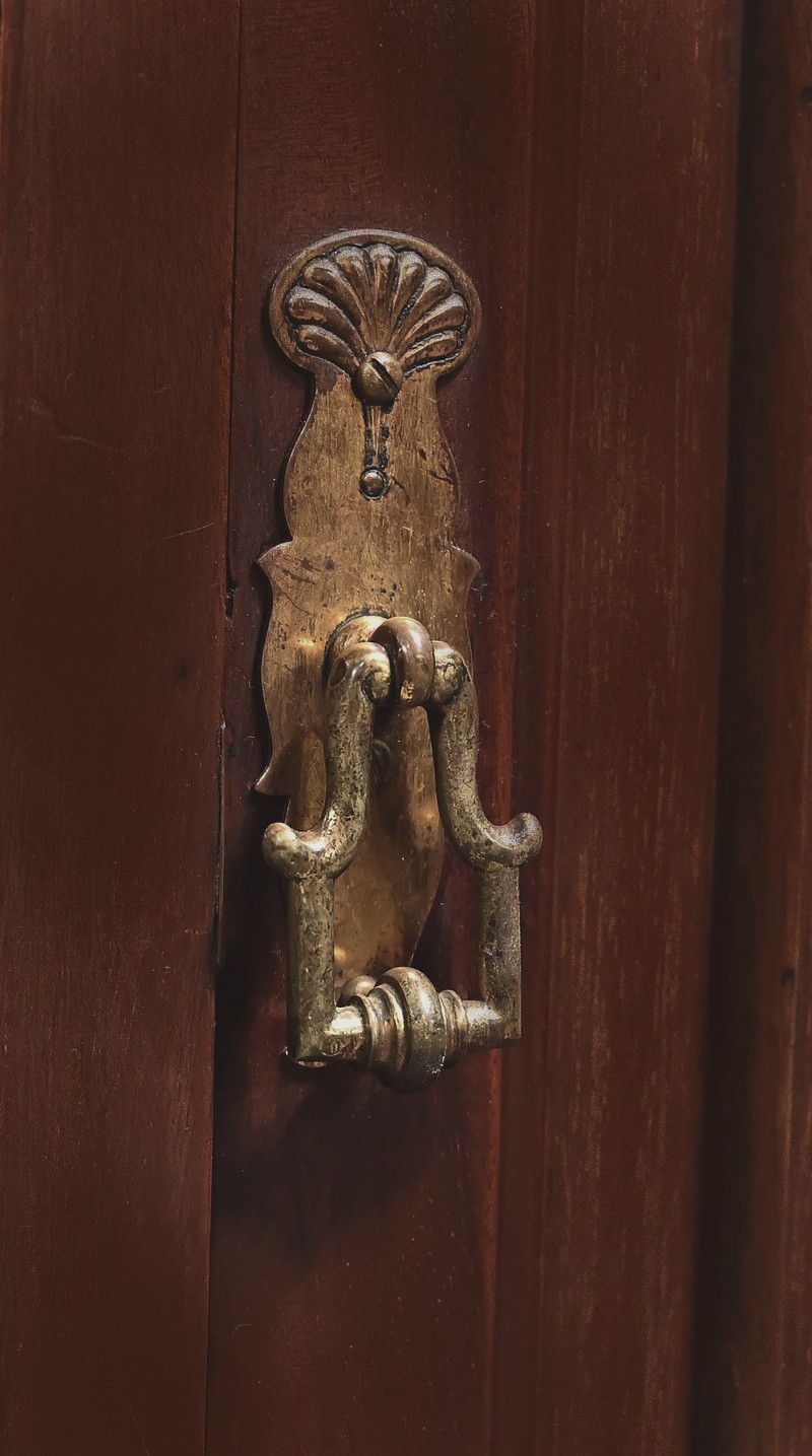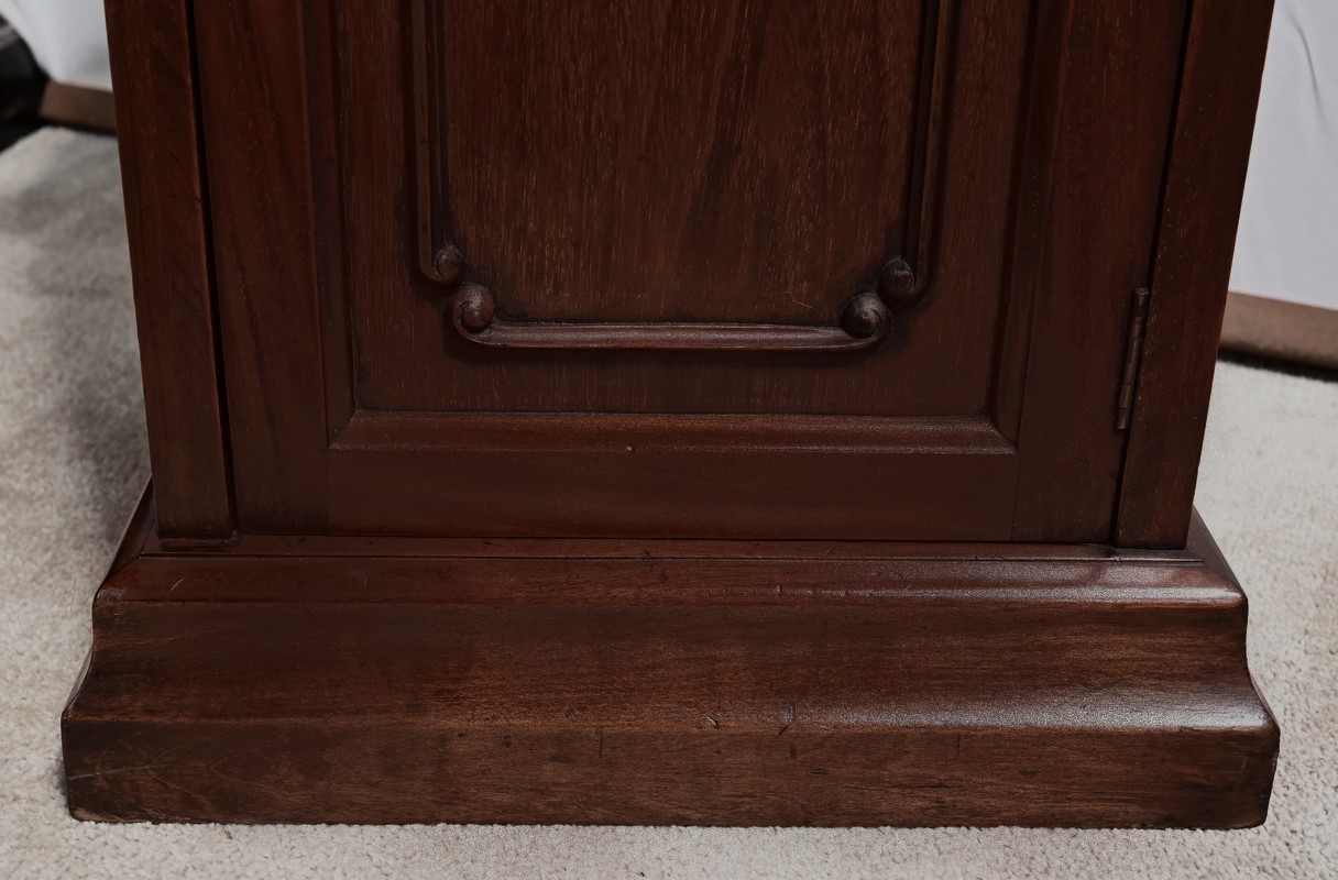 Meuble anglais en acajou massif constitué d’une porte à encadrement avec moulure intérieure entourant un panneau habillé d’une moulure en relief sculptée de feuilles. Le haut du panneau est habillé d’une moulure en saillie travaillée en volute sur la porte. Celle-ci pivote sur charnières en laiton et possède une poignée de tirage tombante avec coquille et se ferme grâce à un loqueteau.