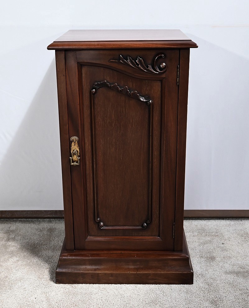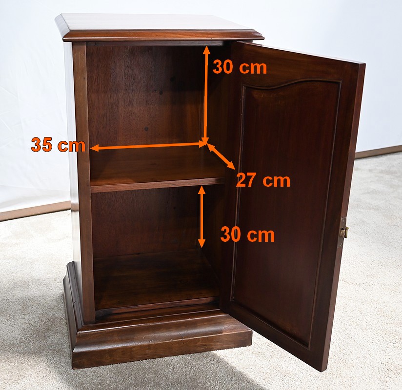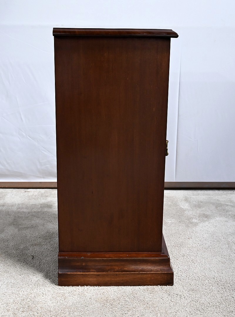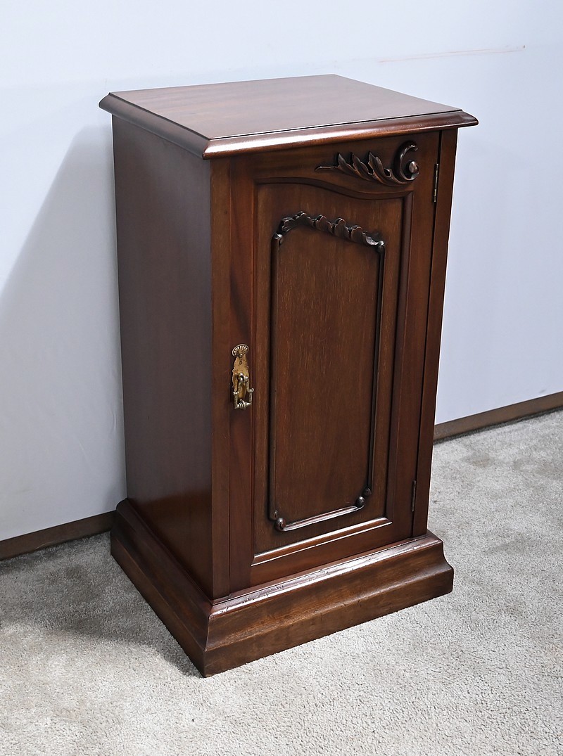 Meuble anglais en acajou massif constitué d’une porte à encadrement avec moulure intérieure entourant un panneau habillé d’une moulure en relief sculptée de feuilles. Le haut du panneau est habillé d’une moulure en saillie travaillée en volute sur la porte. Celle-ci pivote sur charnières en laiton et possède une poignée de tirage tombante avec coquille et se ferme grâce à un loqueteau.