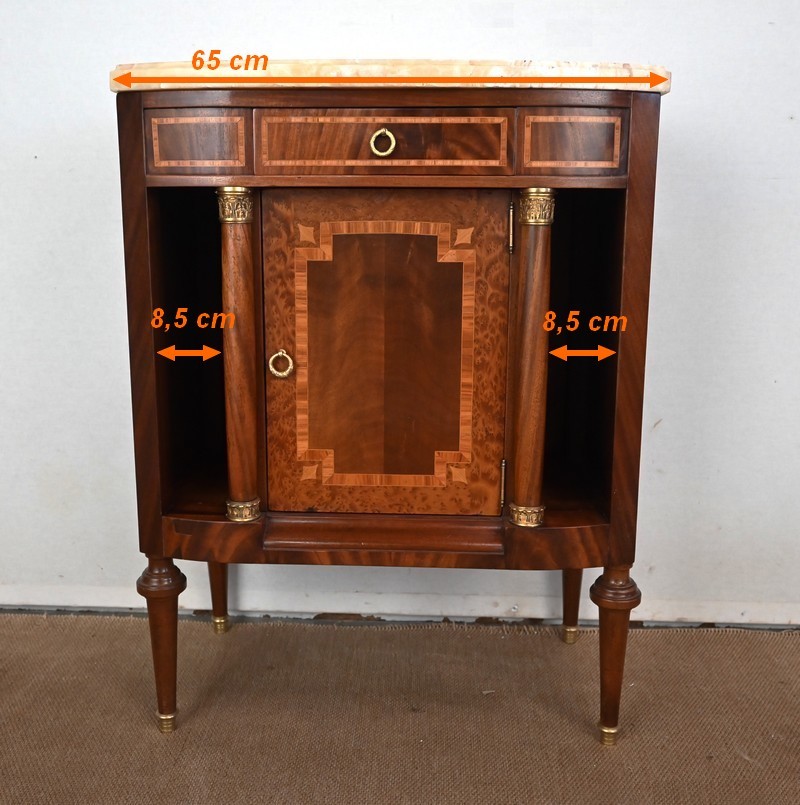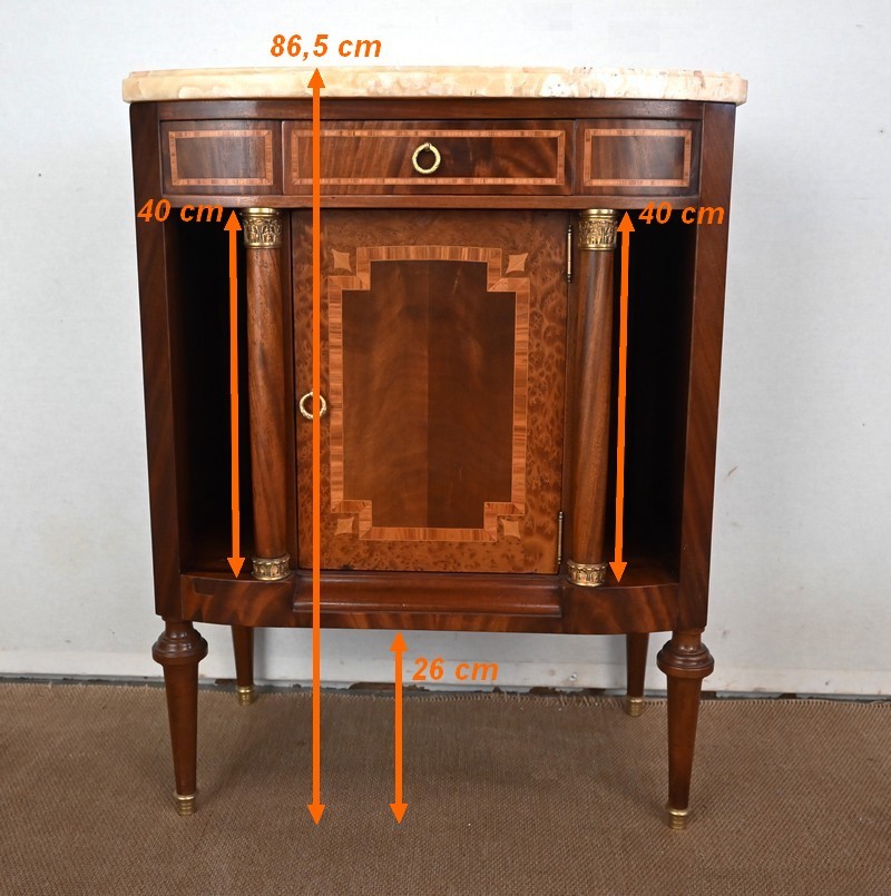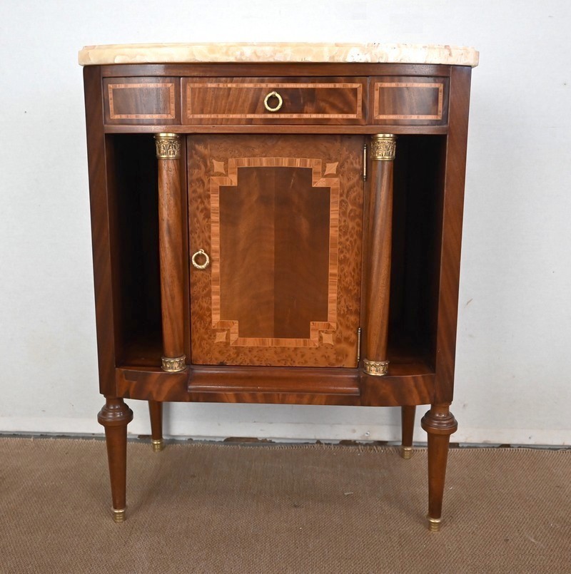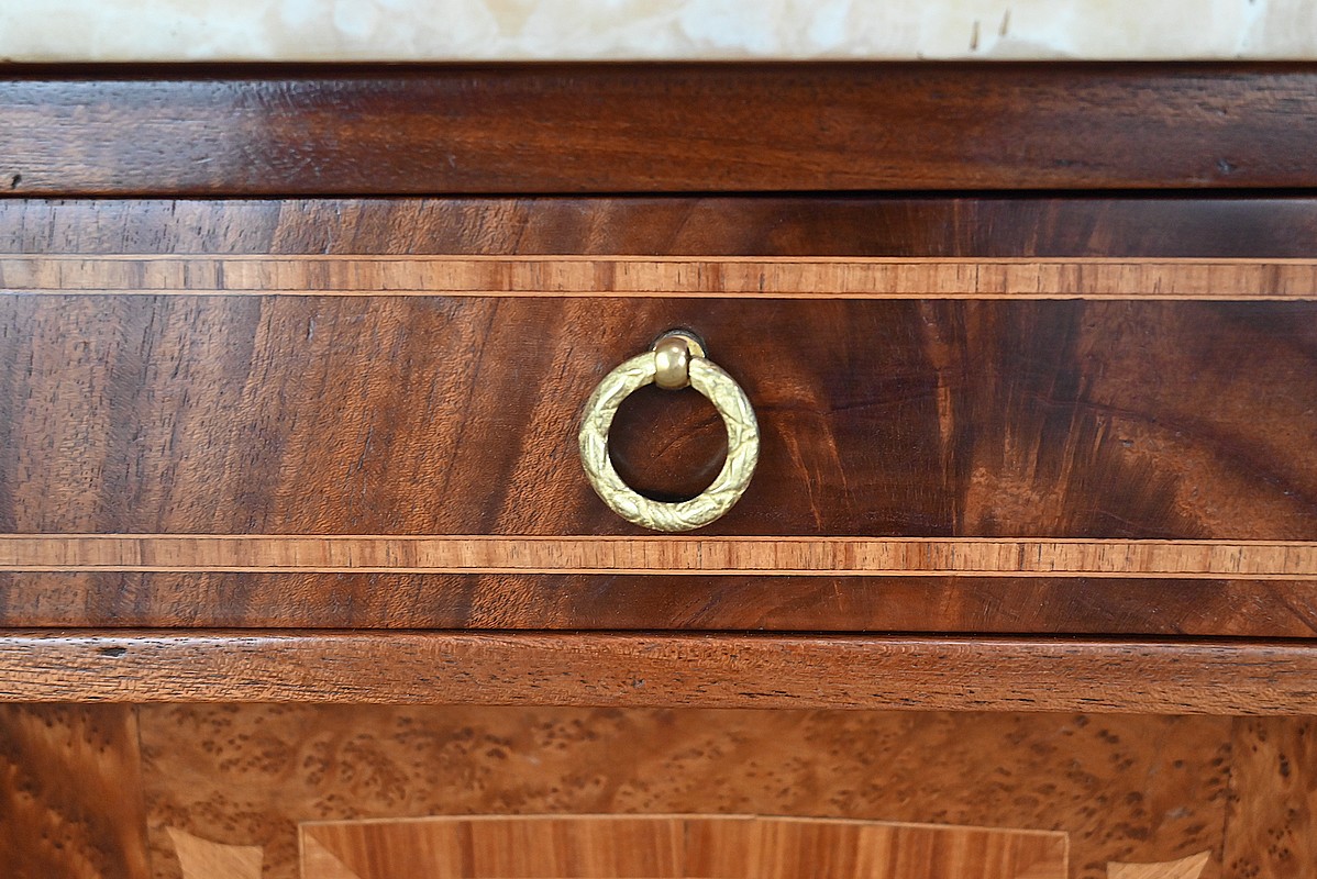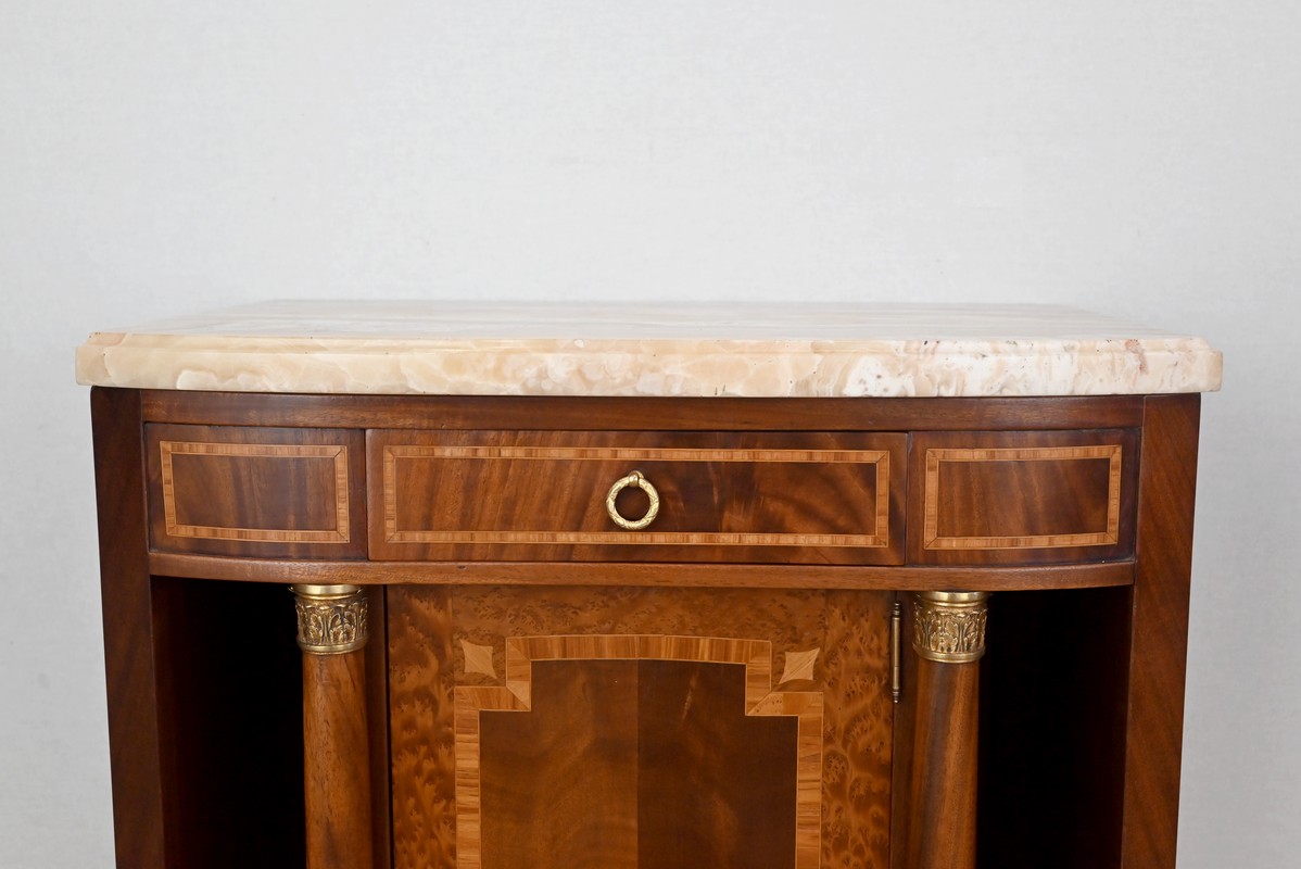 Petit meuble, à façade légèrement galbée, sommé d’un marbre épais à gorge.