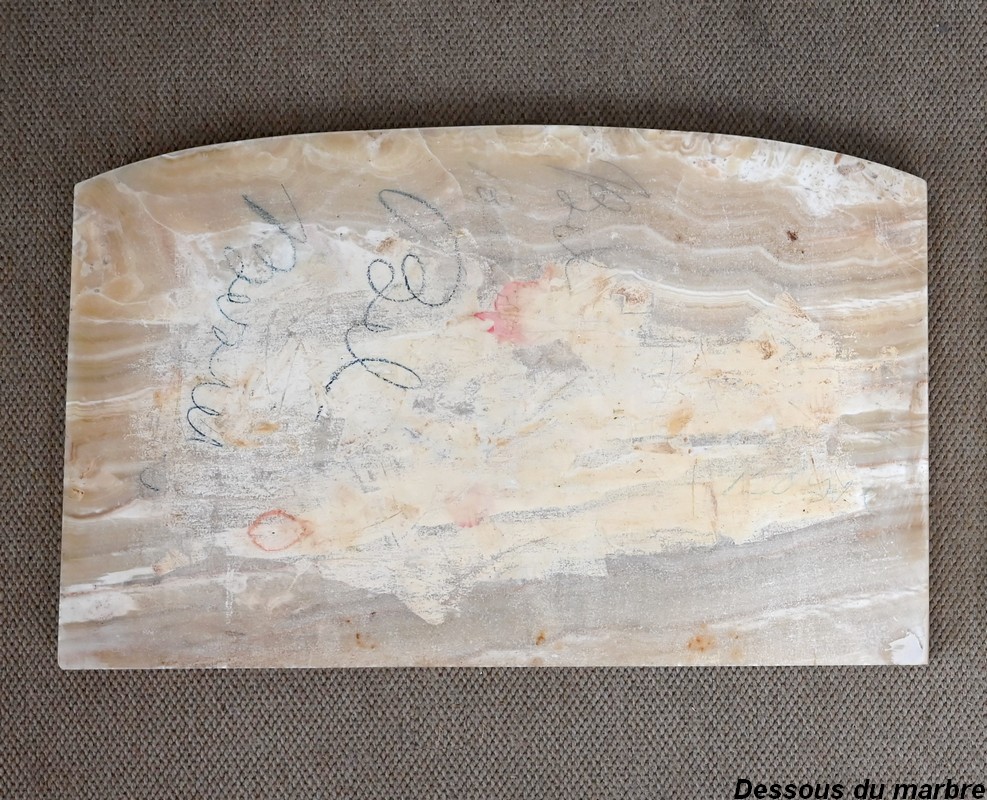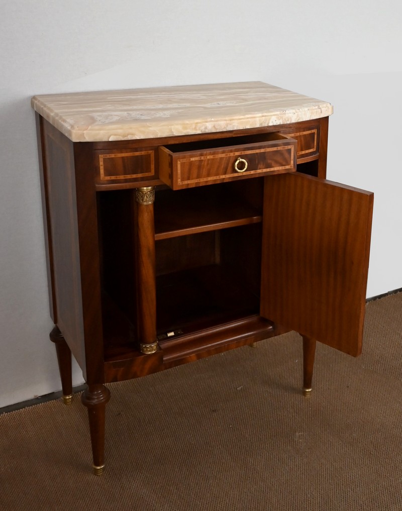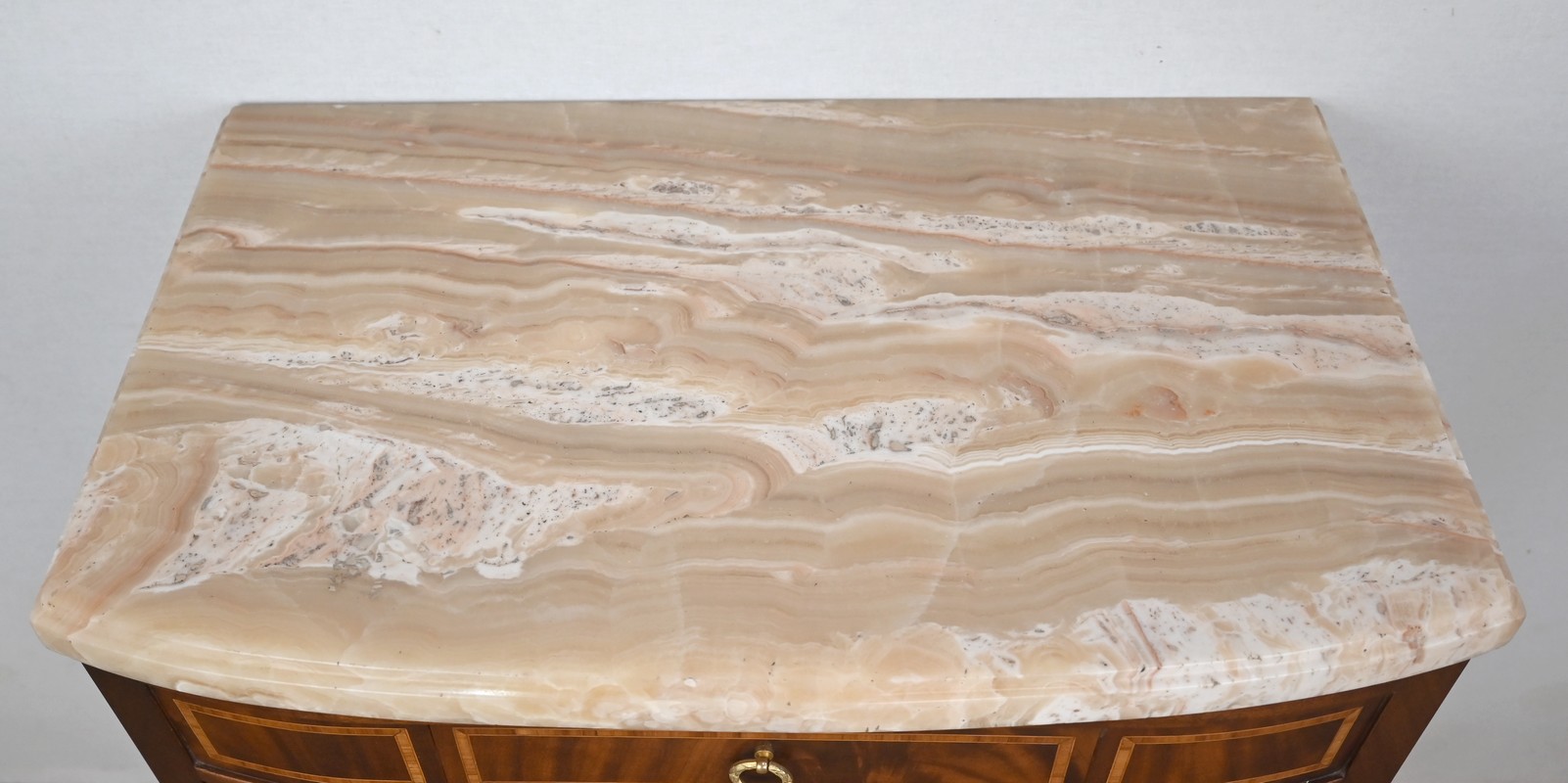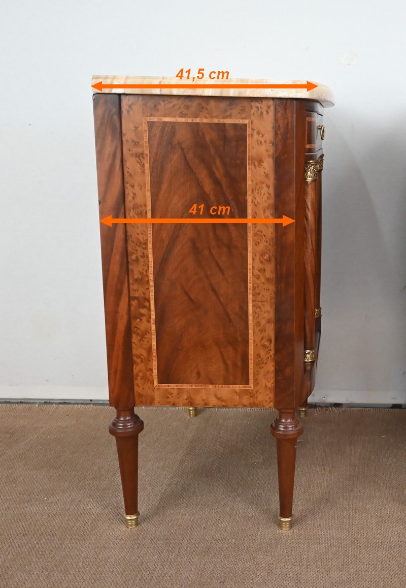 Petit meuble, à façade légèrement galbée, sommé d’un marbre épais à gorge.