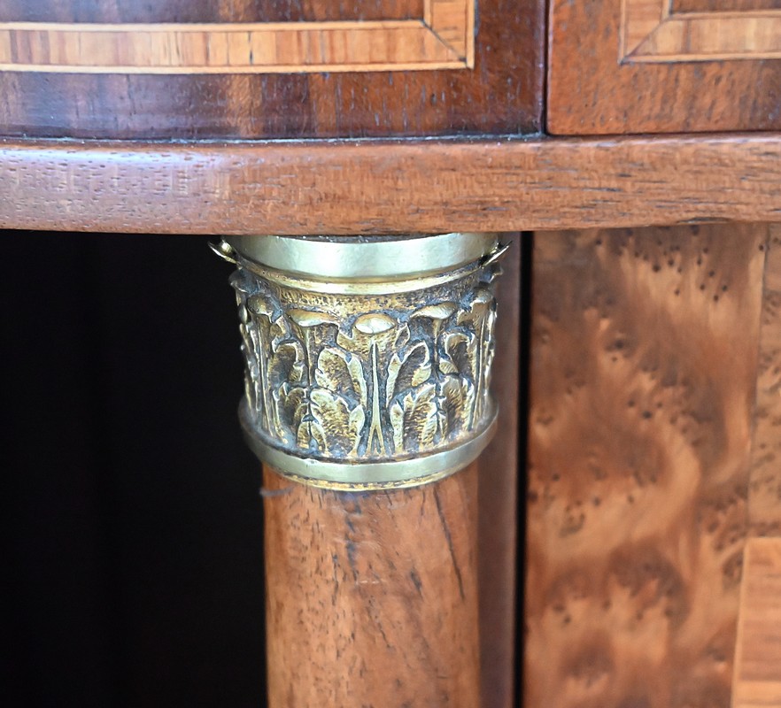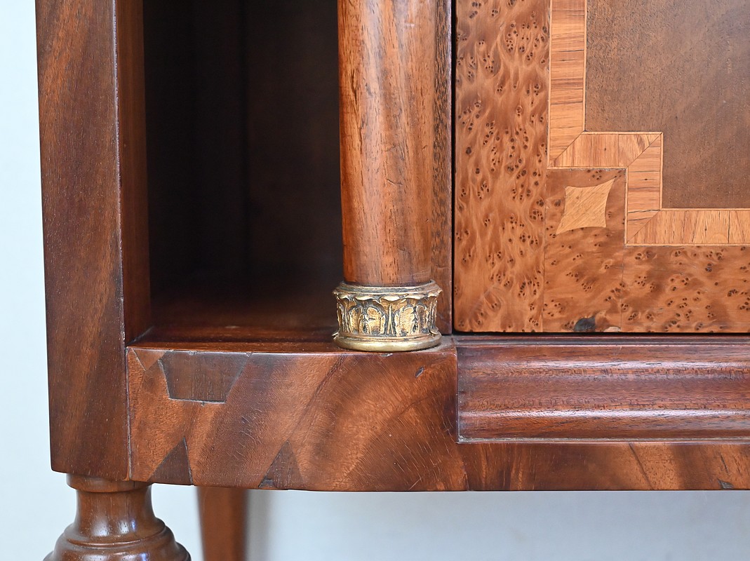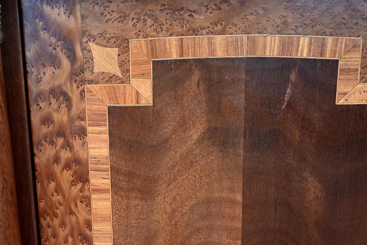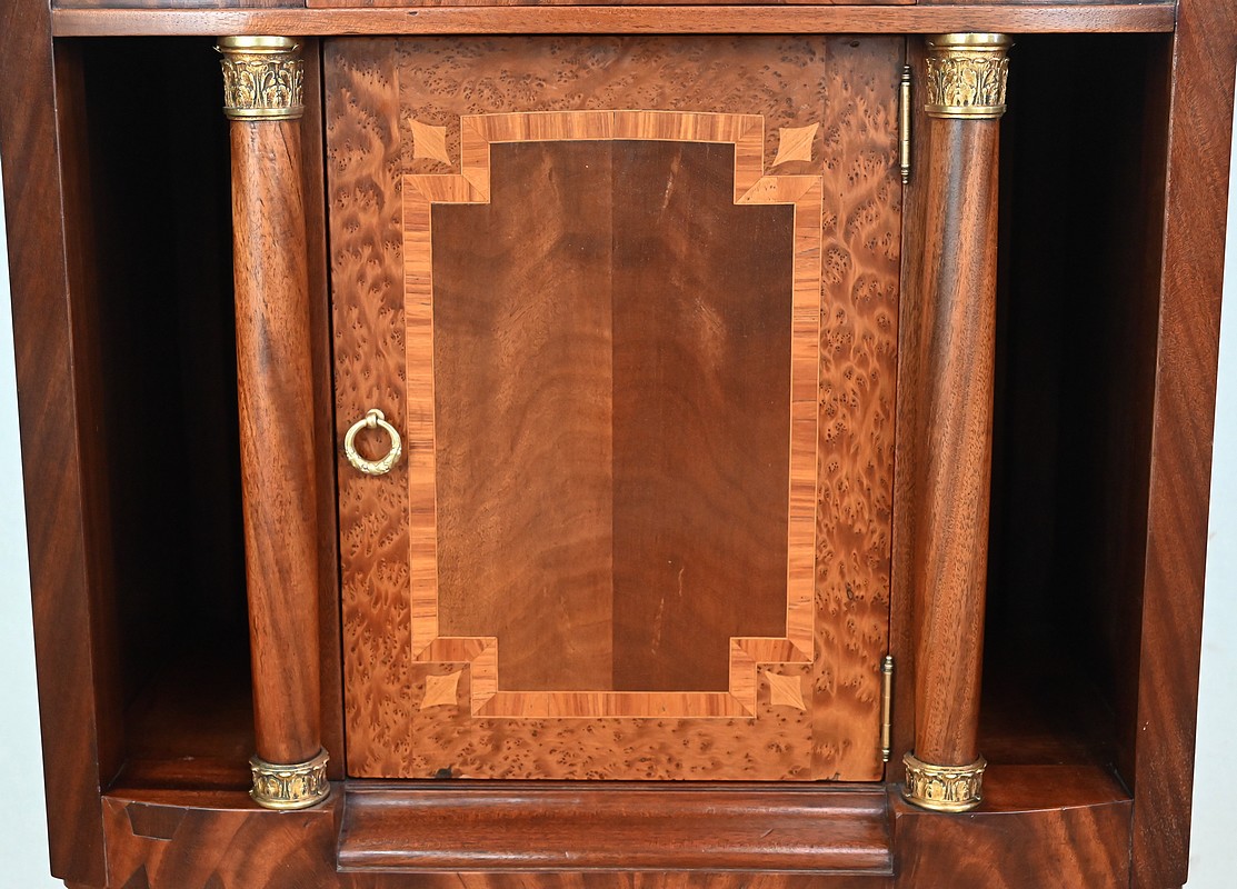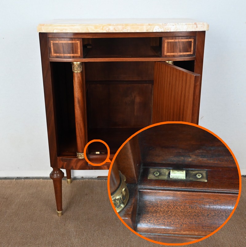 Il ouvre par une porte, sur pommelles laiton, marquetée en placage d’acajou souligné d’un filet de bois de rose et de buis. Son pourtour est en loupe de thuya. Un anneau ciselé en bronze permet le tirage.