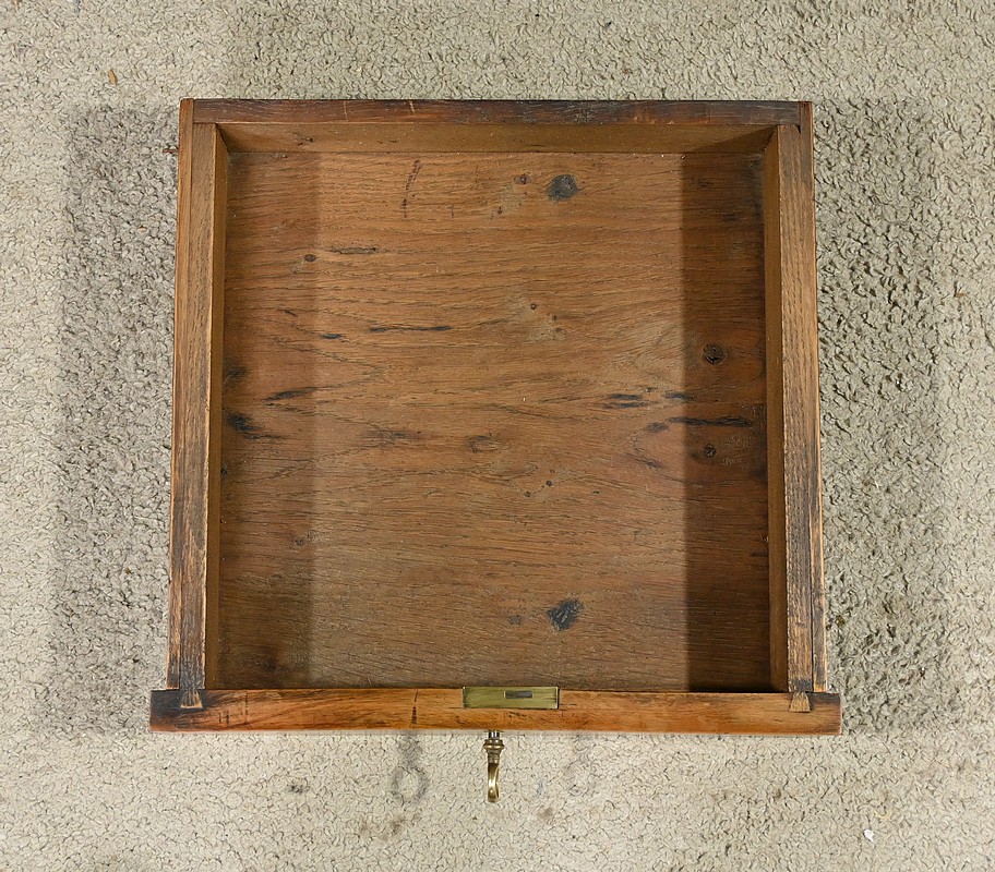Découvrez ce charmant petit meuble étagère daté des années 1900. Ce meuble intemporel et fonctionnel apportera une touche d’authenticité à votre intérieur. Fabriqué en noyer massif, ce meuble est composé de quatre niveaux, dont trois étagères ouvertes et un tiroir situé sous le plateau supérieur. Chaque coin du plateau supérieur est orné d’une boule en bois et les étagères sont soutenues par des colonnettes tournées en bois, qui confèrent au meuble une allure classique. Le tiroir est équipé d’une petite clé laiton accompagné de sa serrure fonctionnelle. Grâce à son design compact et polyvalent, il s’intégrera parfaitement dans divers espaces de votre maison, que ce soit dans un salon, une chambre ou un bureau.