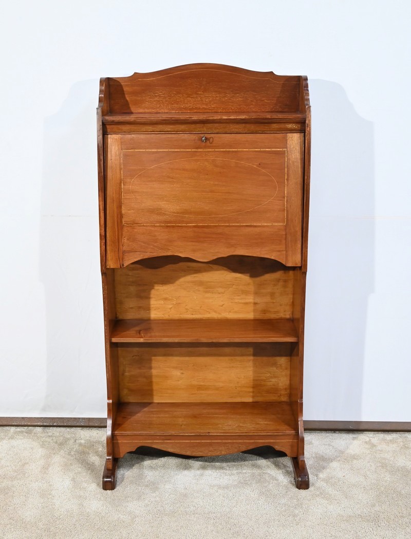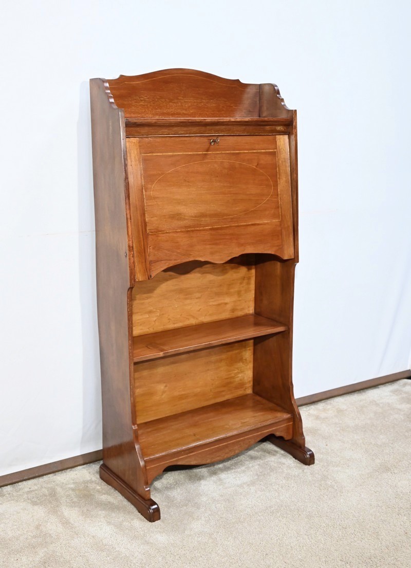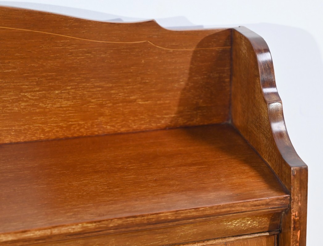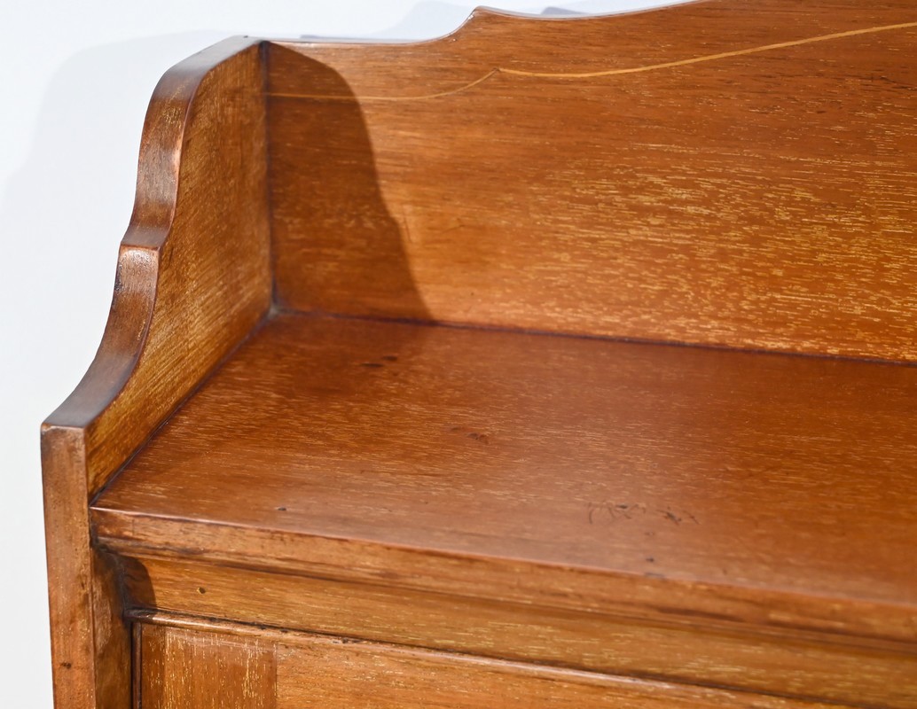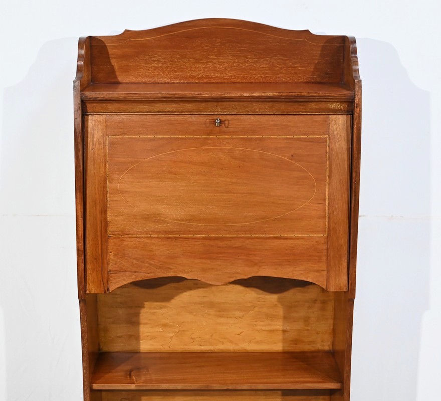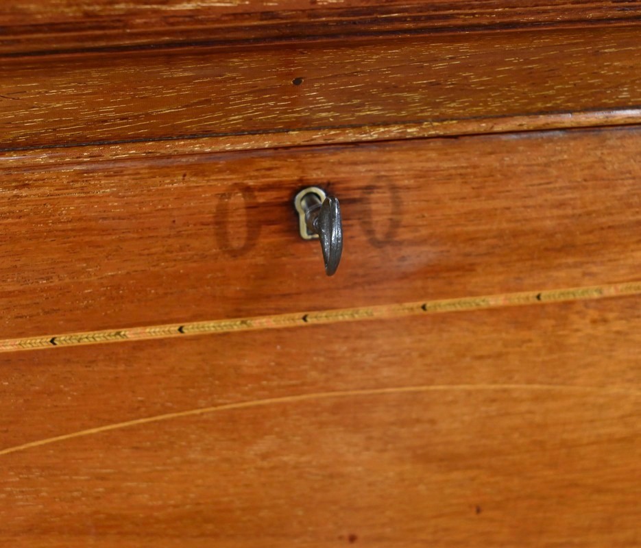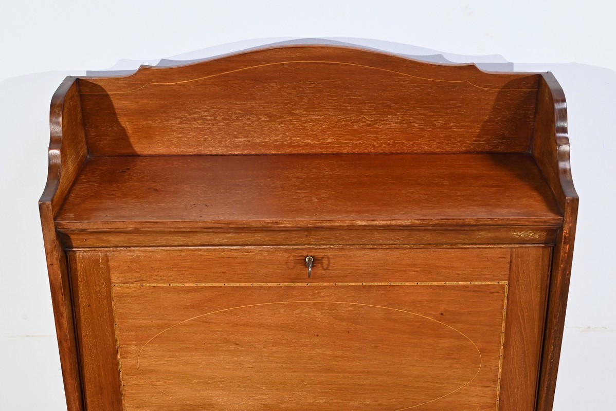 Ce meuble en acajou massif ouvre par un abattant dont la façade présente des incrustations de bois clair.