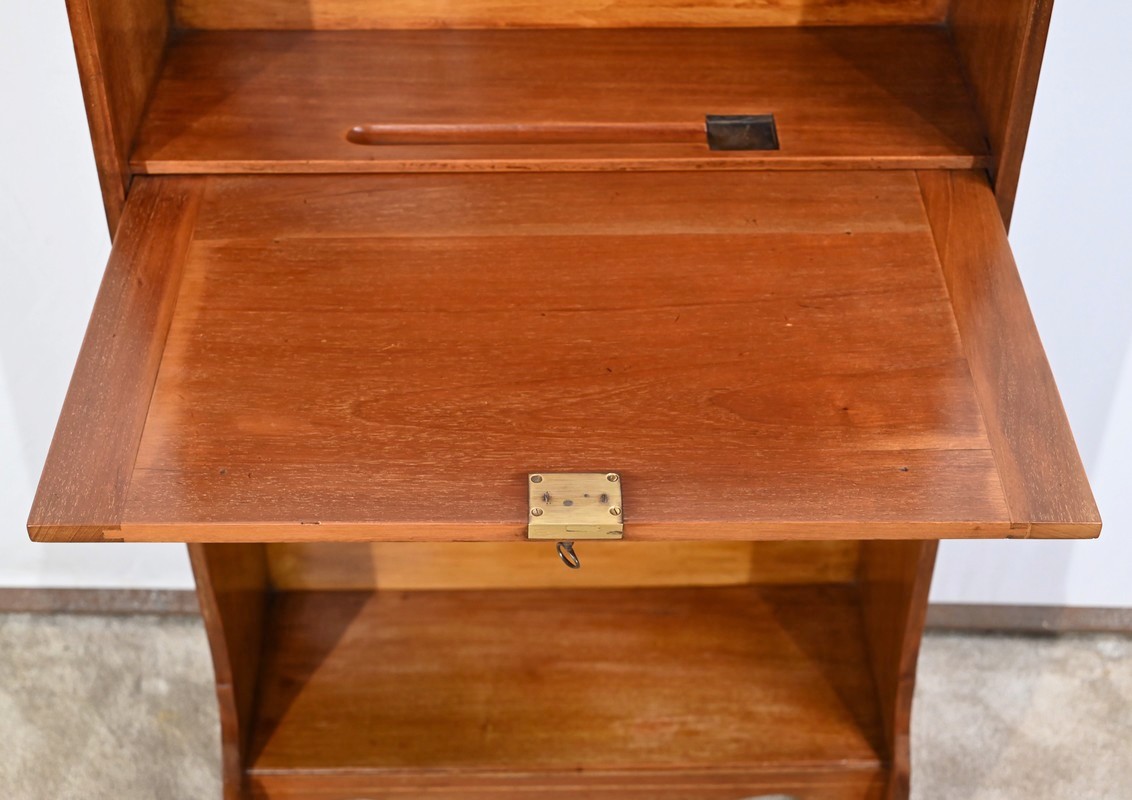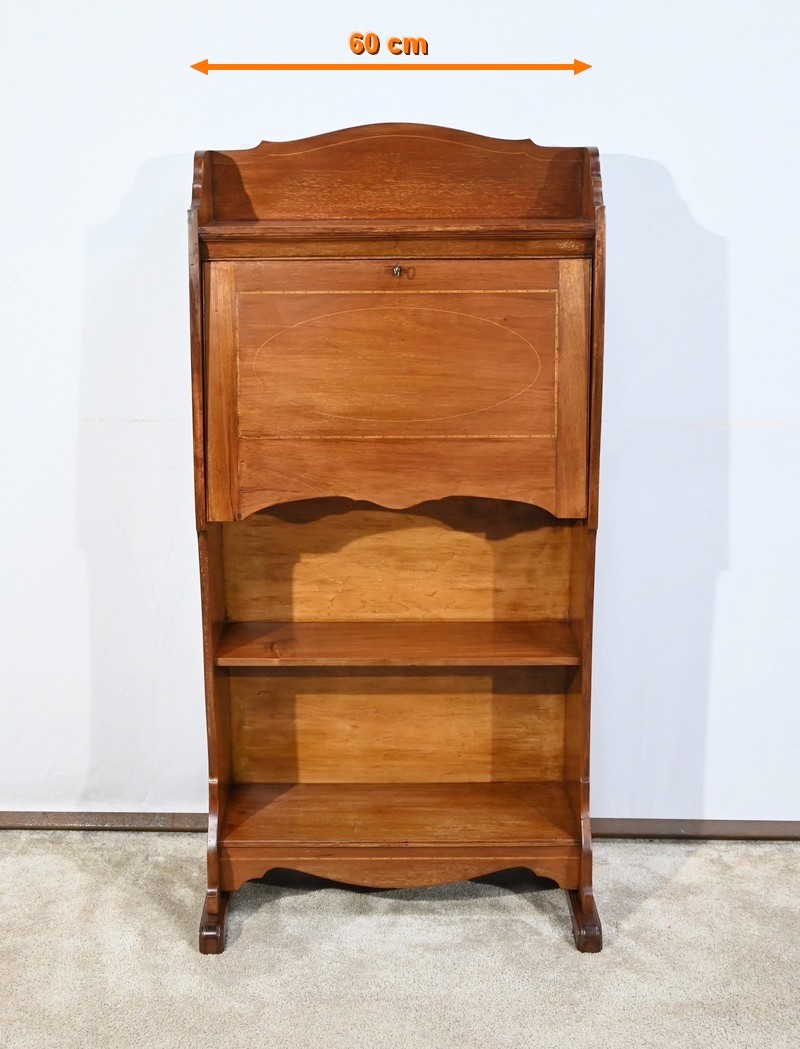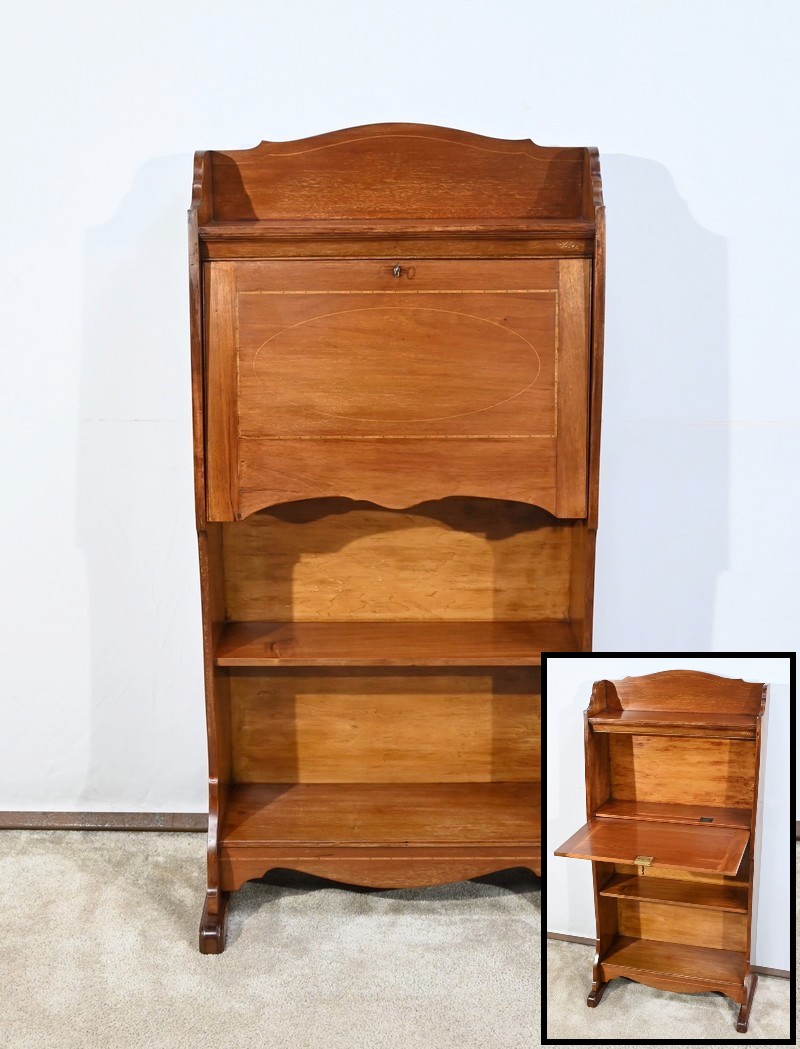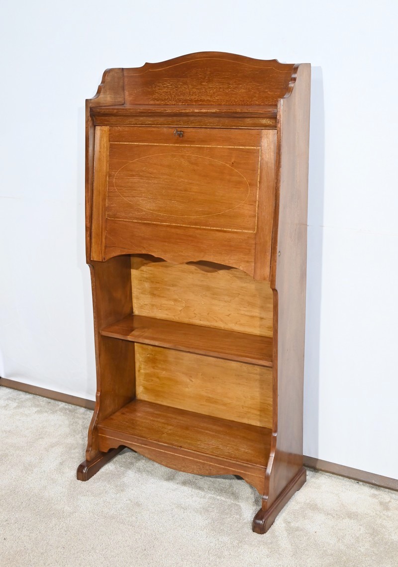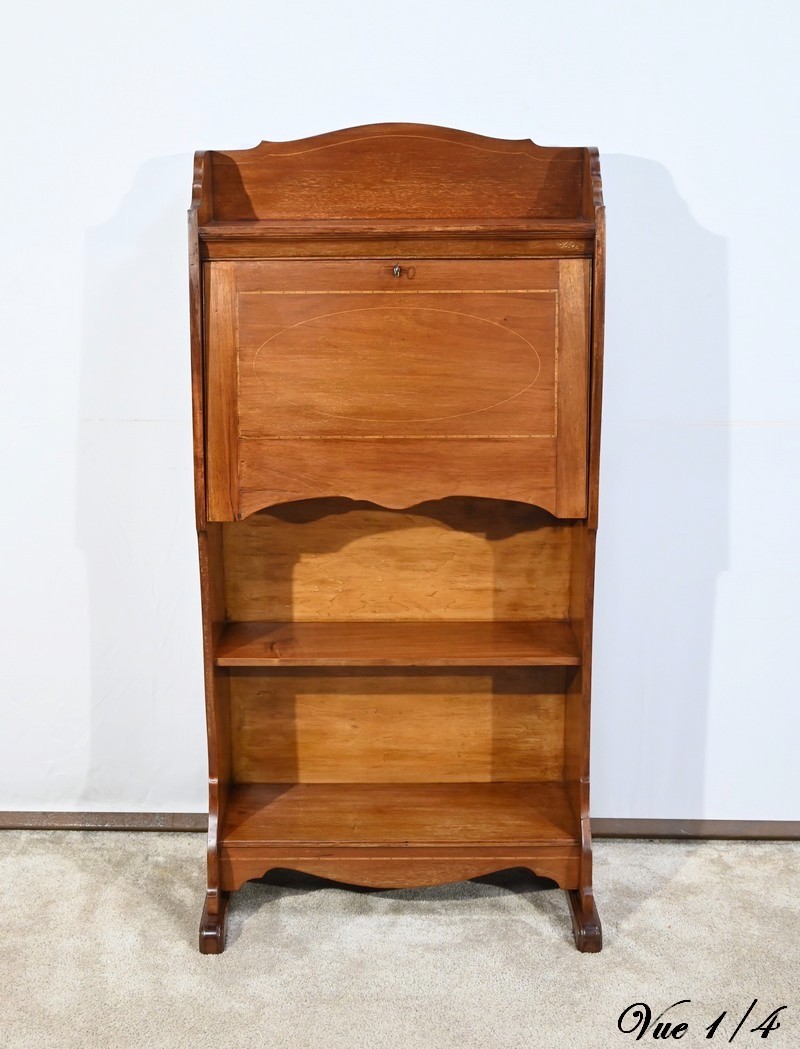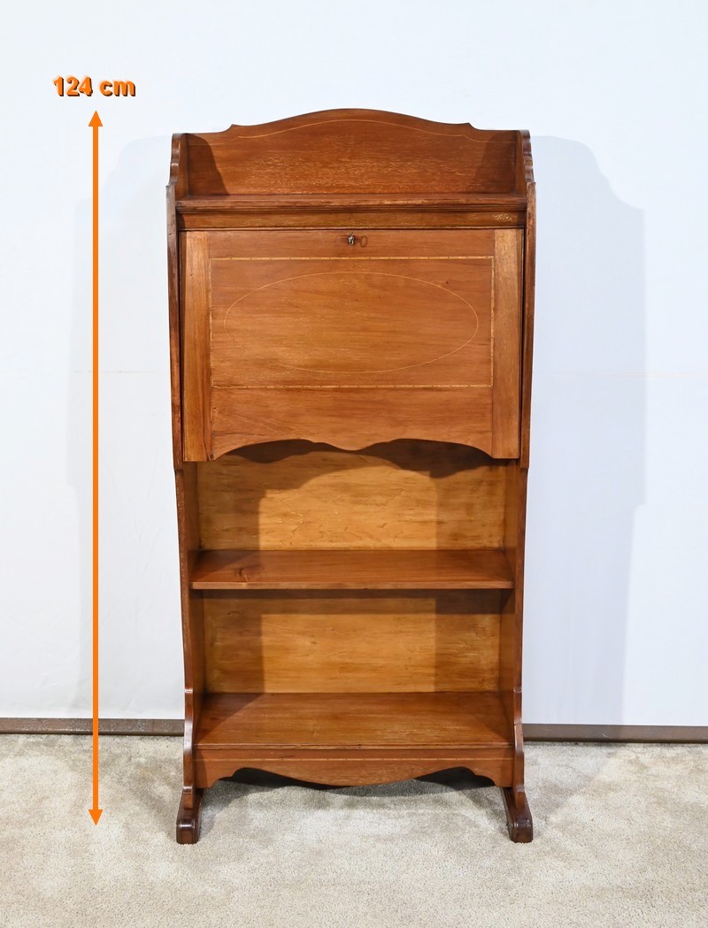 Ce meuble en acajou massif ouvre par un abattant dont la façade présente des incrustations de bois clair.