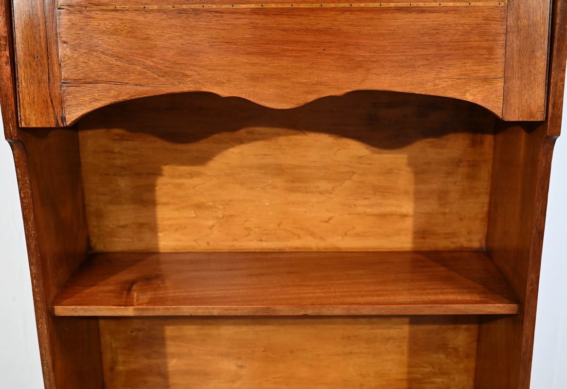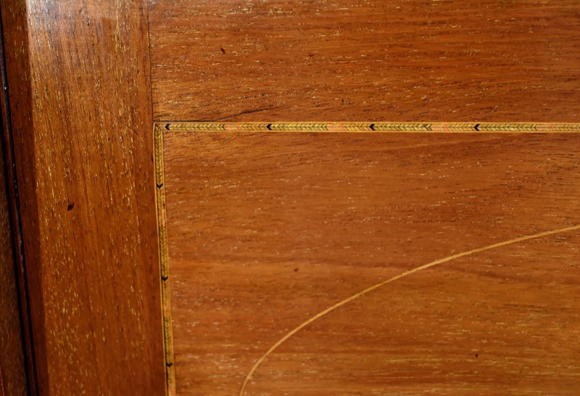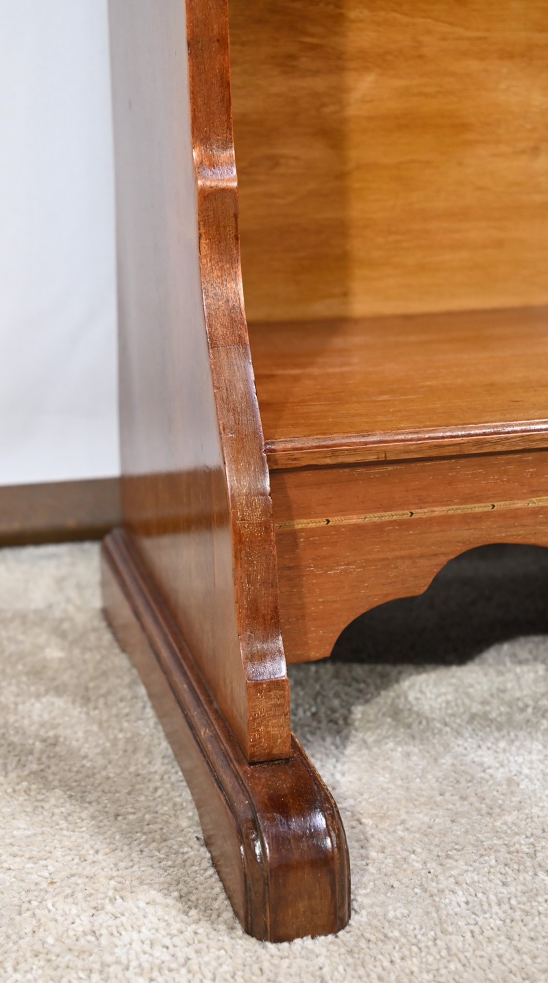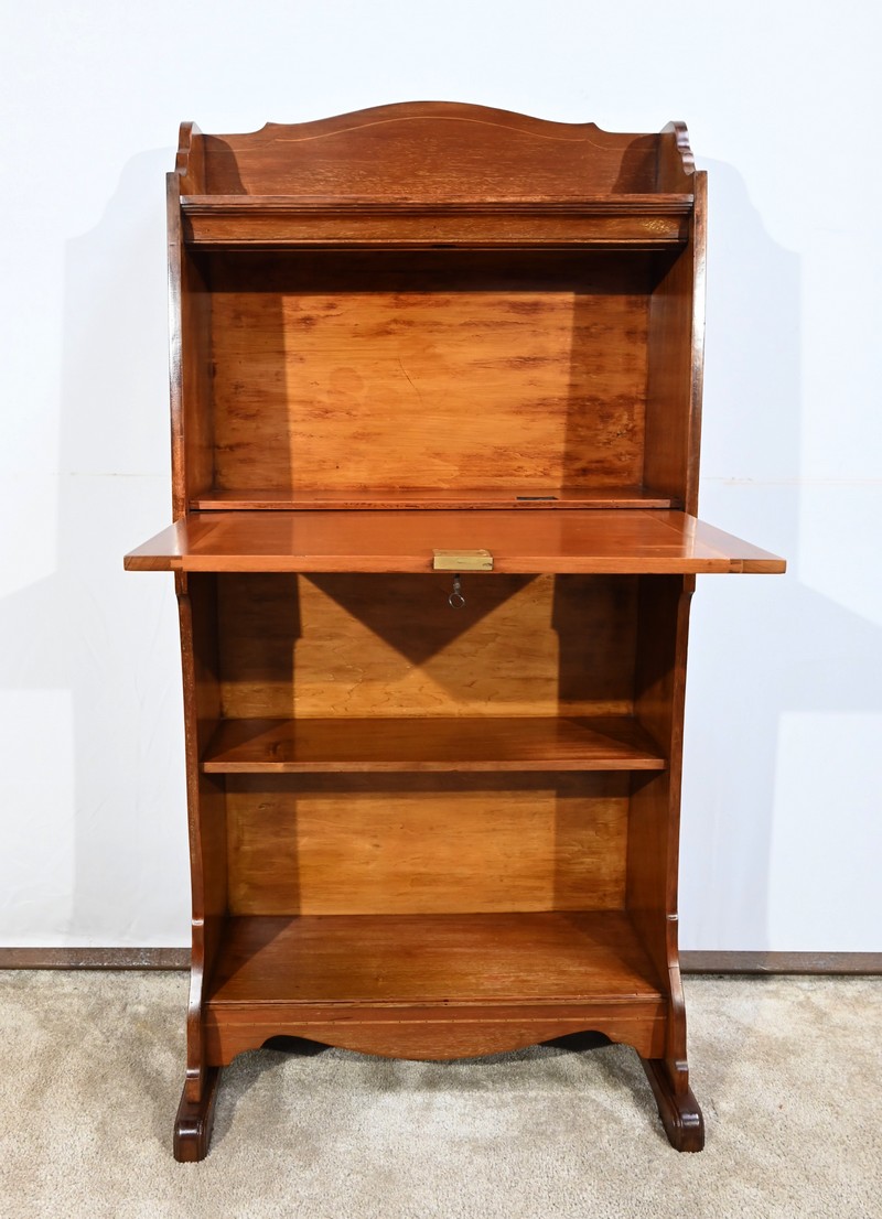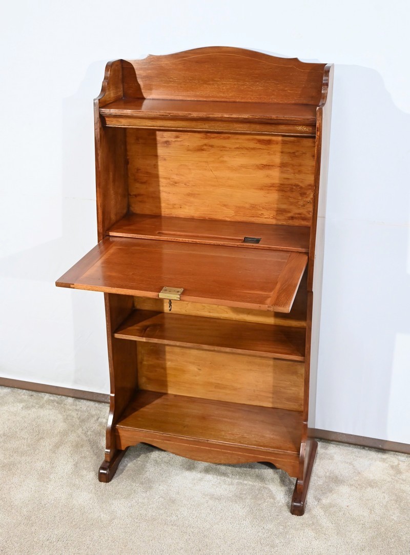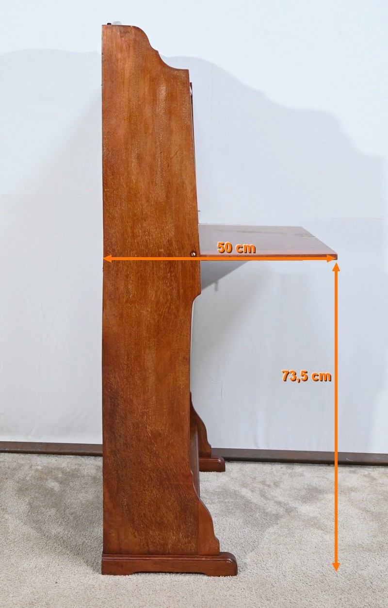 Ce meuble en acajou massif ouvre par un abattant dont la façade présente des incrustations de bois clair.