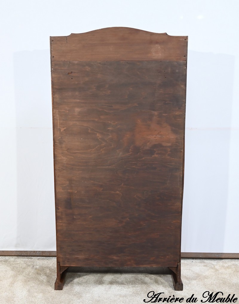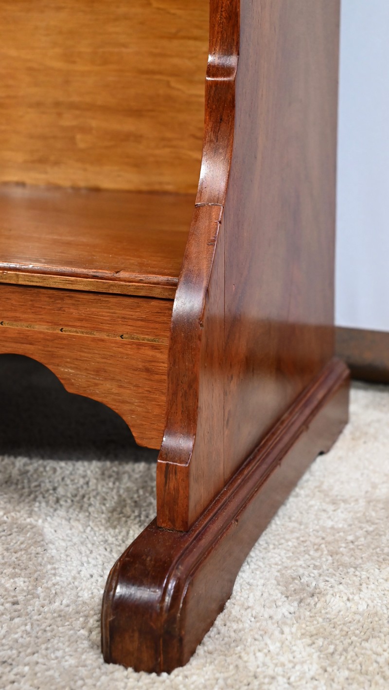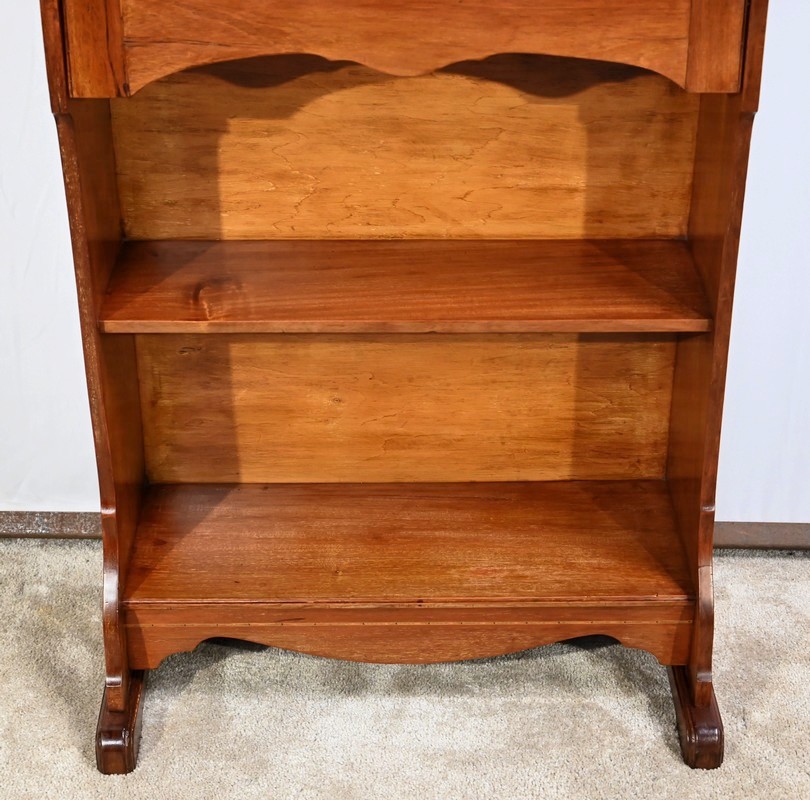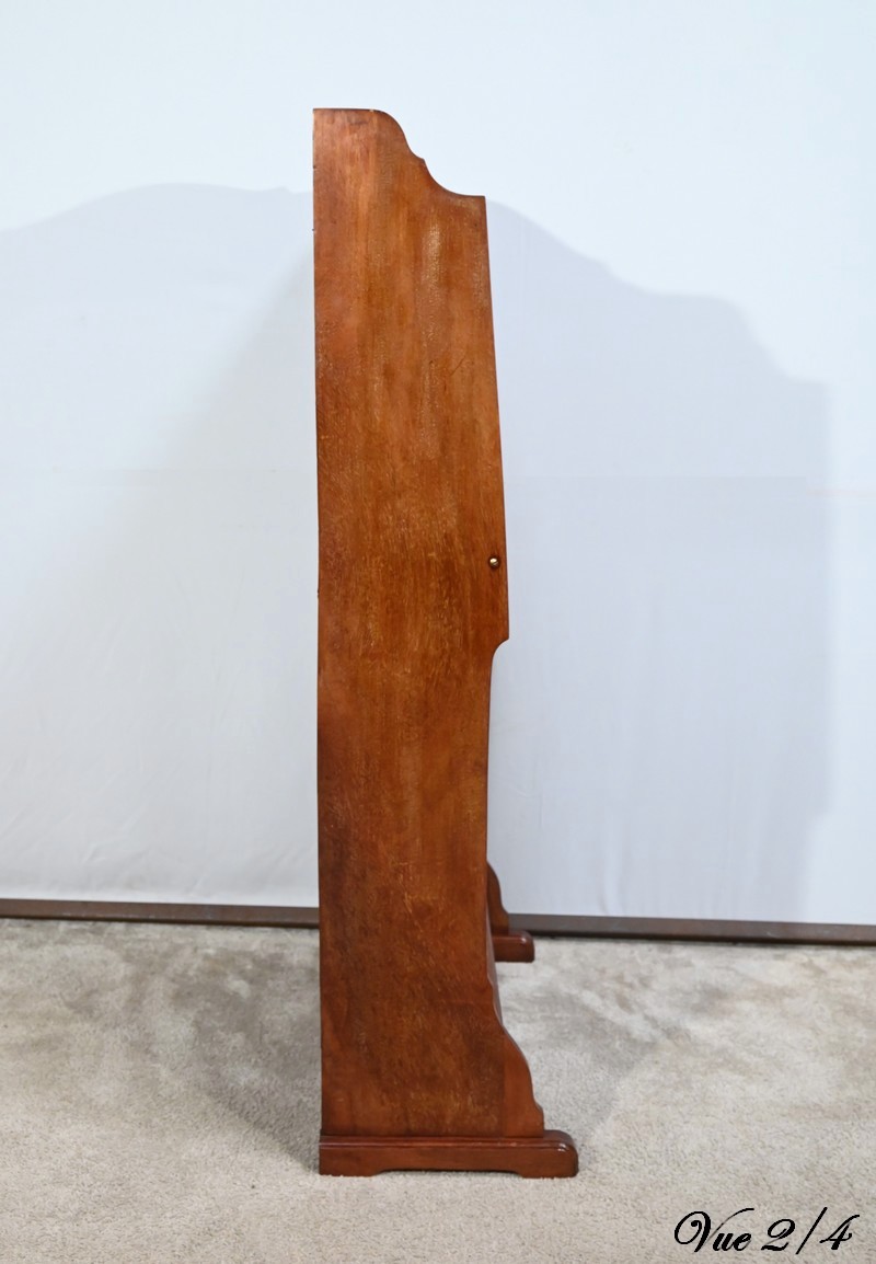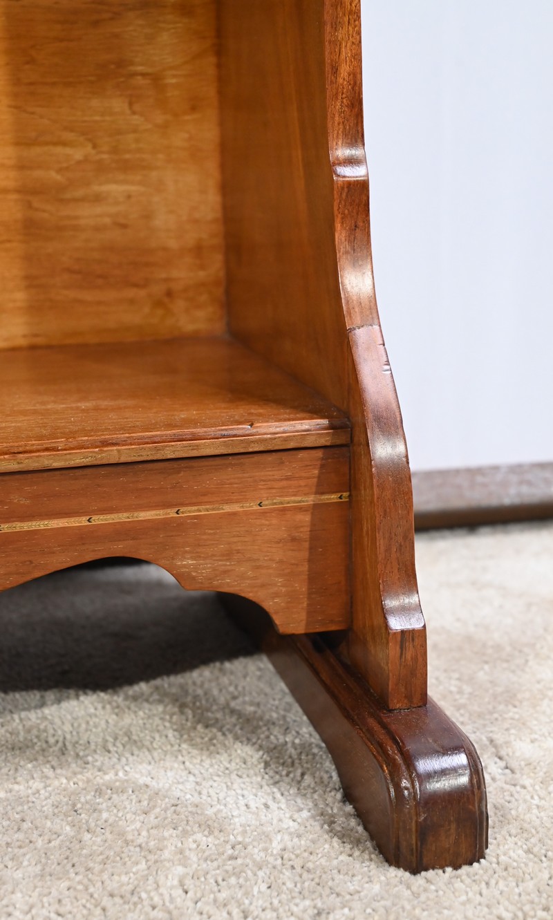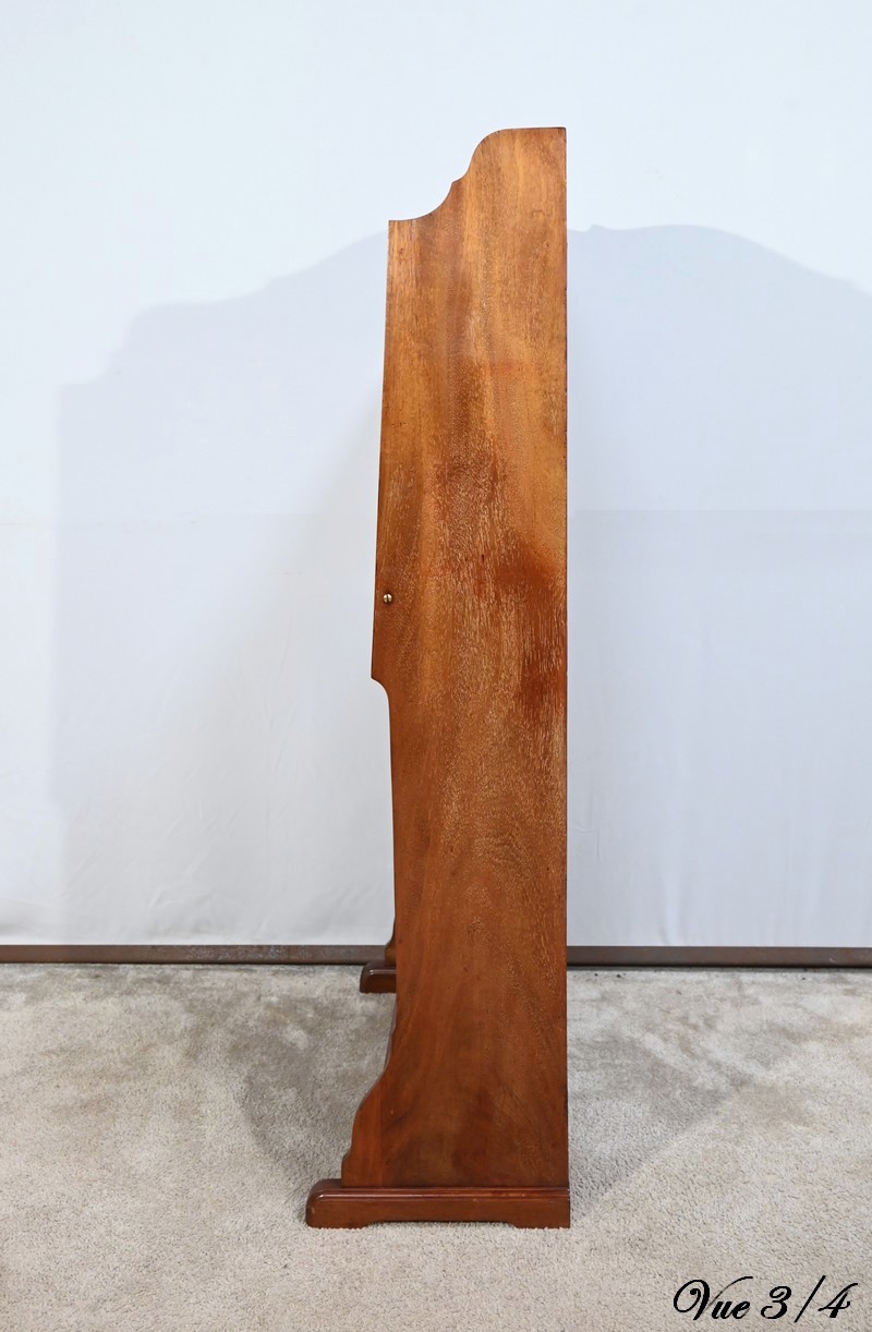 Ce meuble en acajou massif ouvre par un abattant dont la façade présente des incrustations de bois clair.