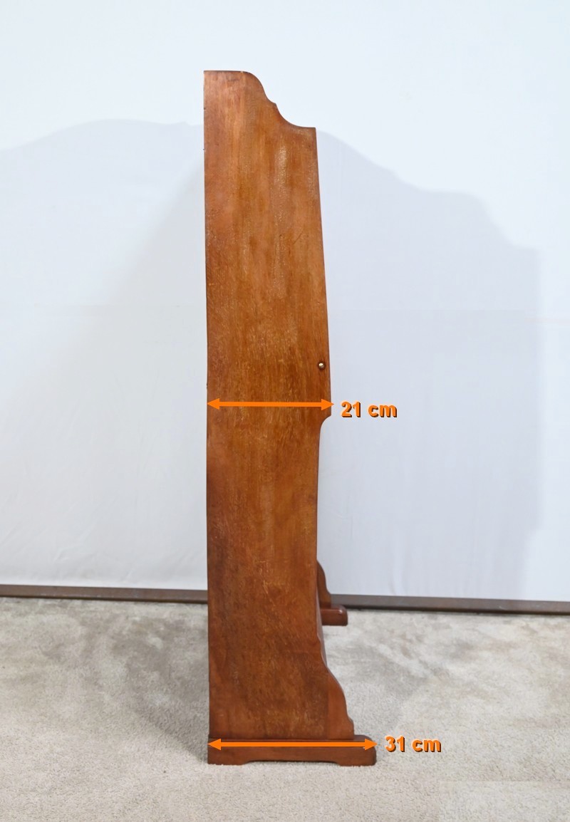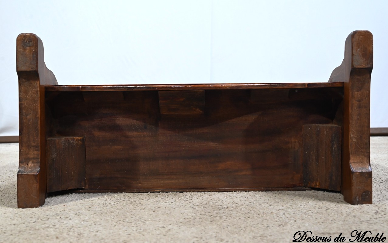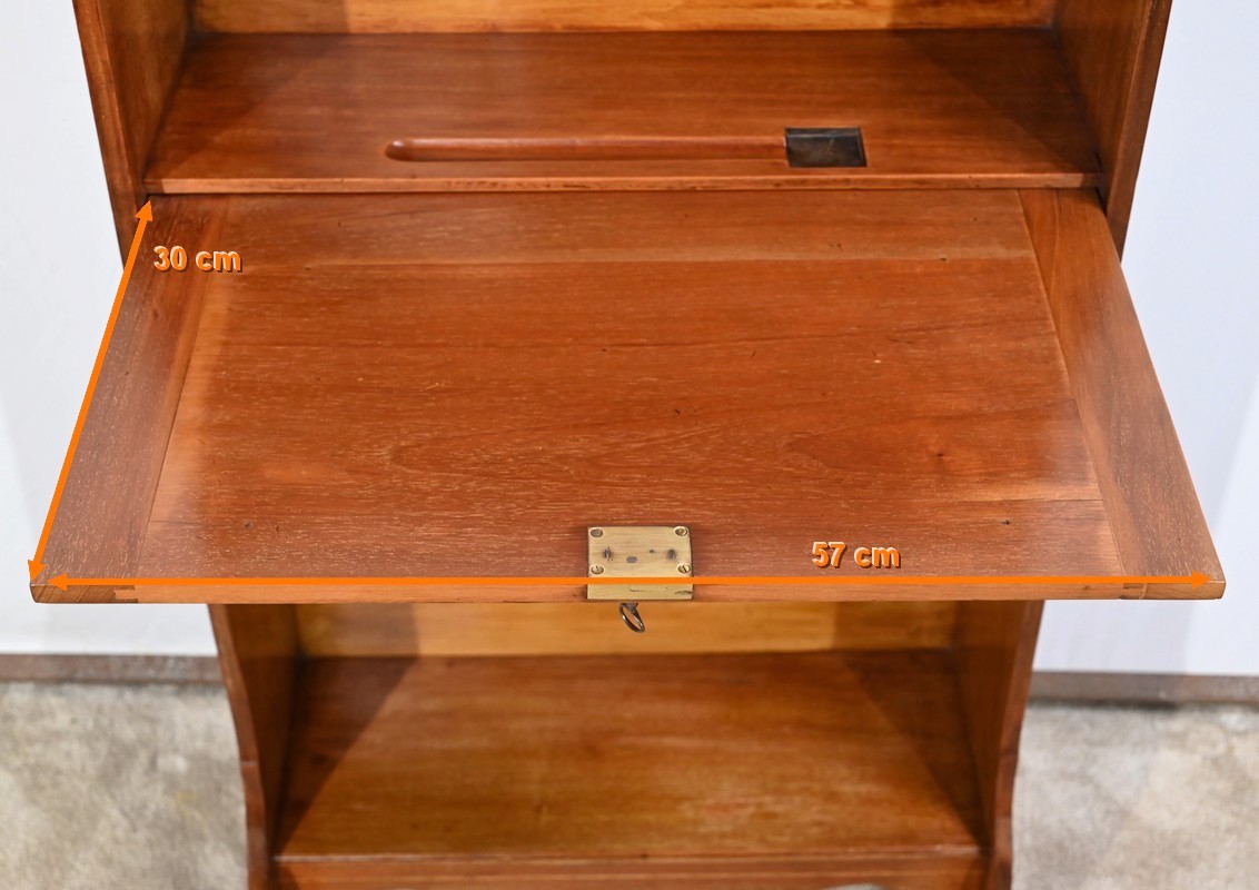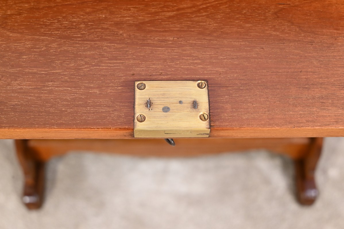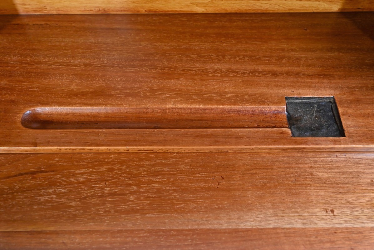 Cet abattant, muni d’une serrure d’origine fonctionnelle avec sa clé, dévoile, une fois ouvert, une surface de travail, un espace avec une cavité repose-plume et un emplacement pour y placer un petit encrier (non inclus).