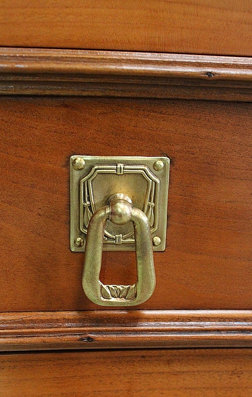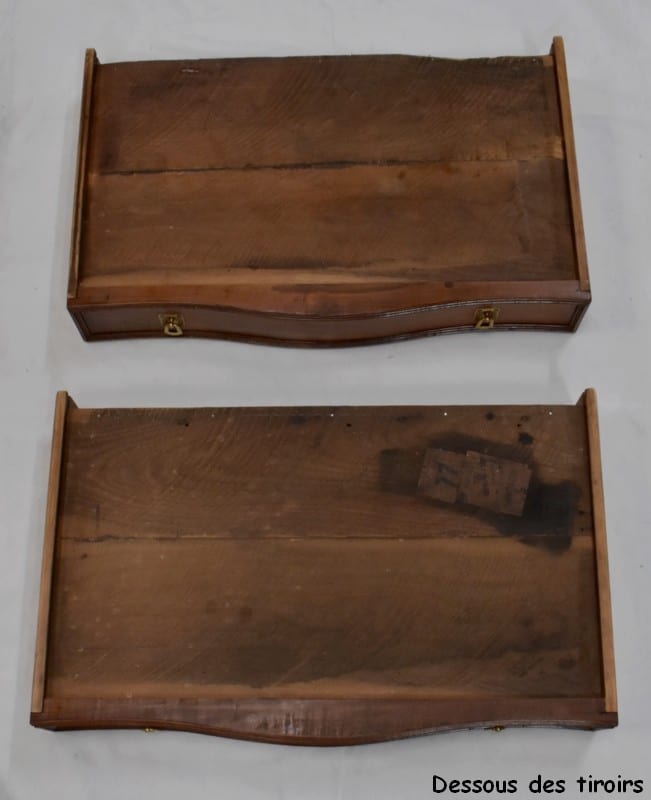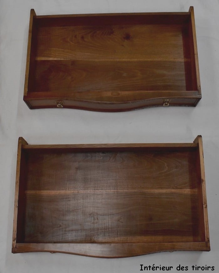 Elle ouvre par deux tiroirs aux façades Joliment Ondulées et soulignées par des baguettes moulurées formant encadrements. Chaque tiroir est garni de deux petites poignées de tirage en Laiton, esprit 1920.