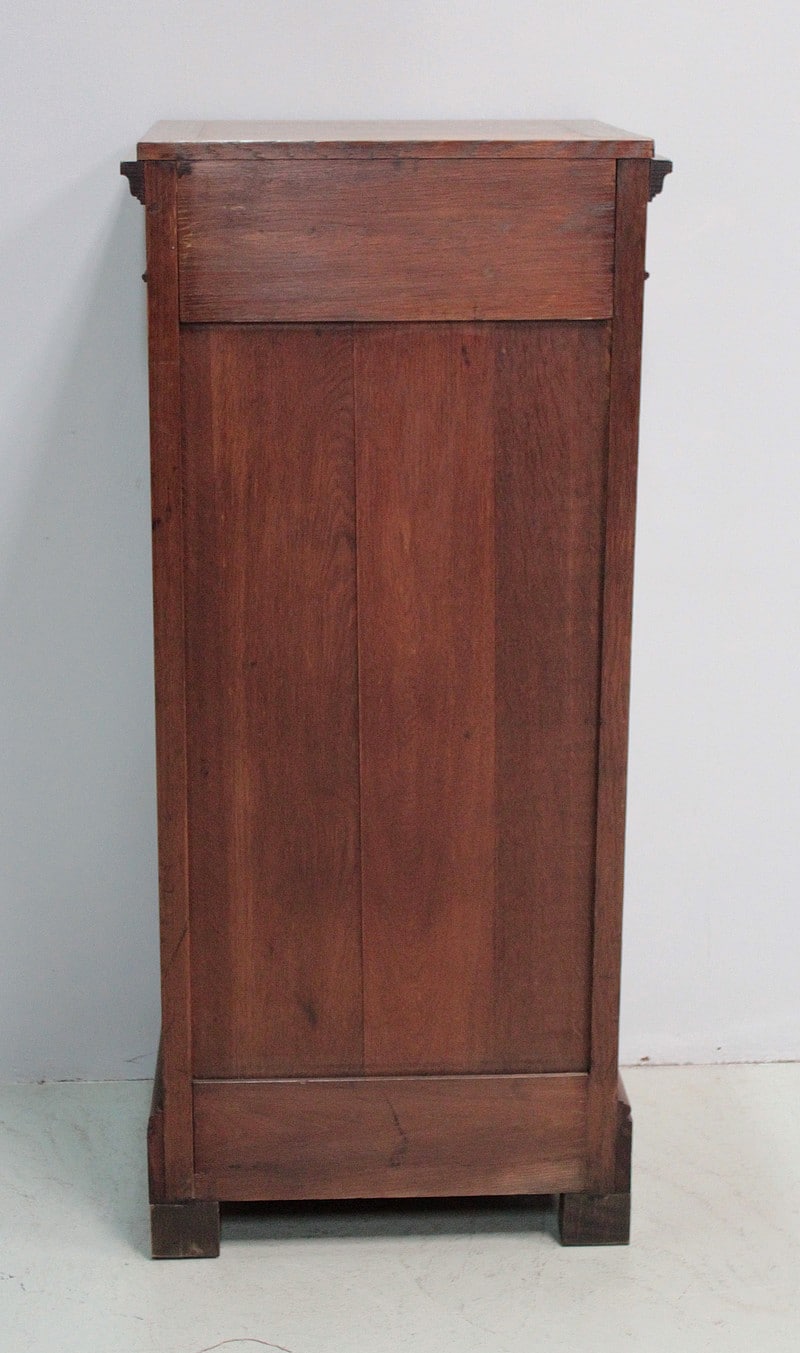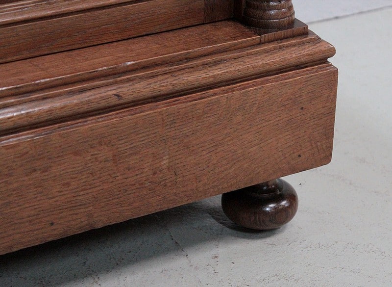 Le devant est orné de deux demi-colonnes tournées cannelées de part et d’autre de la porte.