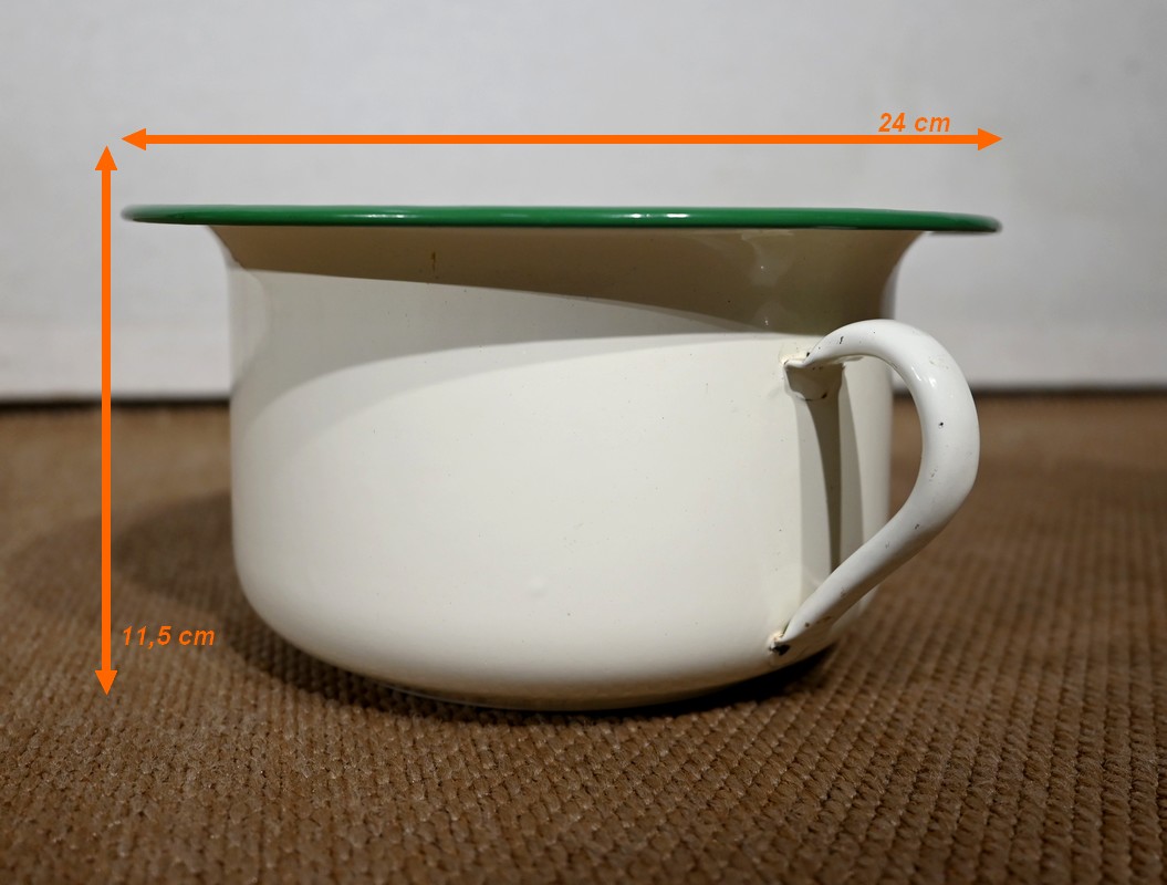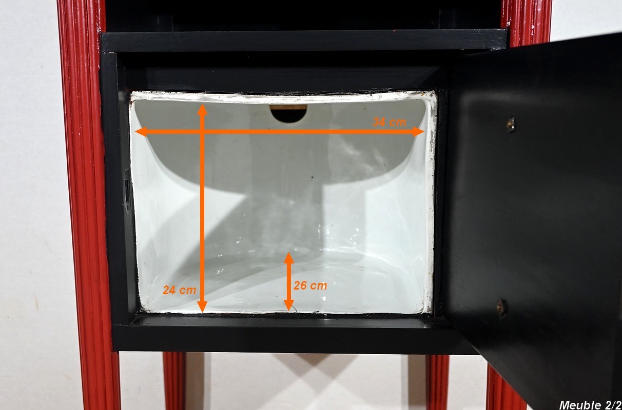 Seule différence entre ces deux articles : l’un comprend un espace de quatre casiers horizontaux tandis que l’autre offre une porte simulant deux tiroirs habillés de pendentifs en bronze ciselé. L’intérieur, en faïence, était à l’origine prévu pour accueillir un pot de chambre (inclus).