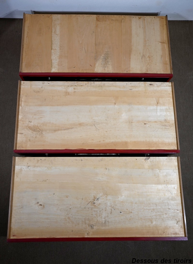 Elle ouvre par trois tiroirs identiques à platebandes.