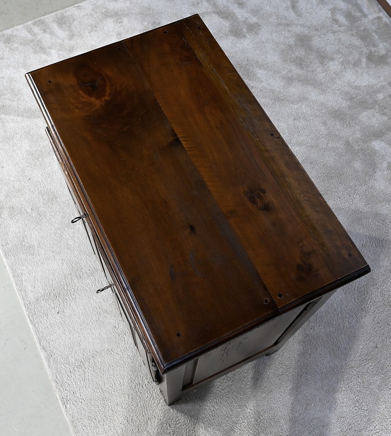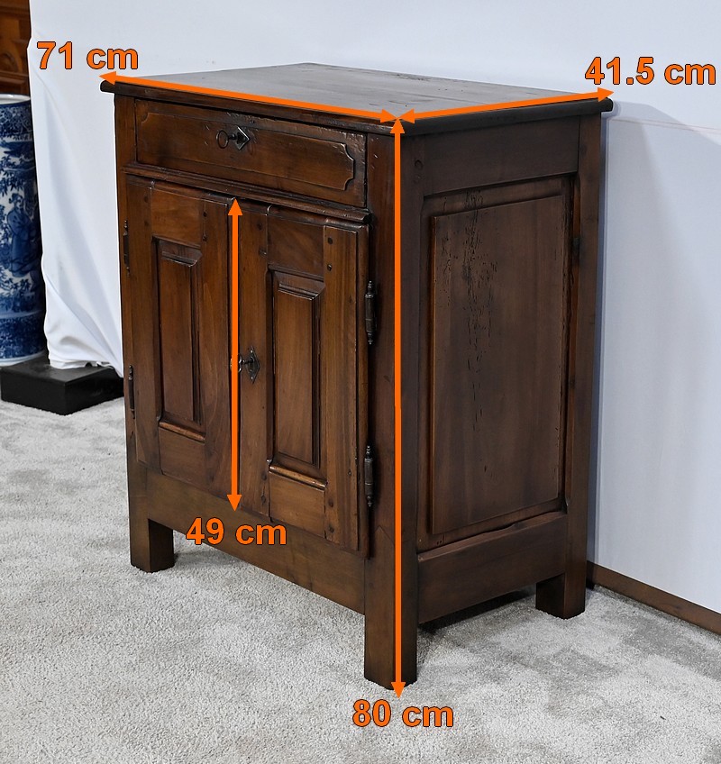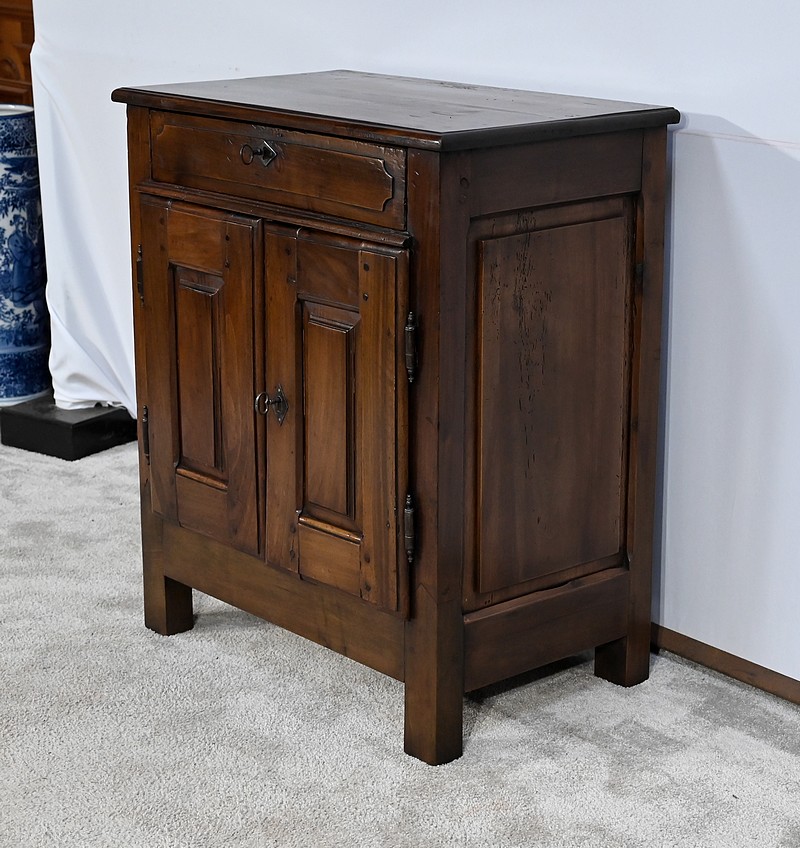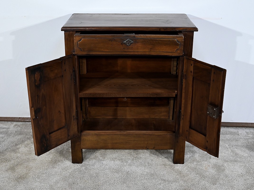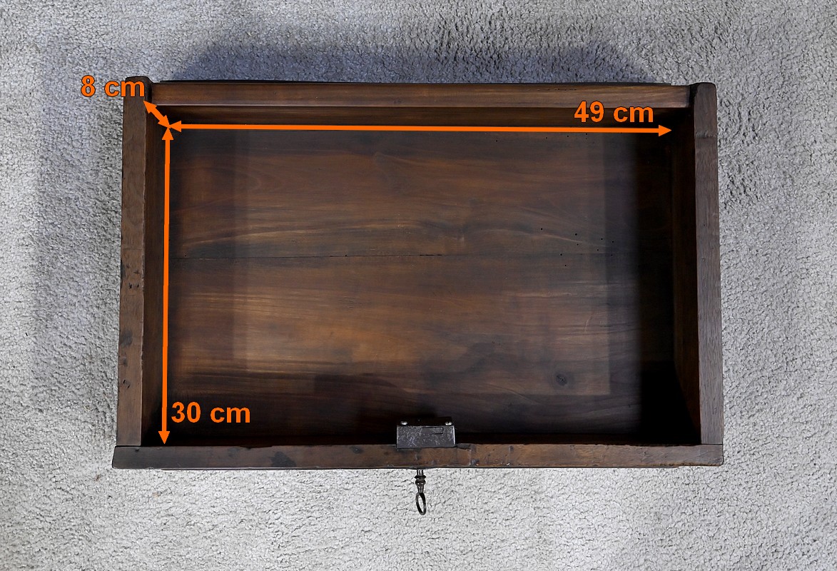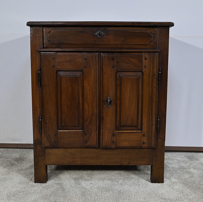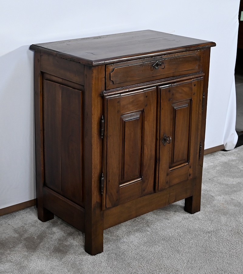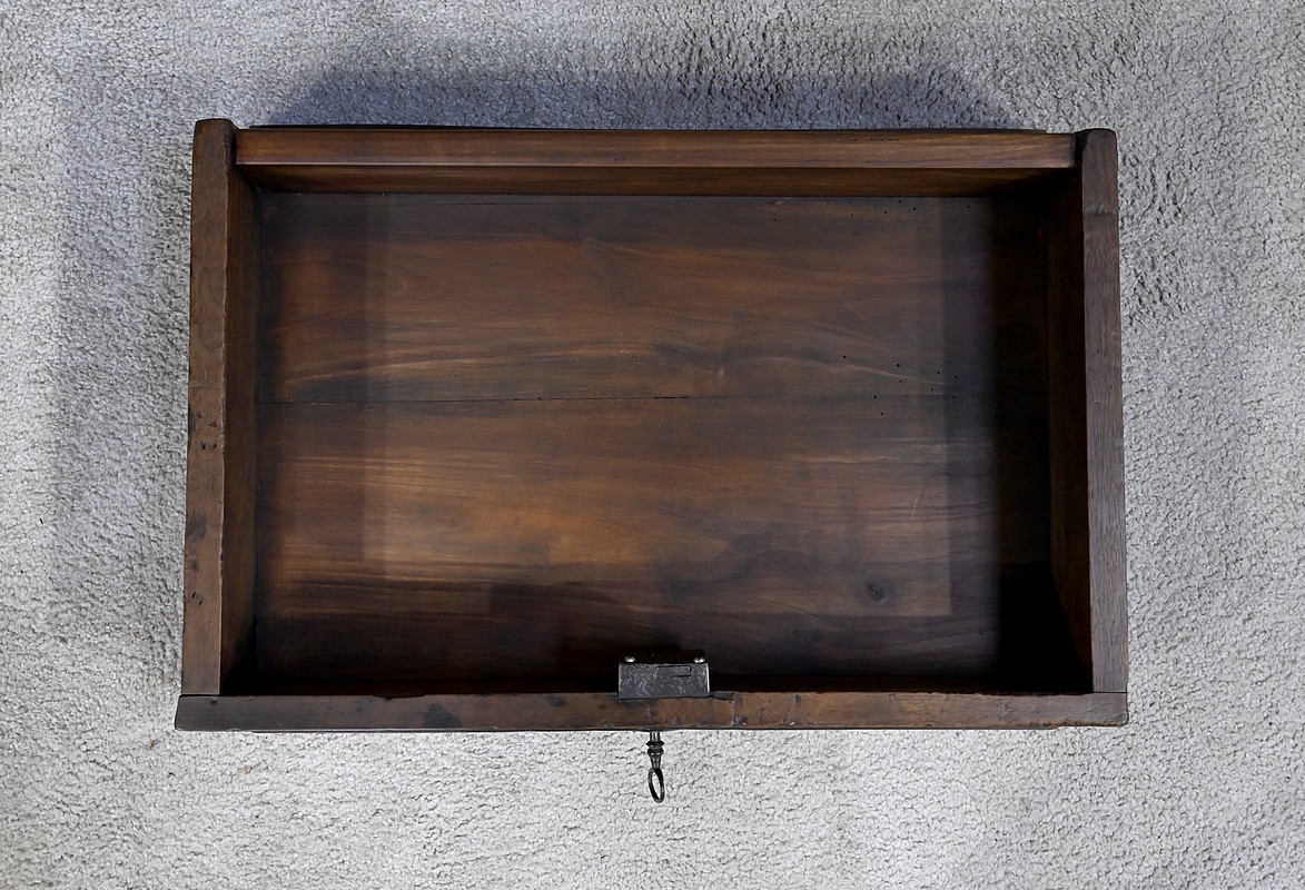 Rare meuble du XVIIIe siècle, en noyer massif de petit dimensionnel, pourvu en façade d’un tiroir, muni d’un pourtour à défoncement avec angles concaves.