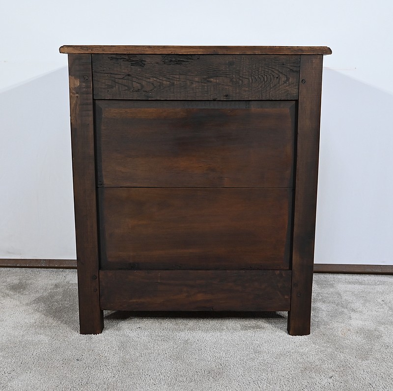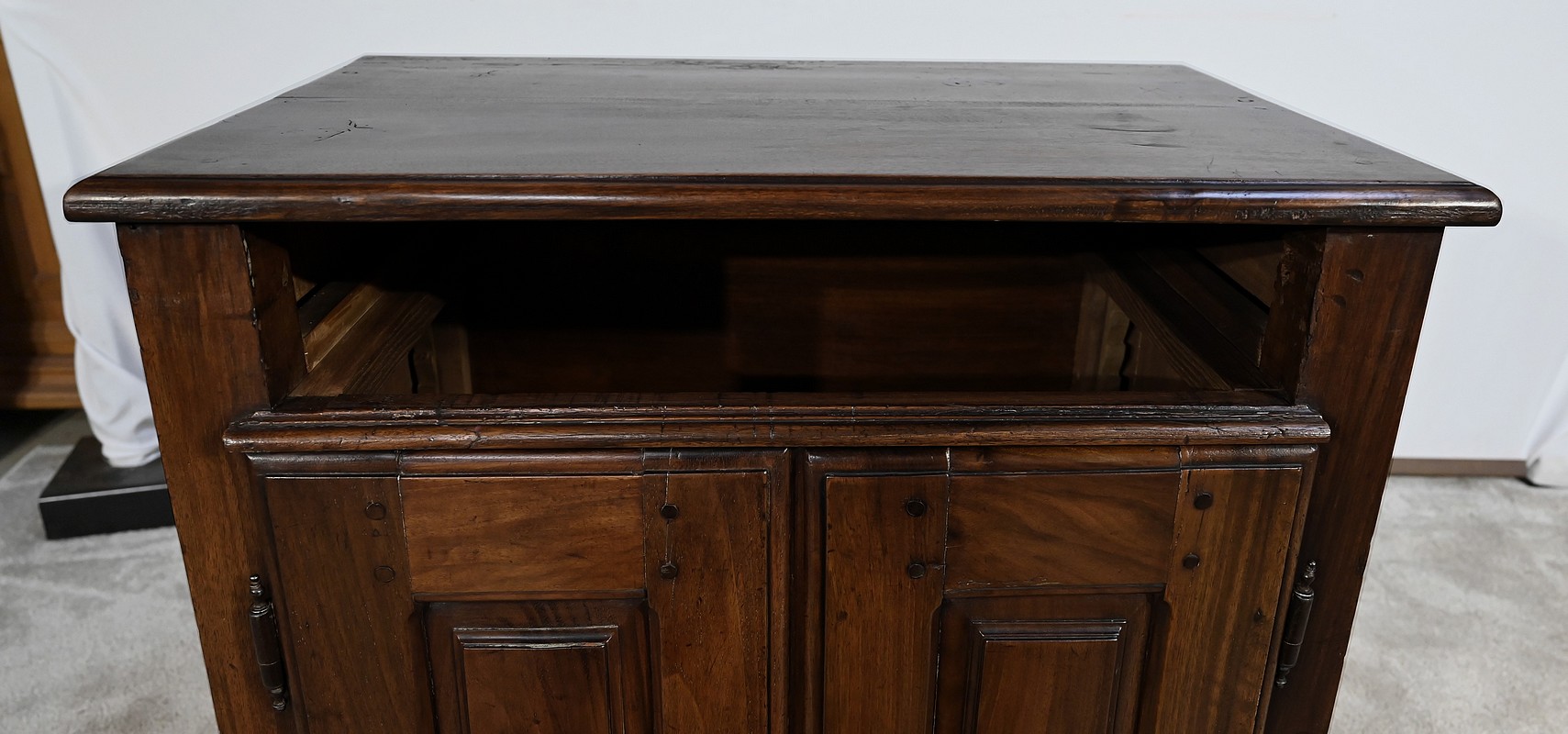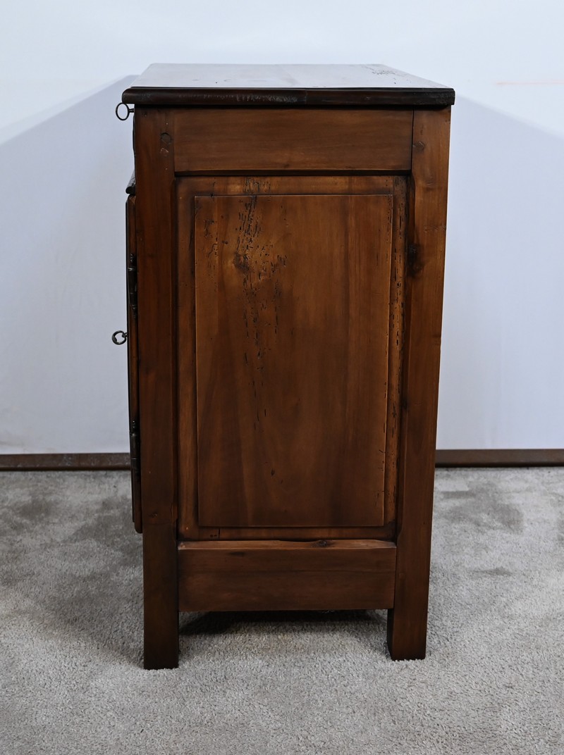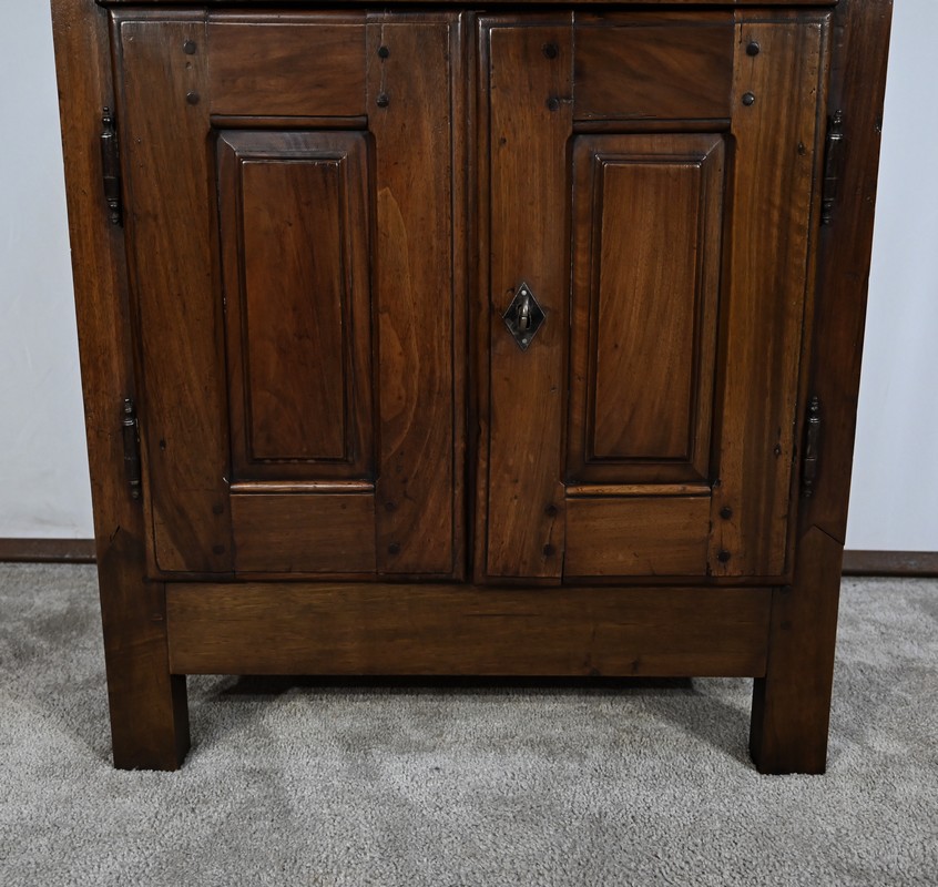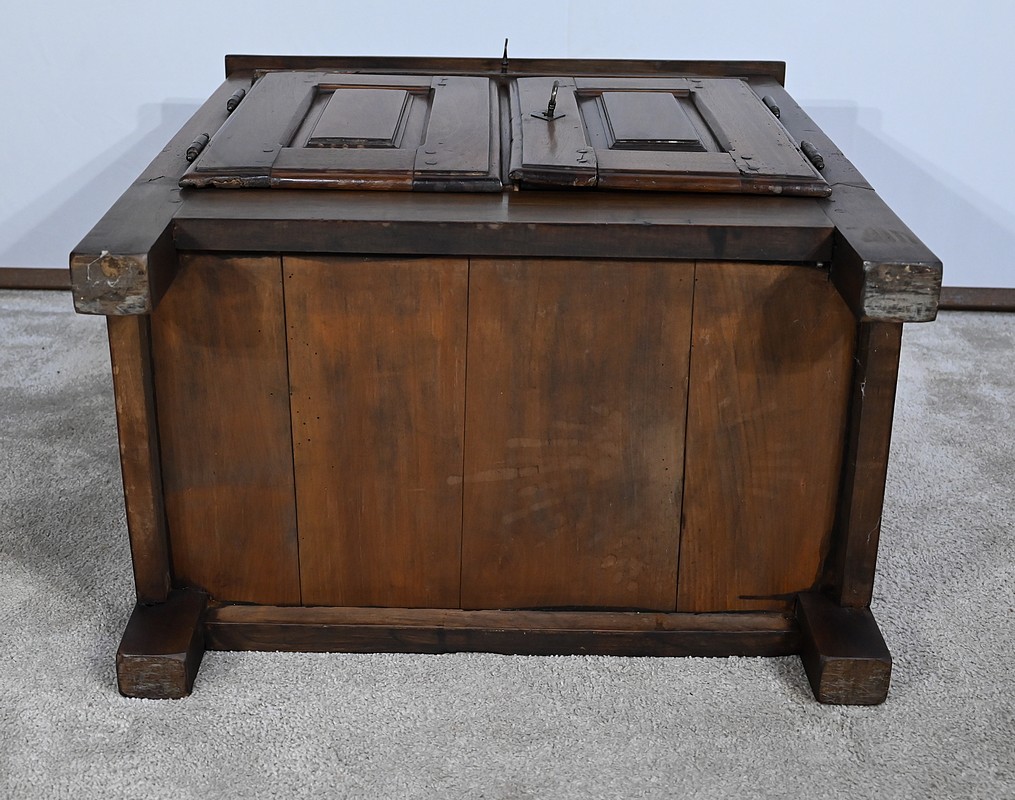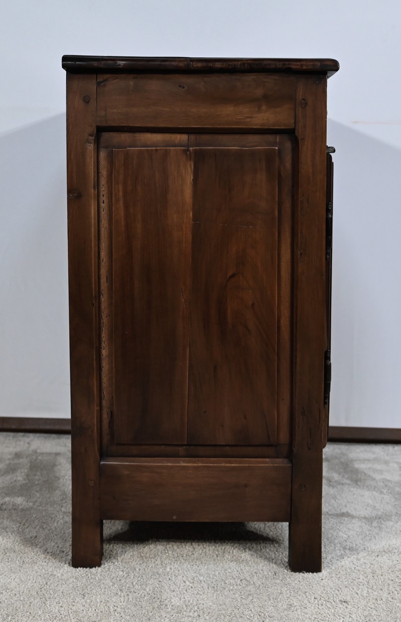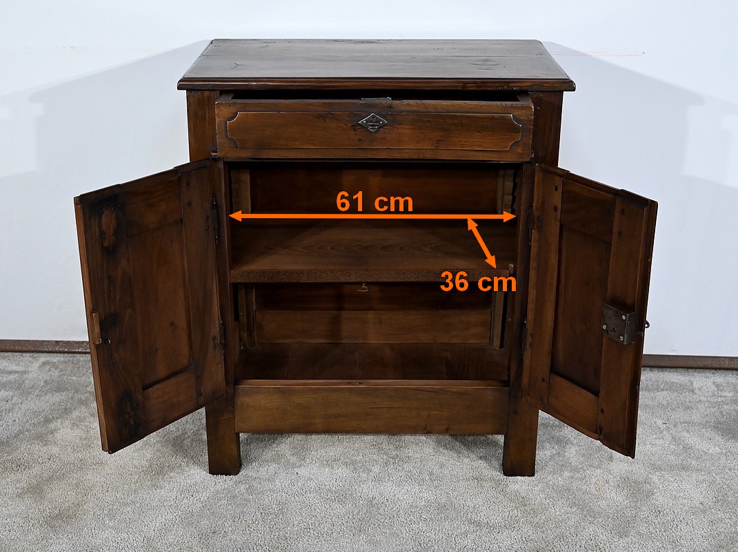 Rare meuble du XVIIIe siècle, en noyer massif de petit dimensionnel, pourvu en façade d’un tiroir, muni d’un pourtour à défoncement avec angles concaves.