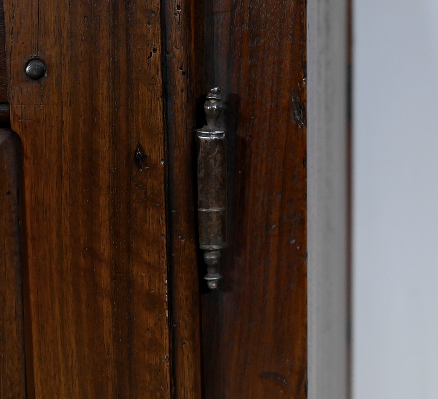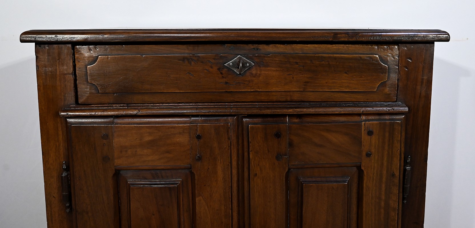 Ce meuble est muni de deux vantaux à large cadre chevillé accompagnés d’un pourtour avec moulure en quart de rond, avec au centre un panneau à plate-bande. L’intérieur des cadres est à la fois mouluré et muni de chanfrein arrêté.