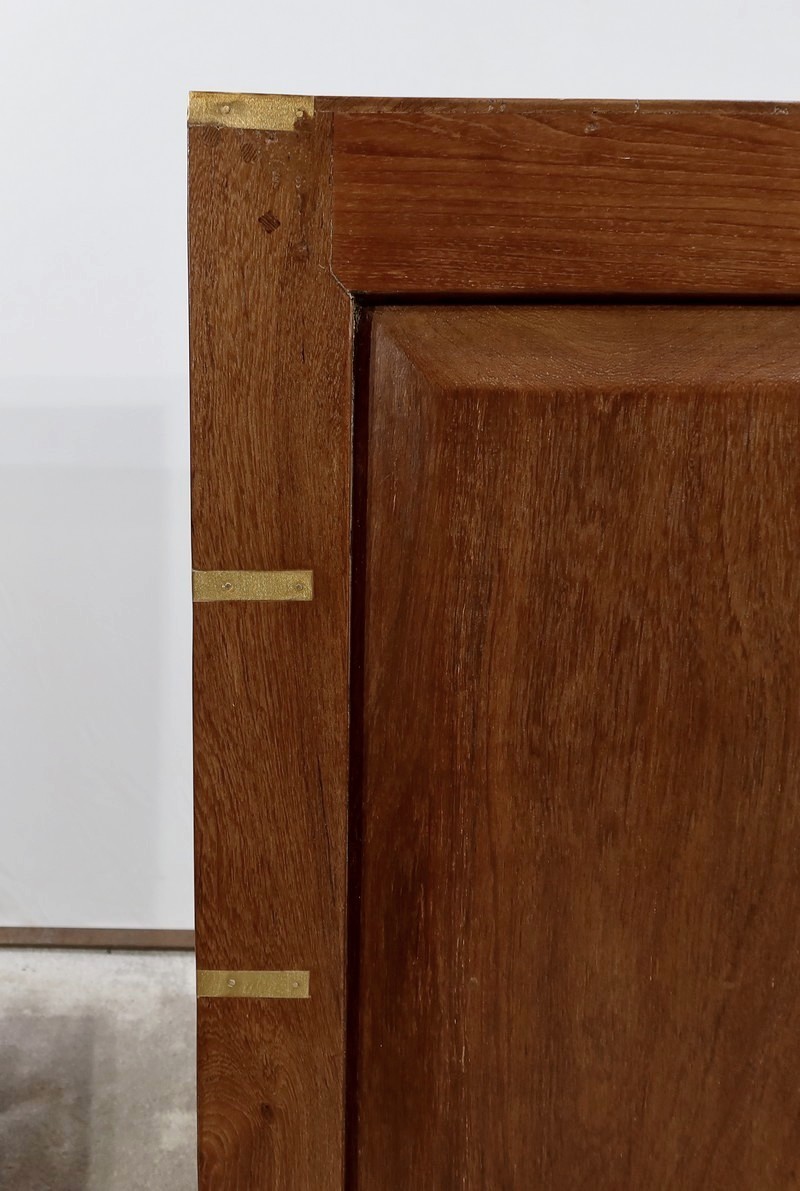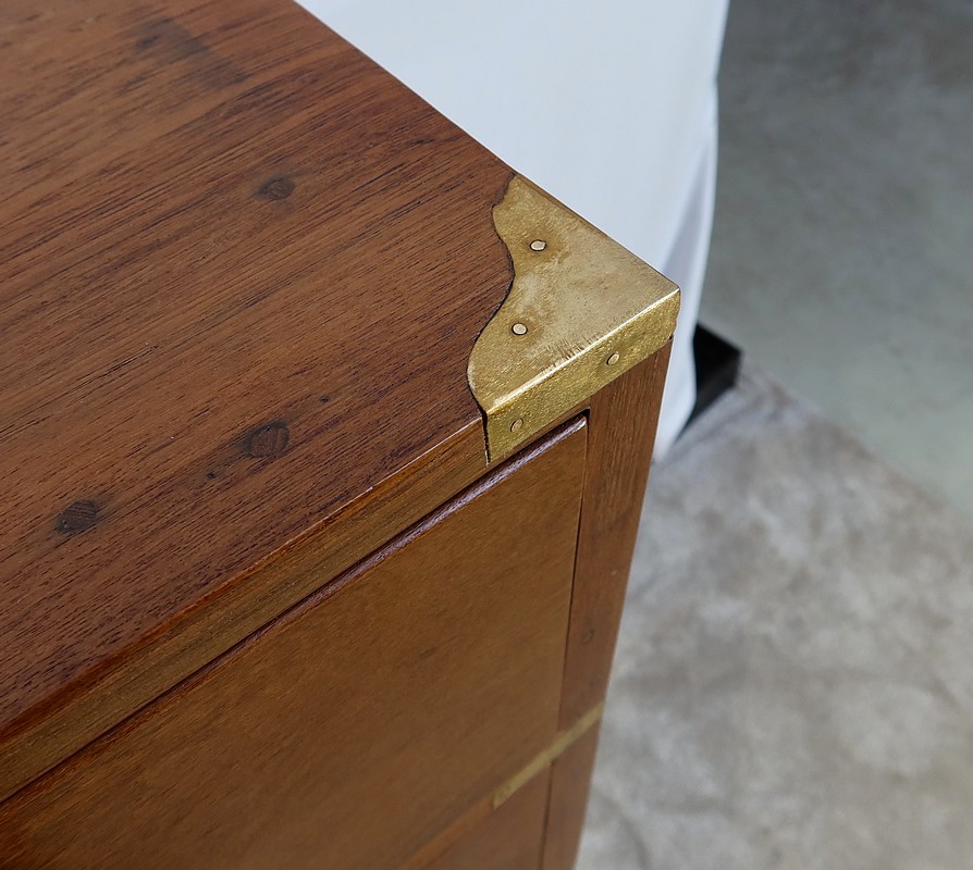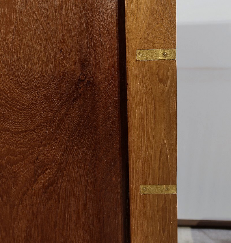 Ce meuble est renforcé aux angles et aux arêtes de lanières en laiton.