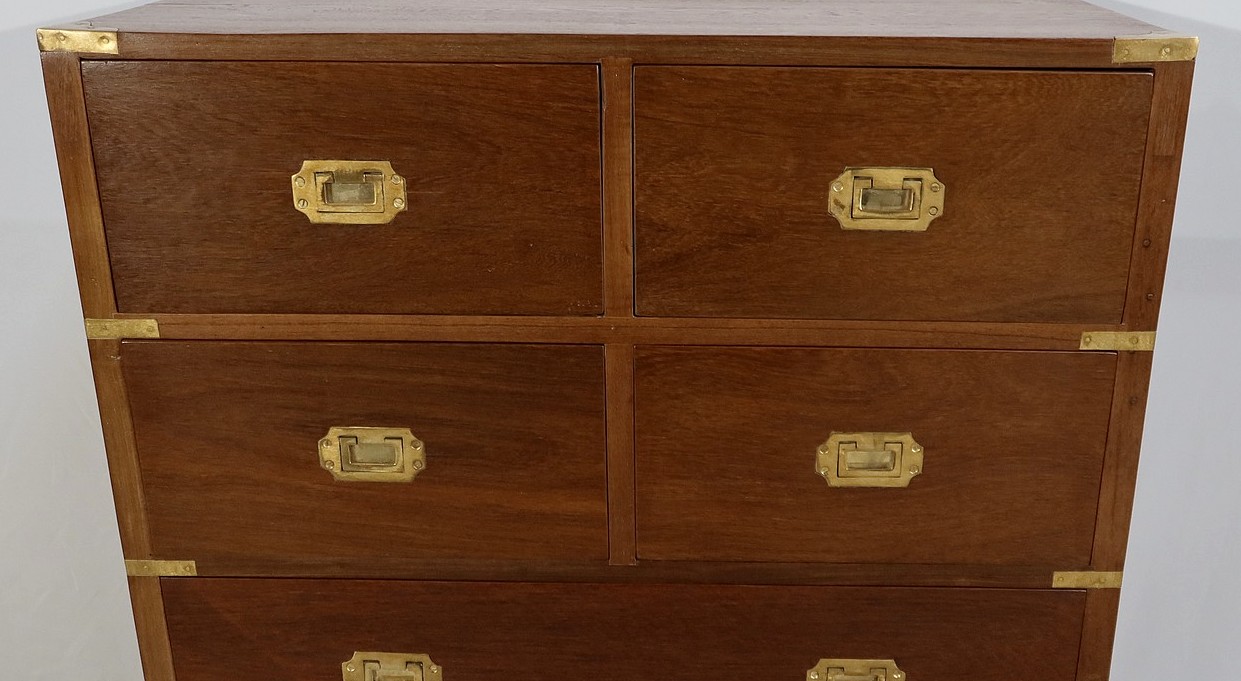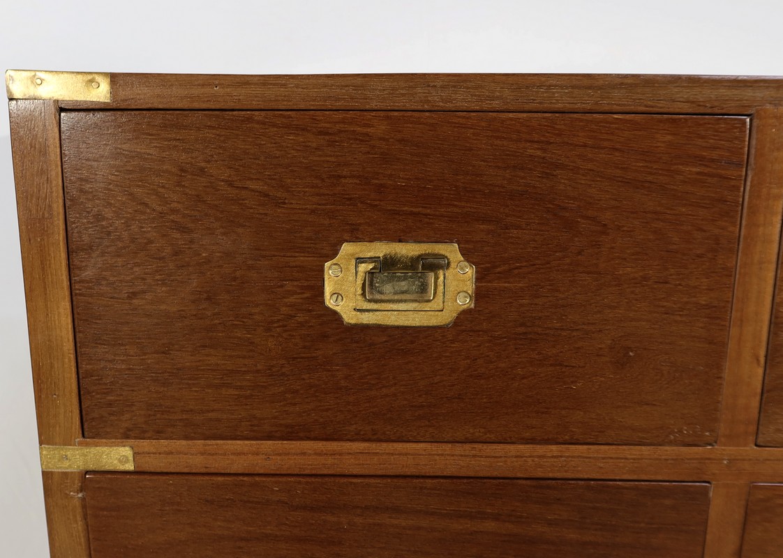 Cette commode offre en façade deux rangées de deux tiroirs ainsi que trois tiroirs plus importants. Chacun d’eux est équipé de poignées bateau encastrées en laiton.