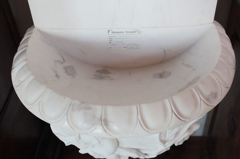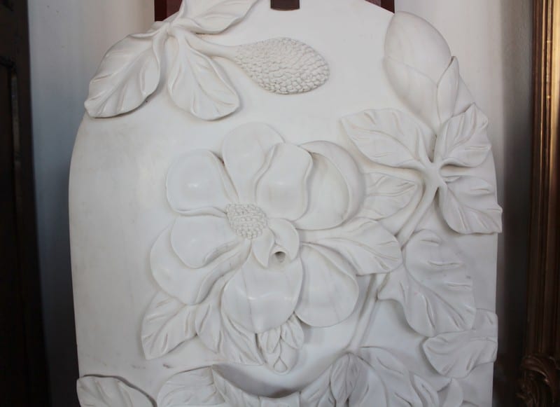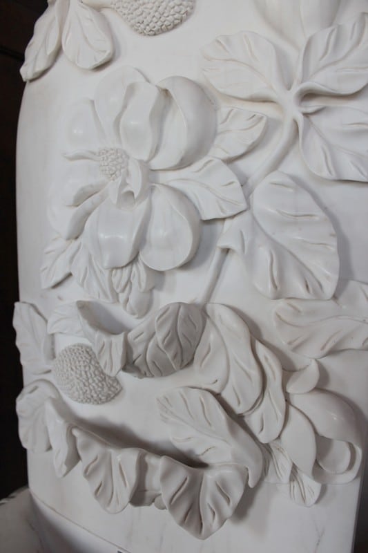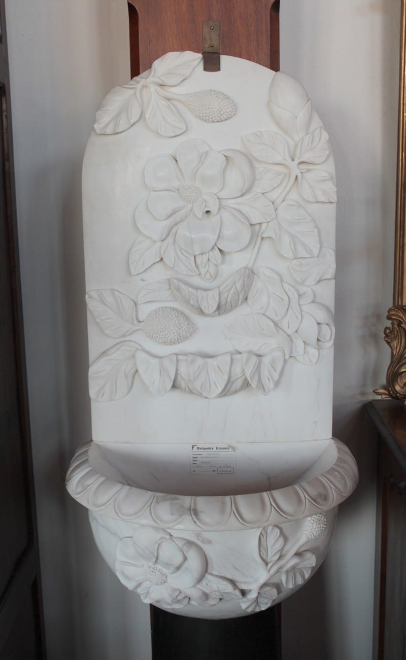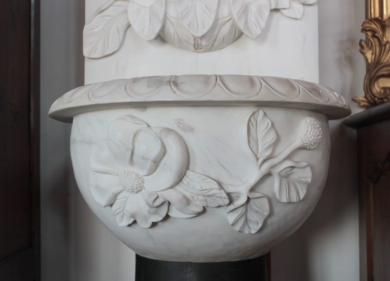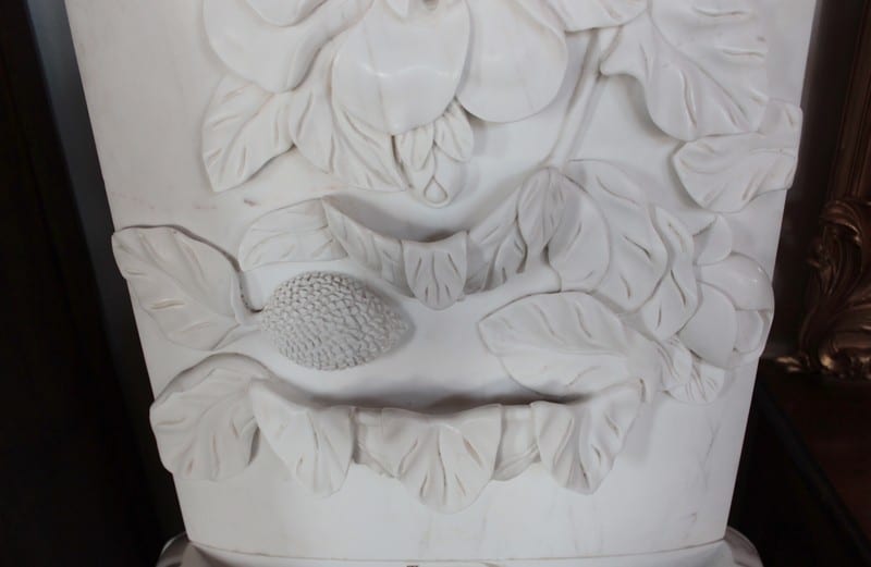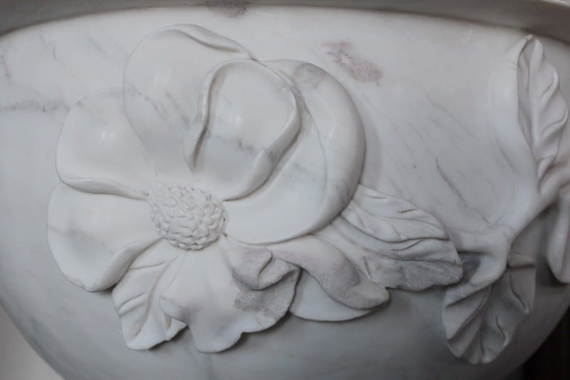 Fontaine en marbre blanc à décor de fleurs et de feuilles.