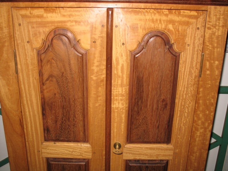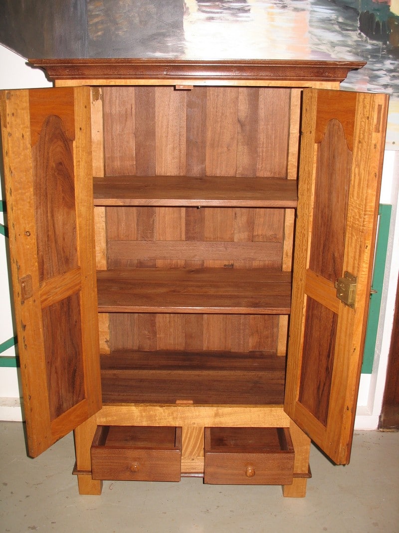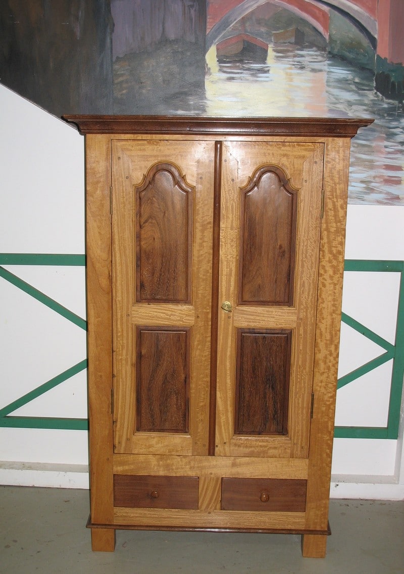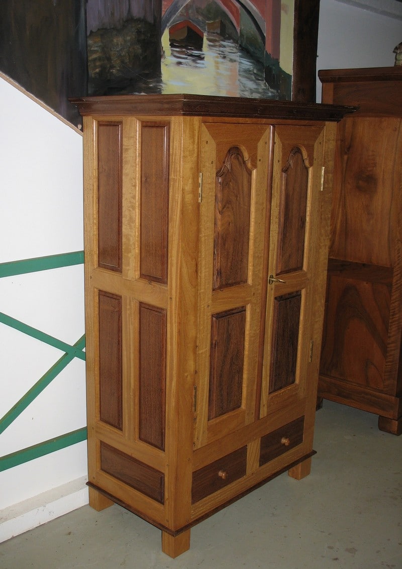 Très petite armoire dans le goût des Armoires Louis XIV de Pondichéry, en citronnier et palissandre. Ses côtés sont panneautés et elle ouvre par 2 portes et 2 tiroirs en partie basse. Fabrication contemporaine.