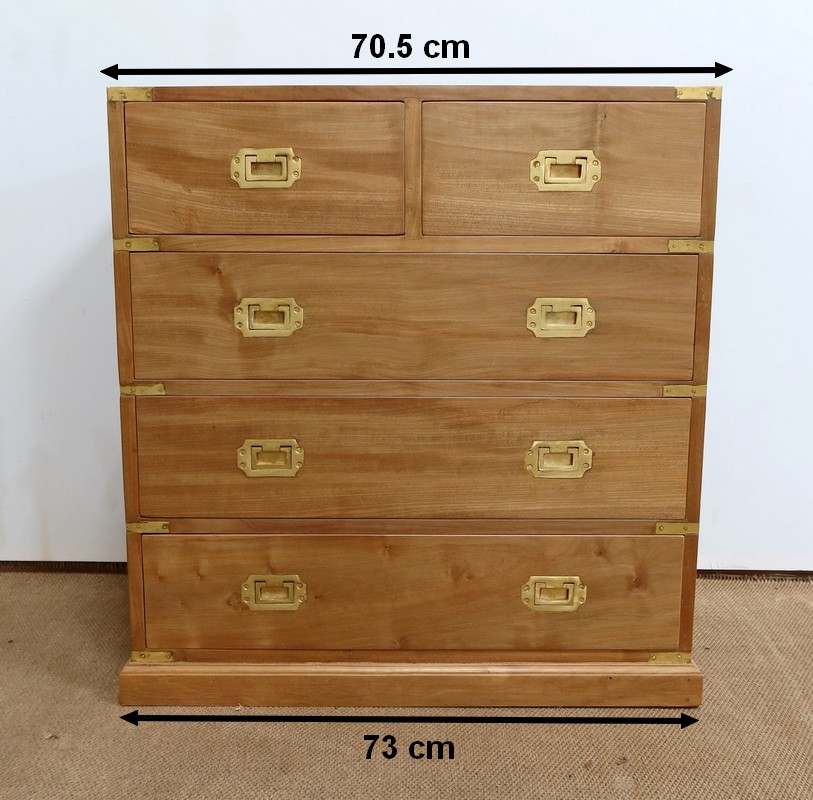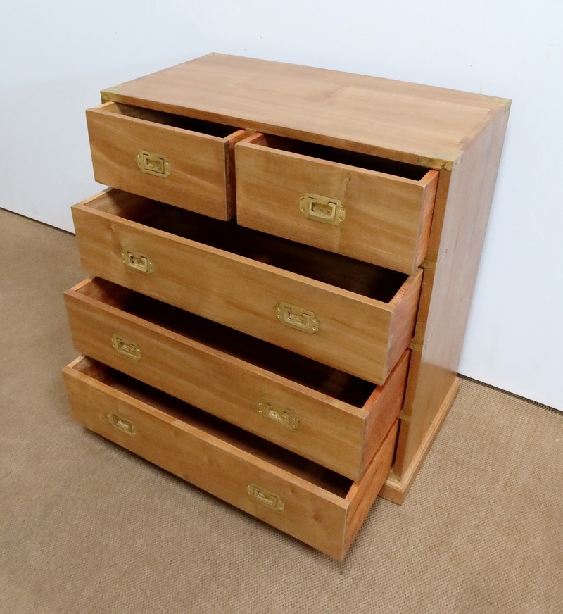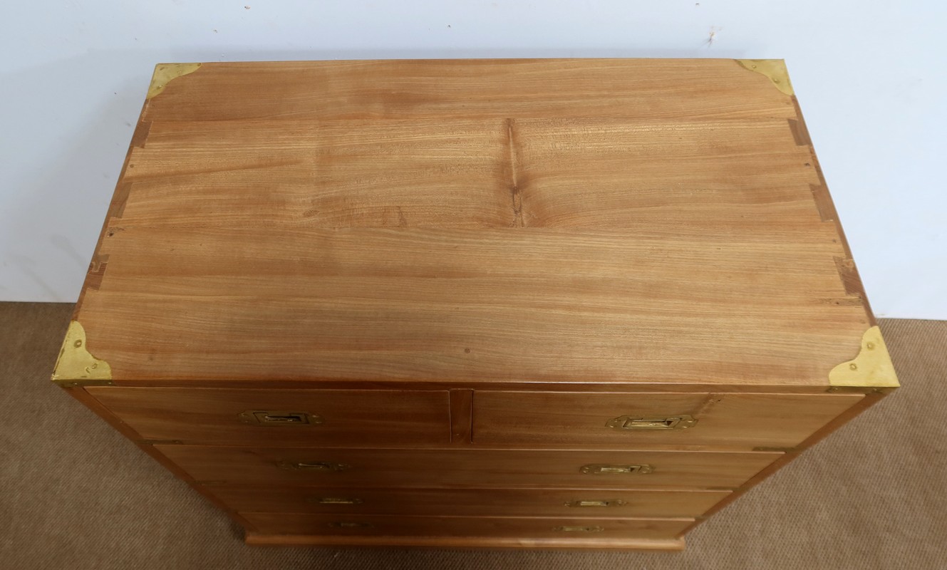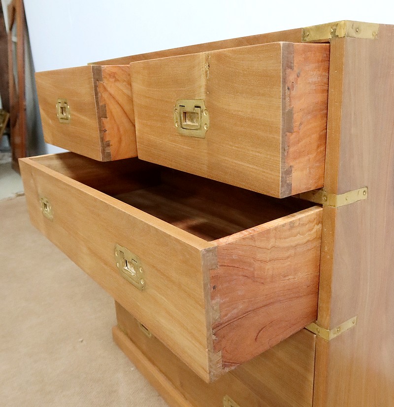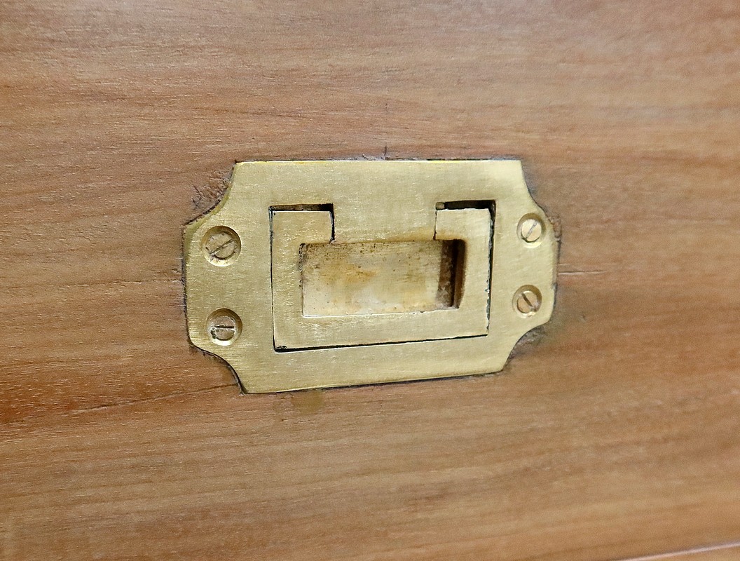 Ce meuble, de fait stable et solide, ouvre sur un premier rang par deux petits tiroirs, puis par trois plus grands. Leurs intérieurs sont en Acajou. Tous sont équipés de poignées de marine en laiton, encastrées et rabattables.