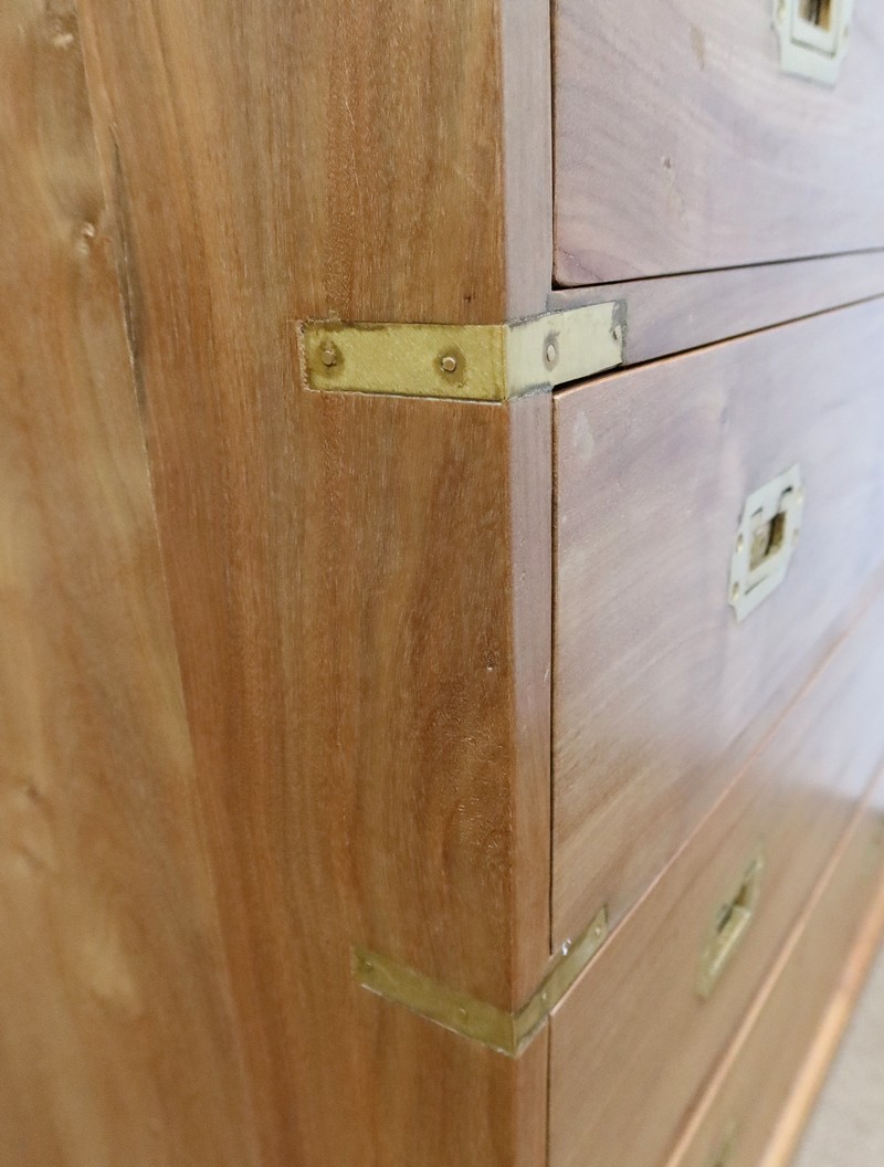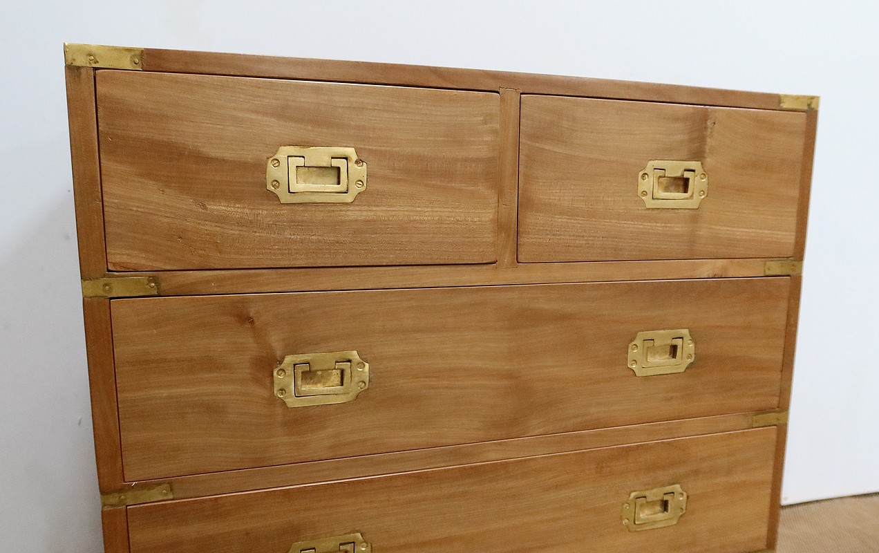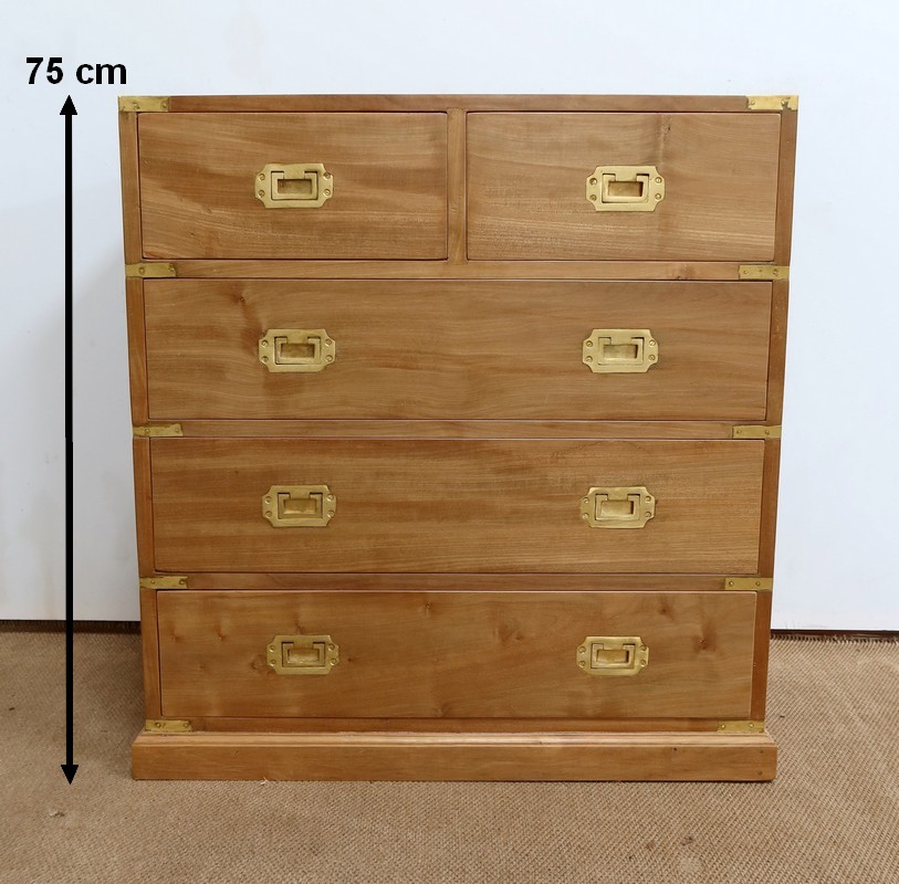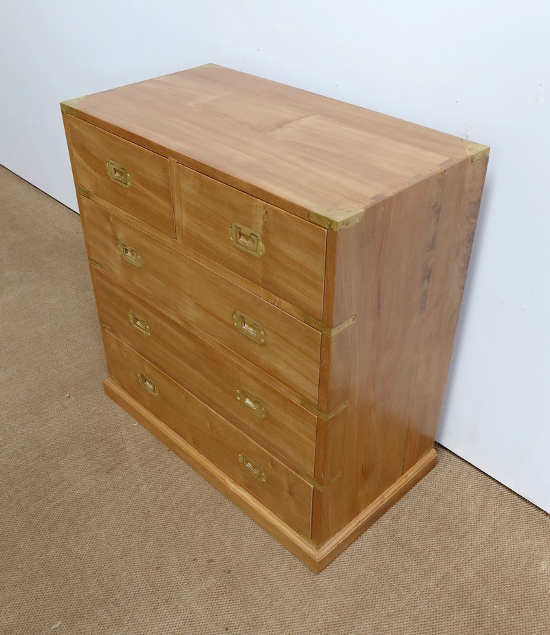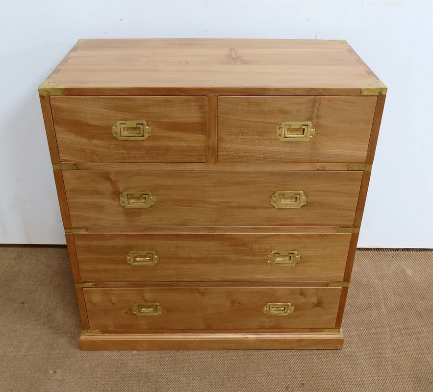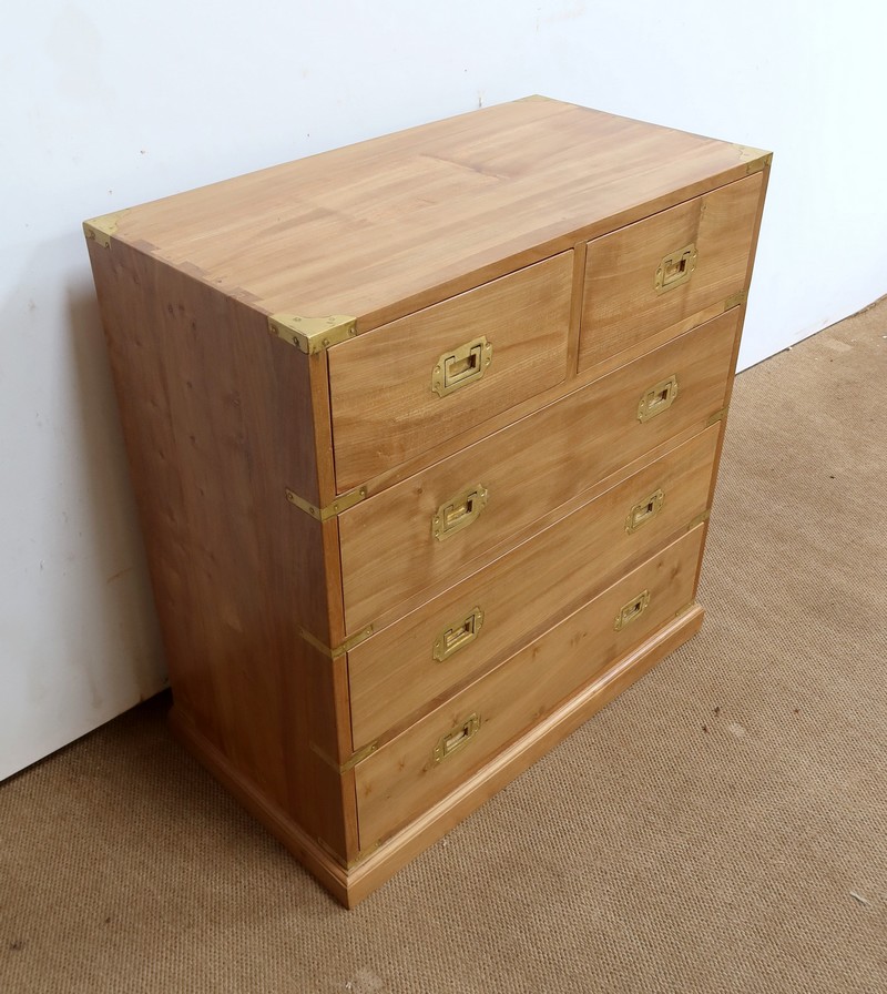 Ce meuble, de fait stable et solide, ouvre sur un premier rang par deux petits tiroirs, puis par trois plus grands. Leurs intérieurs sont en Acajou. Tous sont équipés de poignées de marine en laiton, encastrées et rabattables.