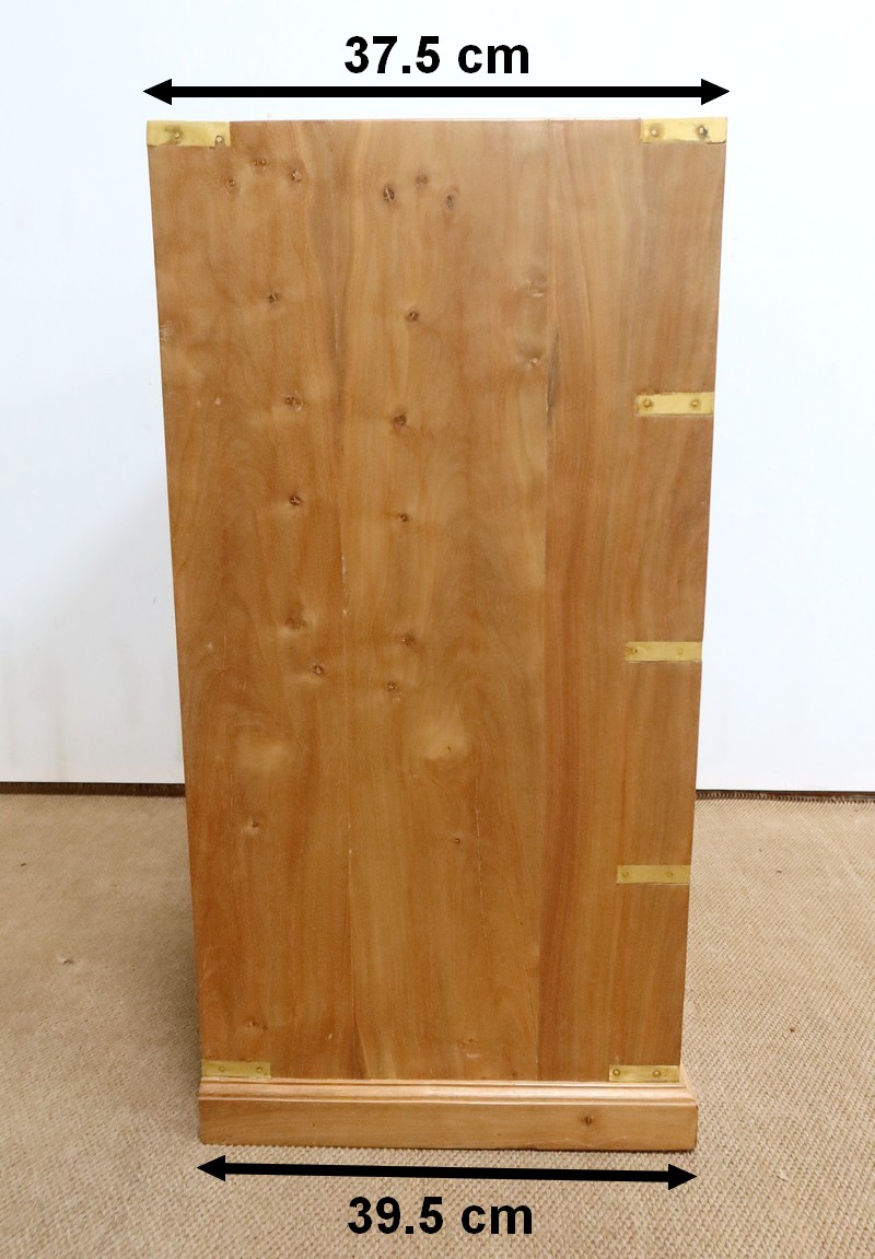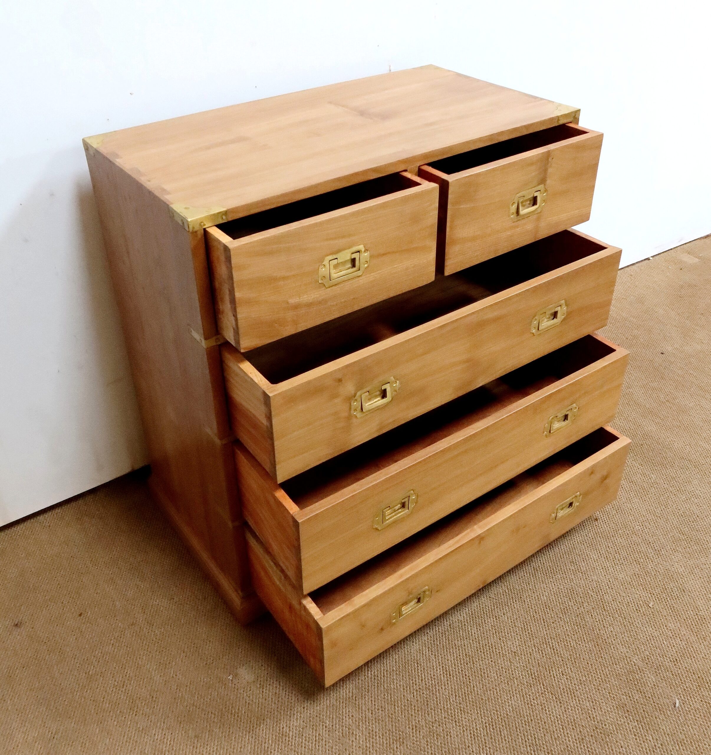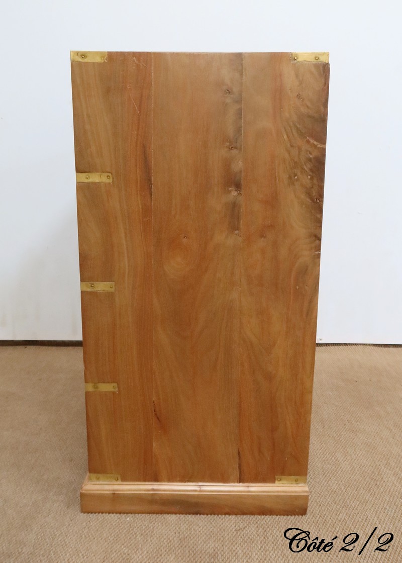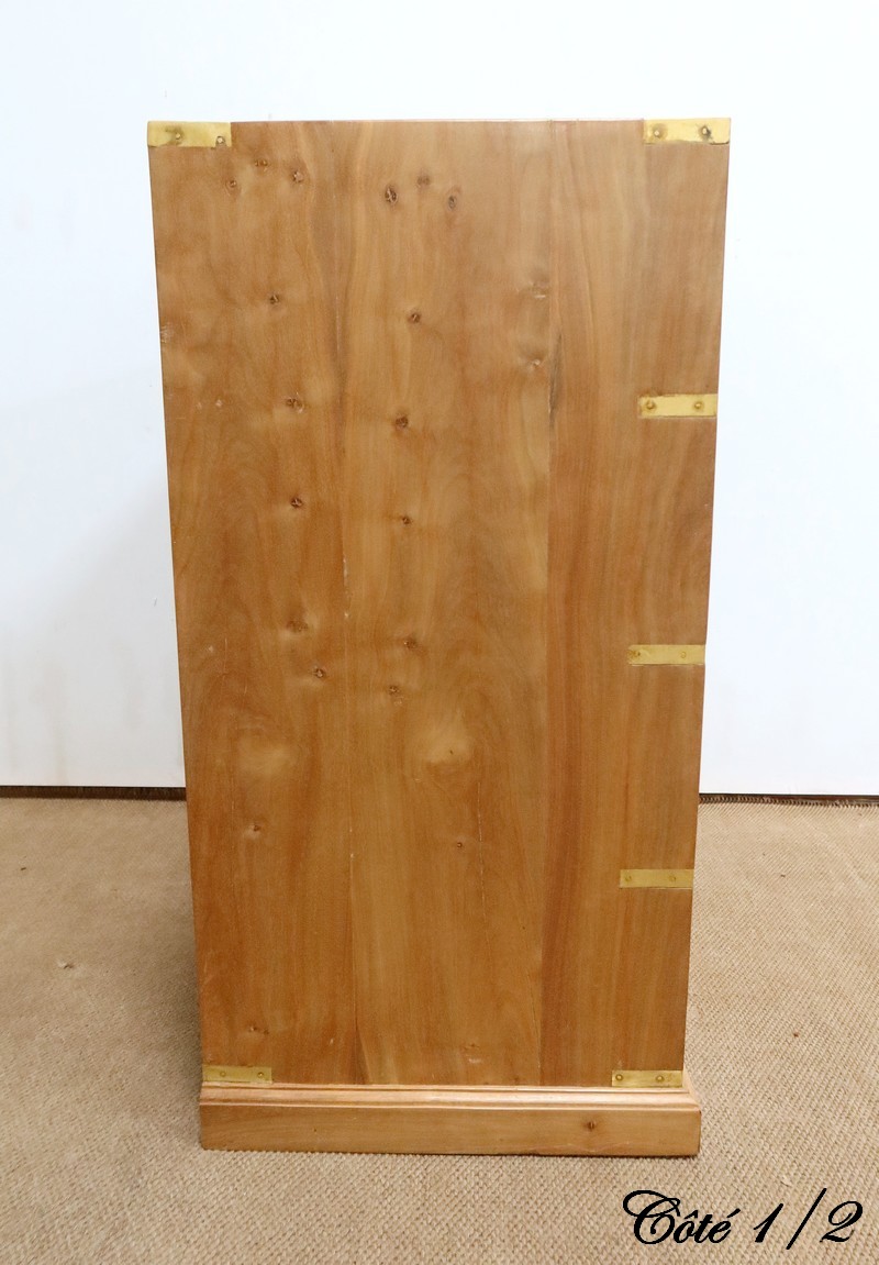 Ce meuble, de fait stable et solide, ouvre sur un premier rang par deux petits tiroirs, puis par trois plus grands. Leurs intérieurs sont en Acajou. Tous sont équipés de poignées de marine en laiton, encastrées et rabattables.