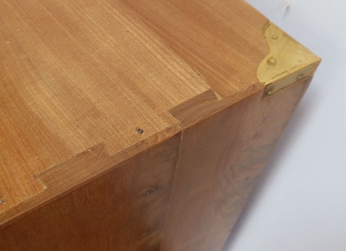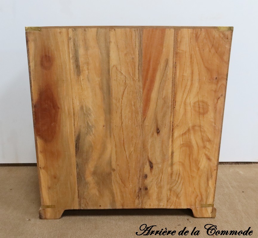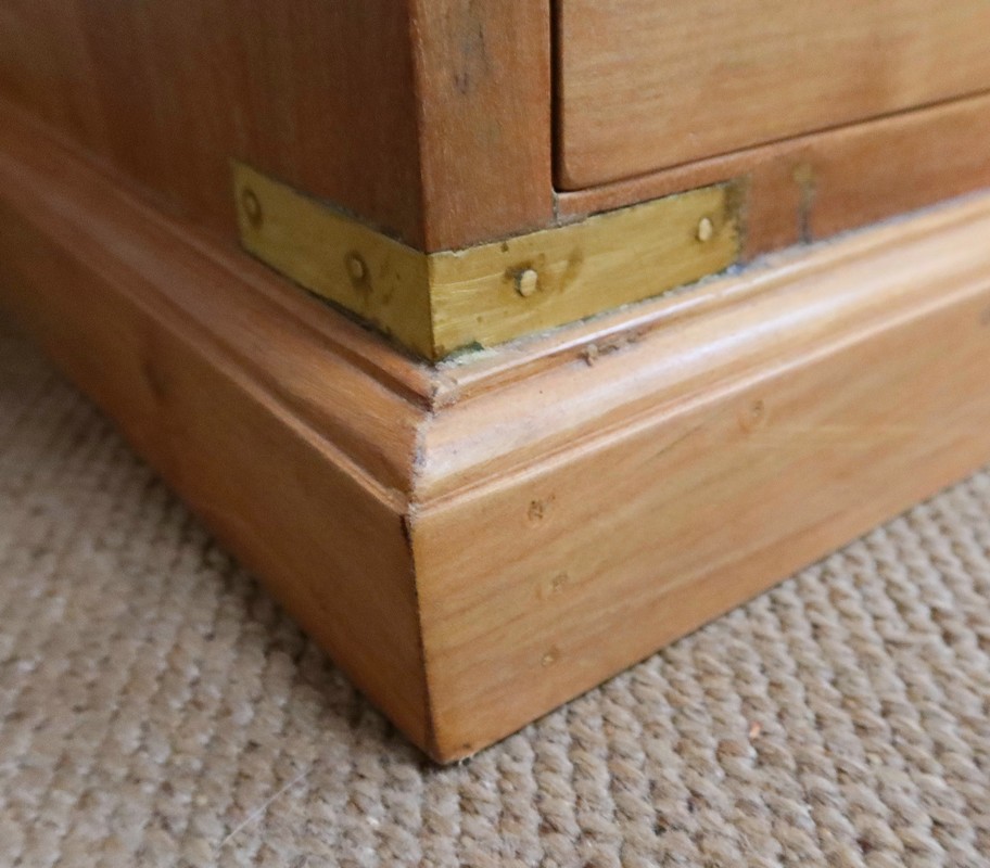 Les angles et les arêtes sont renforcés par des lanières en laiton qui, outre leur fonction de protection, finissent de personnaliser cette commode.