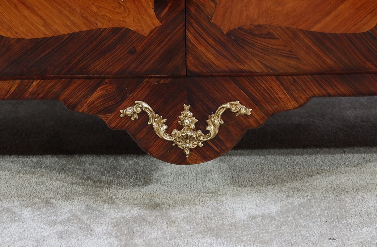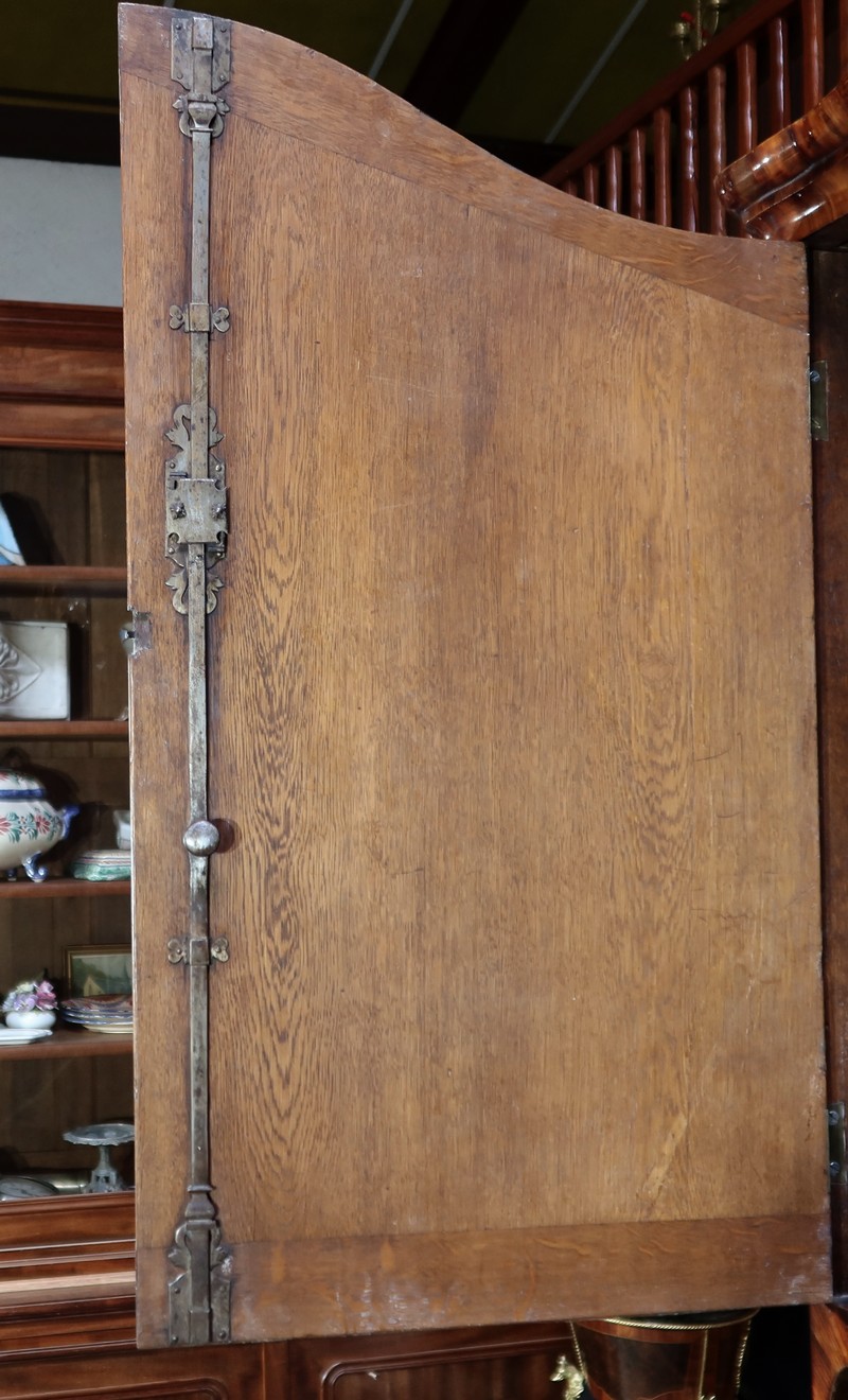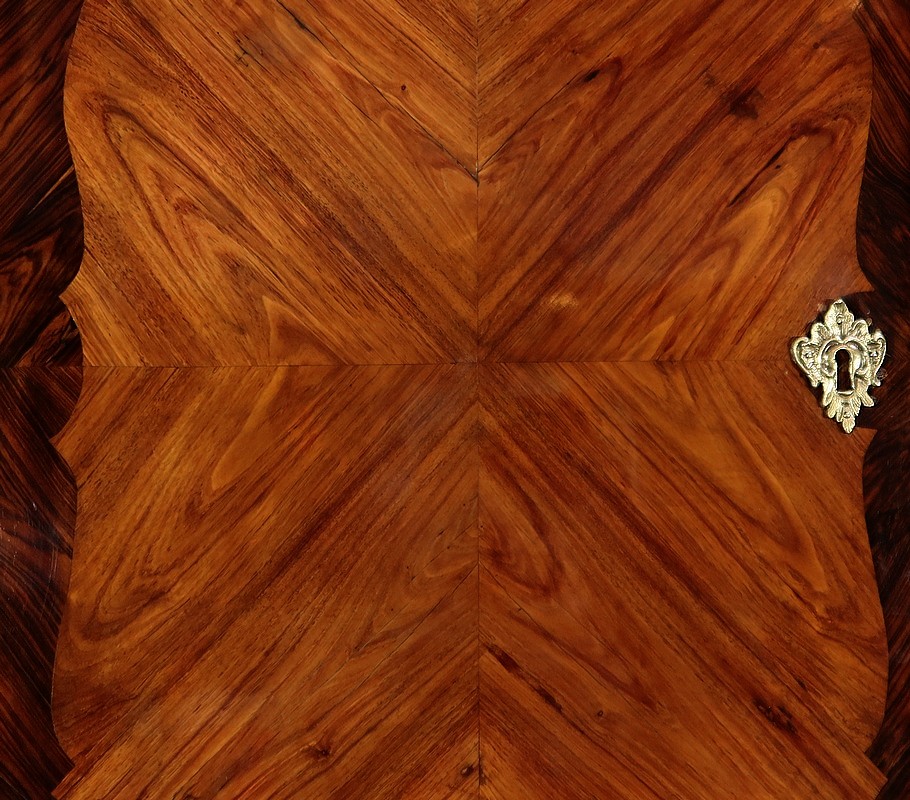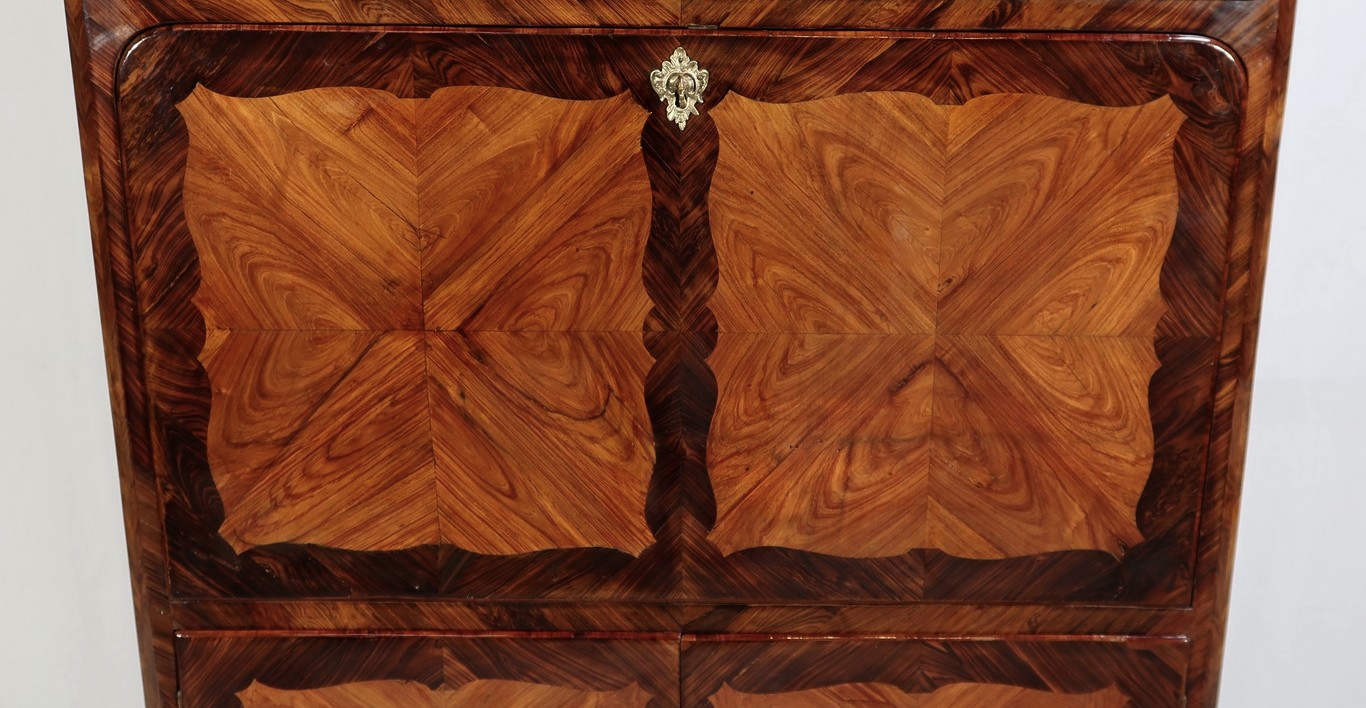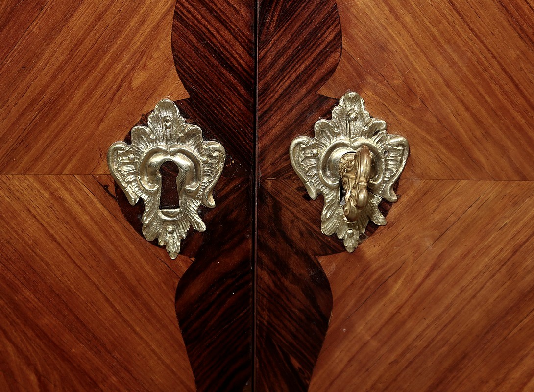 En partie haute, deux grandes portes sont chacune agrémentées d’un placage de bois de rose en ailes de papillon. Autour, une bande découpée par l’intérieur, en bois de violette disposé en diagonale, forme une ligne mouvementée. Ces portes sont équipées d’entrées d’origine en bronze, d’une serrure en parfait état de fonctionnement, bénéficiant sur la porte de gauche d’un système coulissant d’origine et d’une clé postérieure au XVIIIe.