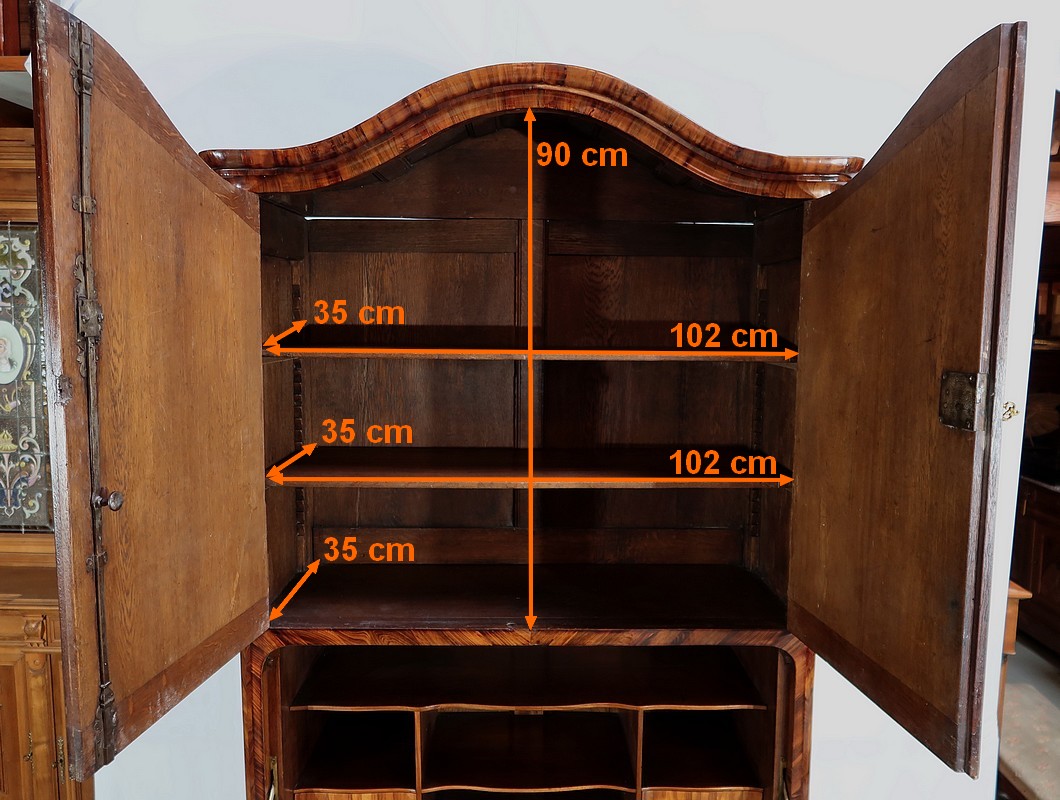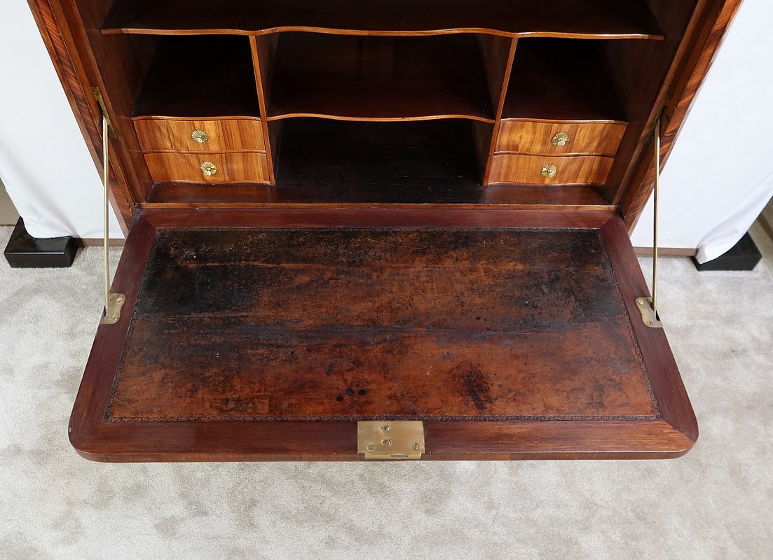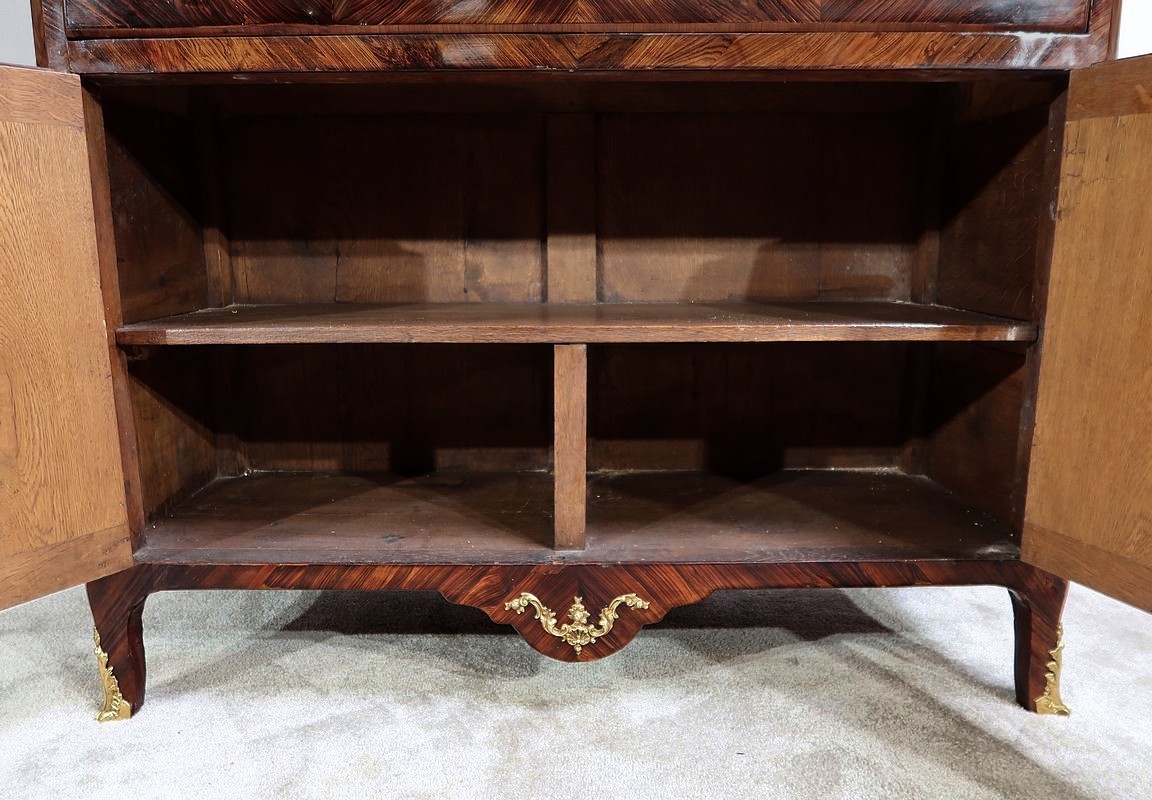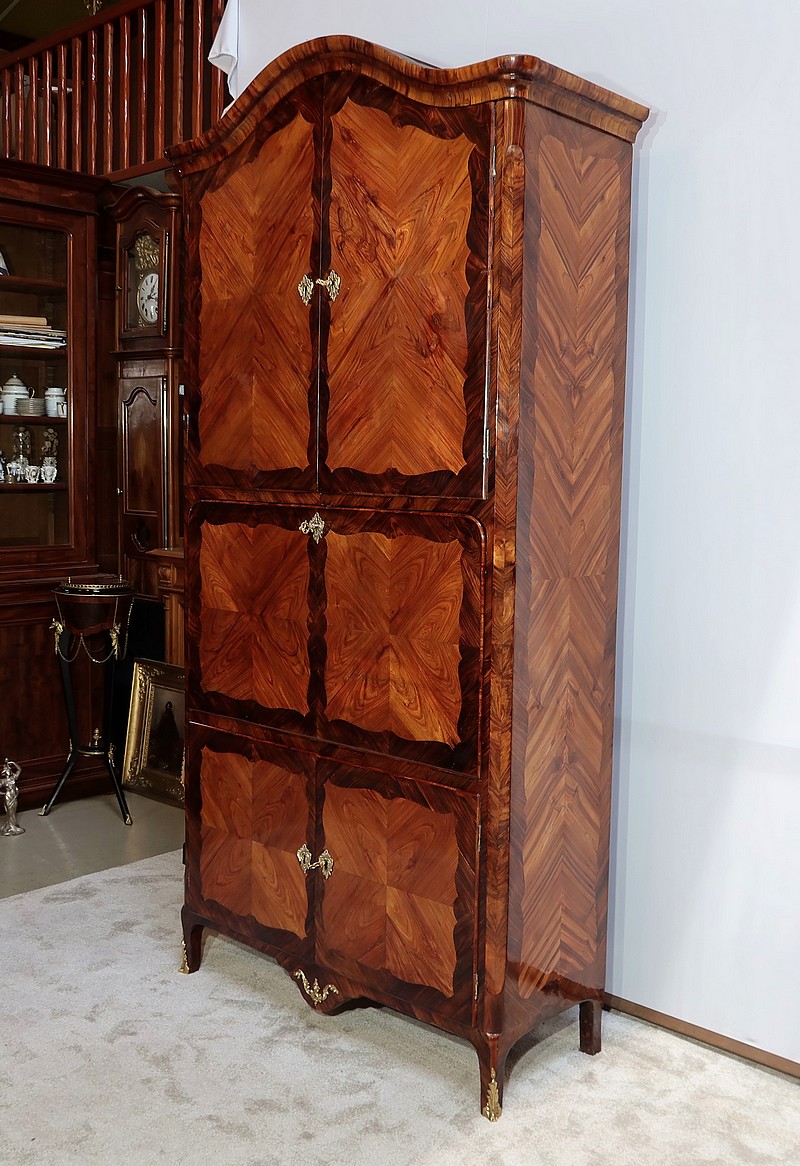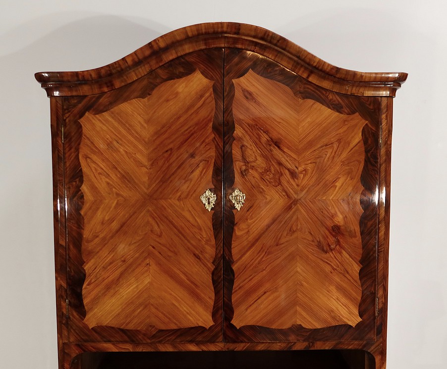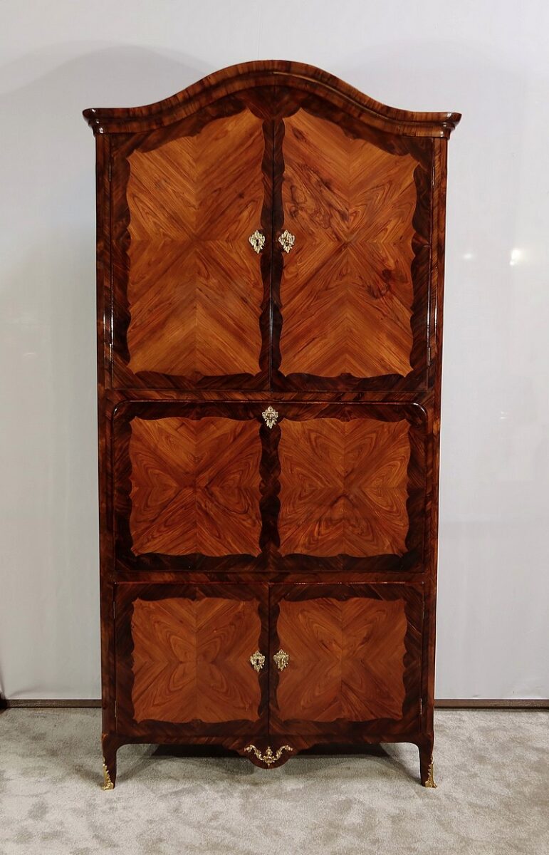 En partie haute, deux grandes portes sont chacune agrémentées d’un placage de bois de rose en ailes de papillon. Autour, une bande découpée par l’intérieur, en bois de violette disposé en diagonale, forme une ligne mouvementée. Ces portes sont équipées d’entrées d’origine en bronze, d’une serrure en parfait état de fonctionnement, bénéficiant sur la porte de gauche d’un système coulissant d’origine et d’une clé postérieure au XVIIIe.