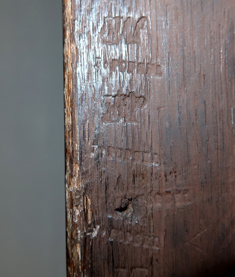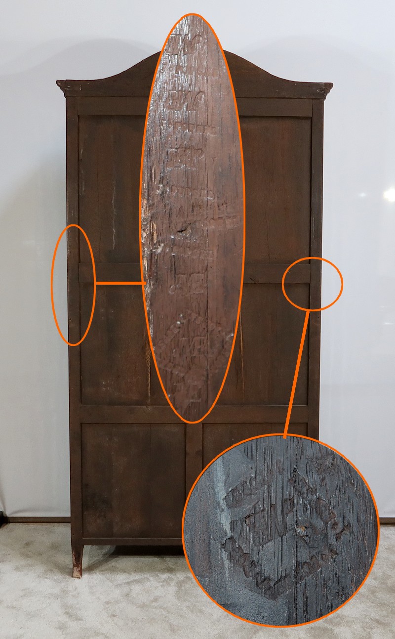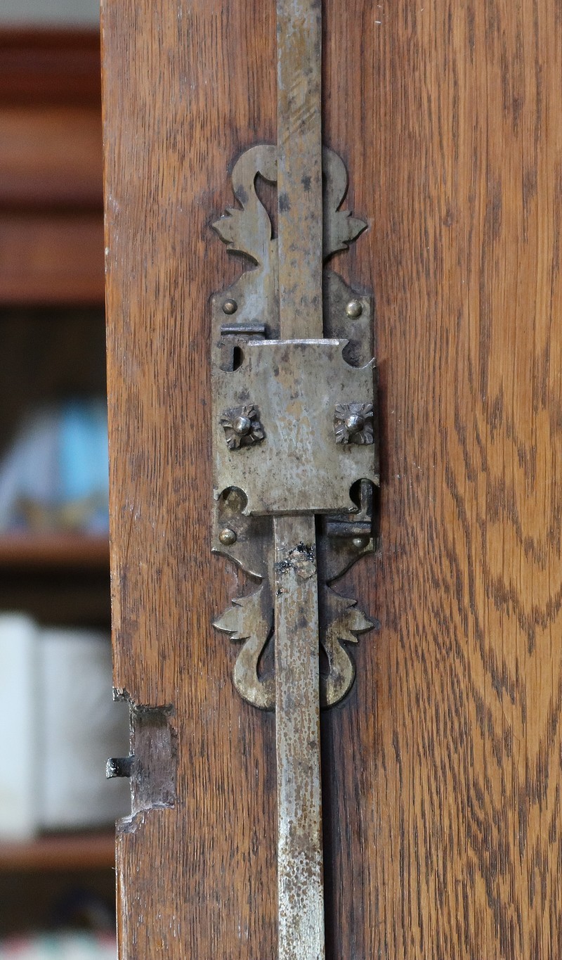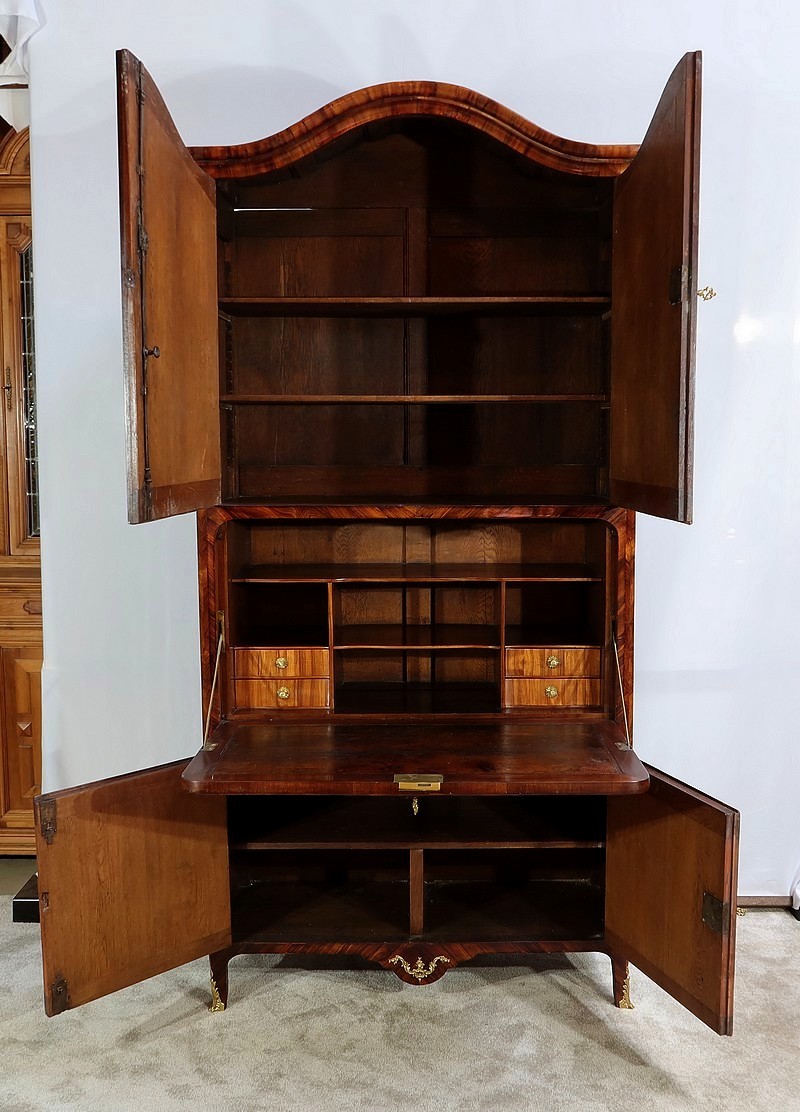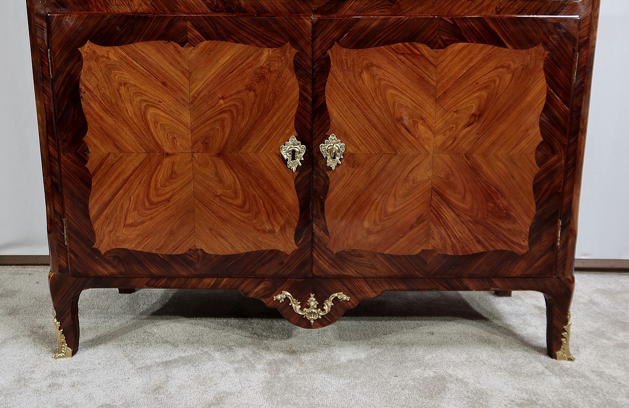 En partie haute, deux grandes portes sont chacune agrémentées d’un placage de bois de rose en ailes de papillon. Autour, une bande découpée par l’intérieur, en bois de violette disposé en diagonale, forme une ligne mouvementée. Ces portes sont équipées d’entrées d’origine en bronze, d’une serrure en parfait état de fonctionnement, bénéficiant sur la porte de gauche d’un système coulissant d’origine et d’une clé postérieure au XVIIIe.