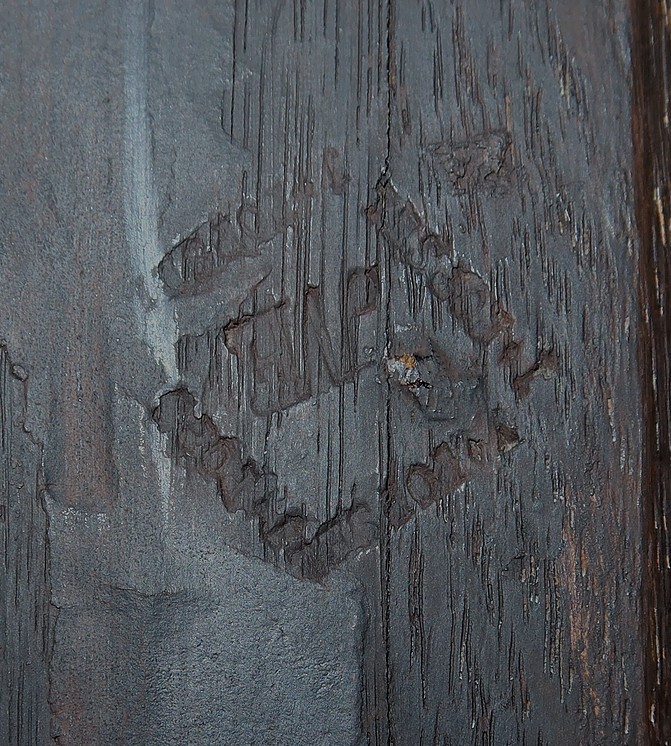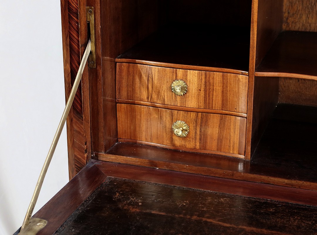 L’intérieur, en chêne, est composé de chaque côté de deux tiroirs dont la façade à mouvement en placage de bois de rose est agrémentée d’un bouton et d’une rosace en bronze d’origine. Nous retrouvons également des niches profondes de différentes tailles.