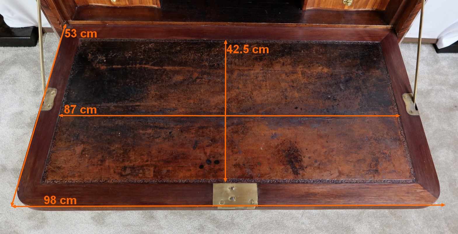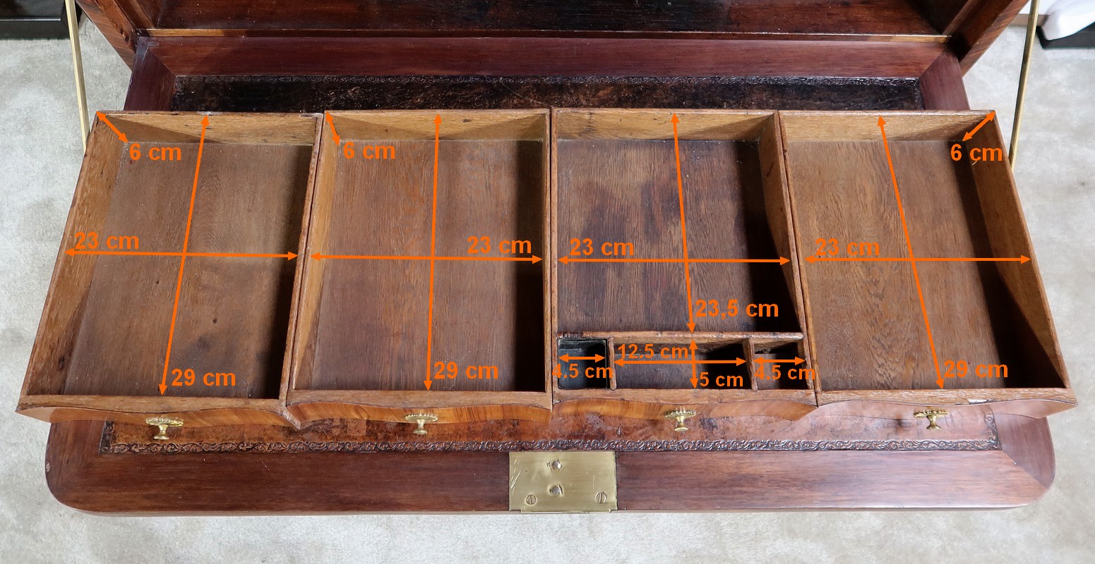 La serrure d’origine est en parfait état, accompagnée d’une entrée en bronze et d’une clé postérieure. A l’ouverture, l’abattant est retenu par des compas laiton d’origine.
