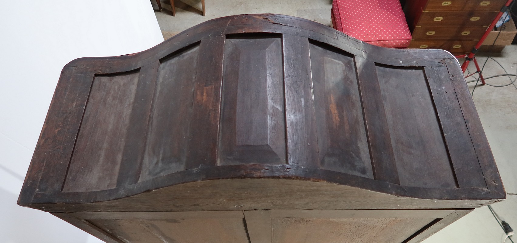 Ce meuble comporte en son sommet une corniche en chapeau de gendarme composée d’une gorge et d’un quart de rond ; avec placage de bois de rose et bois de violette.
