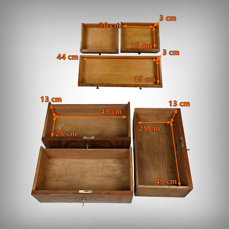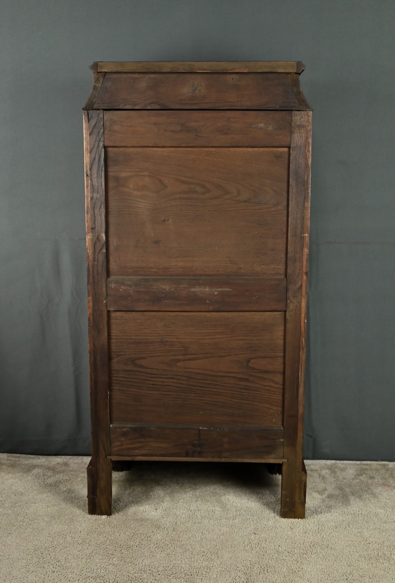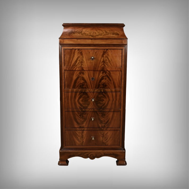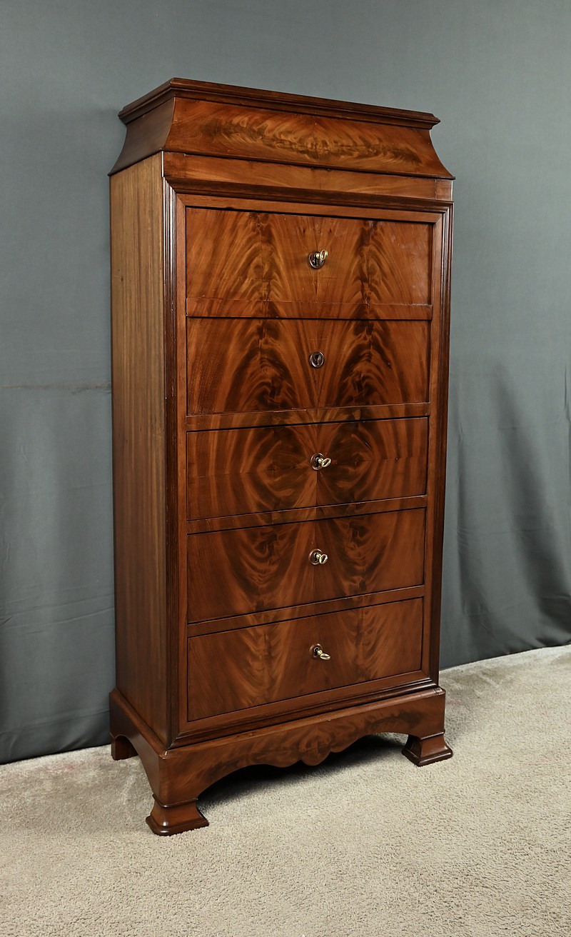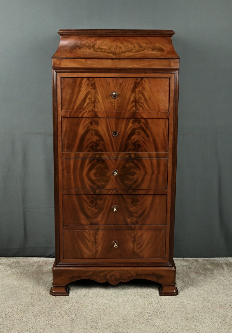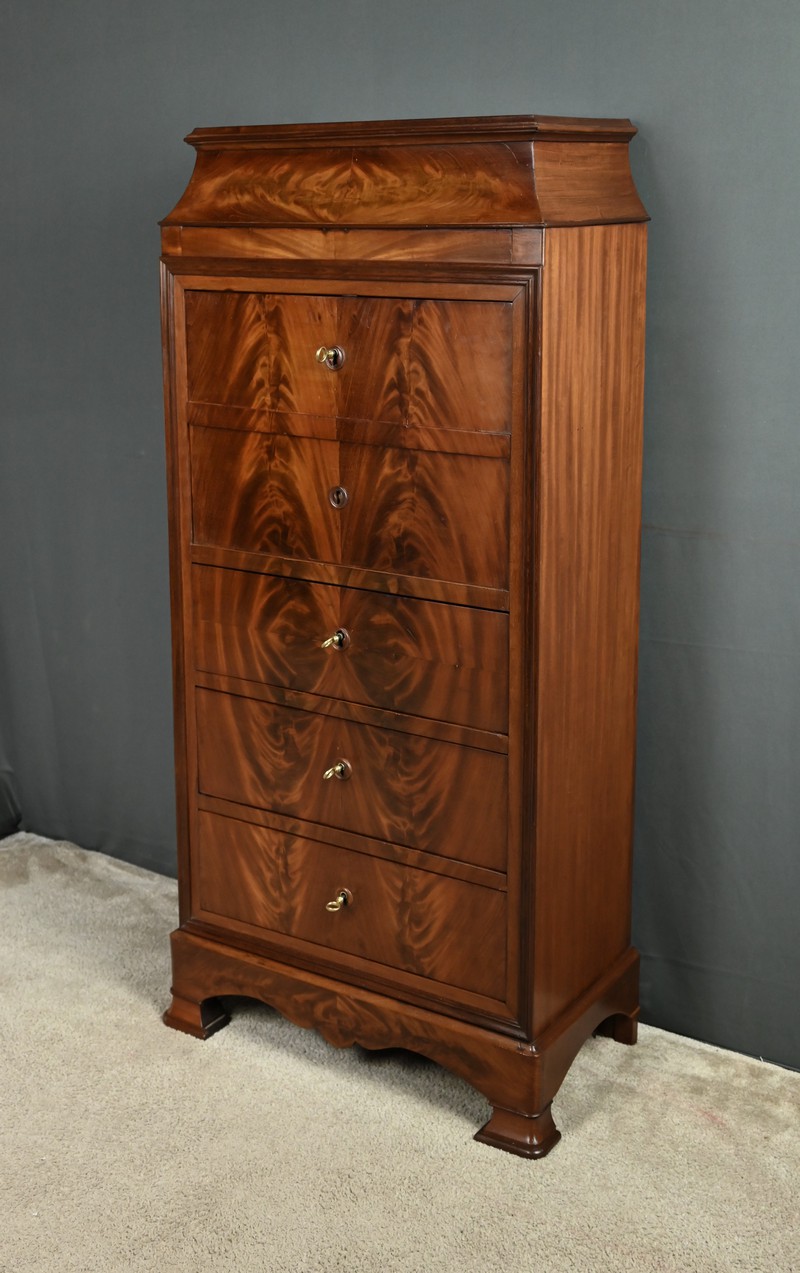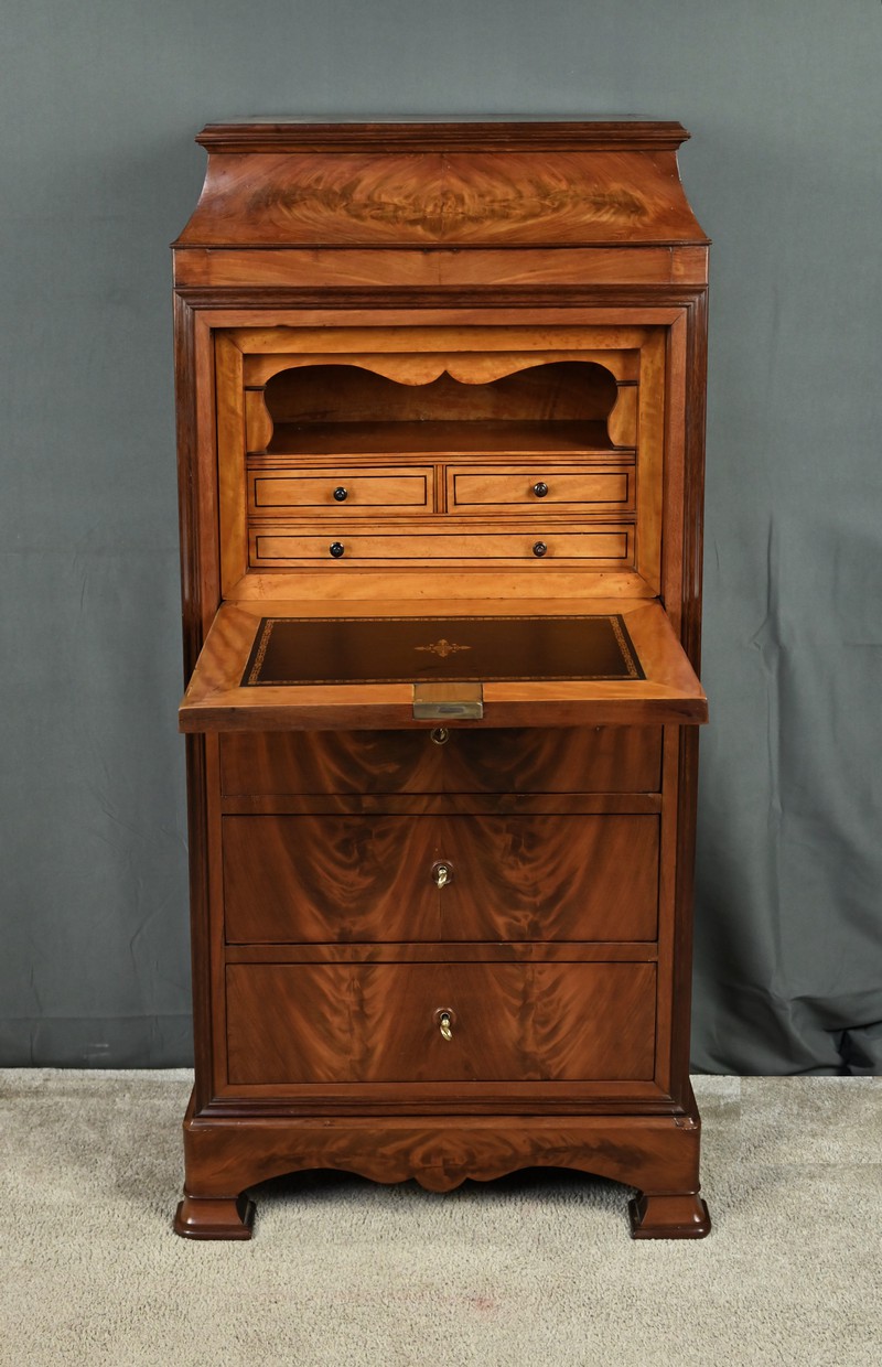 Ce secrétaire chiffonnier se remarque par son magnifique placage géométrique de feuilles de ronce d’acajou et son abattant ingénieusement dissimulé dans la façade. Ce meuble raffiné offre également trois tiroirs spacieux pour le rangement. L’espace secrétaire en citronnier comprend une niche centrale surmontant trois tiroirs dotés de boutons de tirage en bois noirci. L’abattant est habillé d’un cuir noir orné d’une vignette dorée et d’un motif central délicat, ajoutant une touche de distinction. Les grands tiroirs sont munis d’entrées filet et de serrures fonctionnelles avec clé d’origine. Le meuble est sommé d’un dessus mouluré supporté par des faces convexes soulignées de baguettes. Ce secrétaire repose sur des pieds en doucine surmontés d’une plinthe mouvementée.