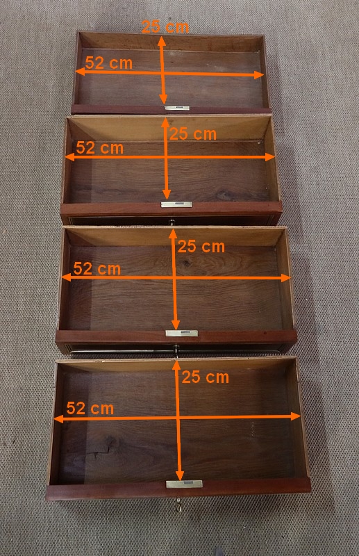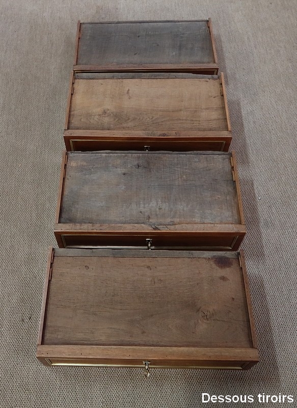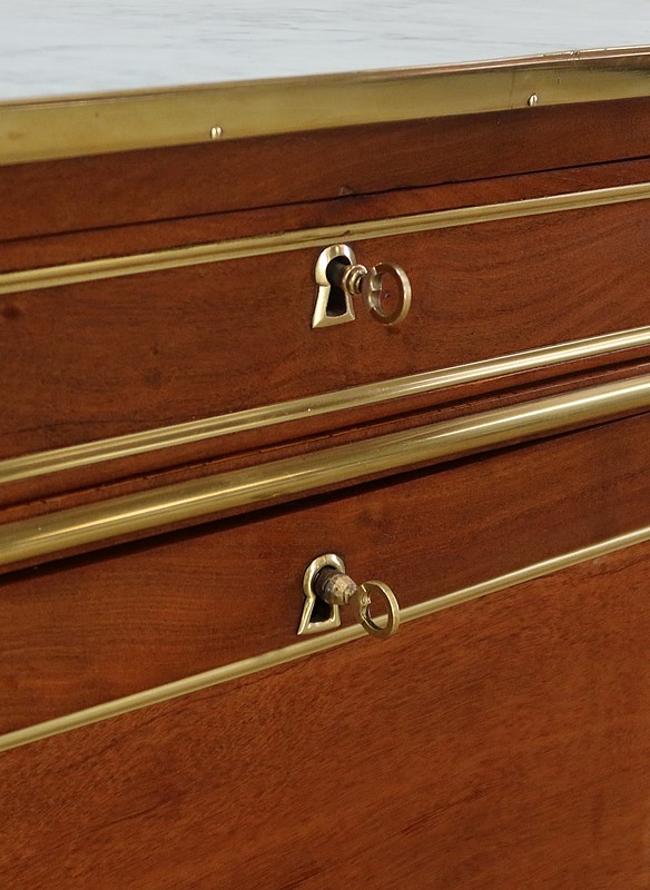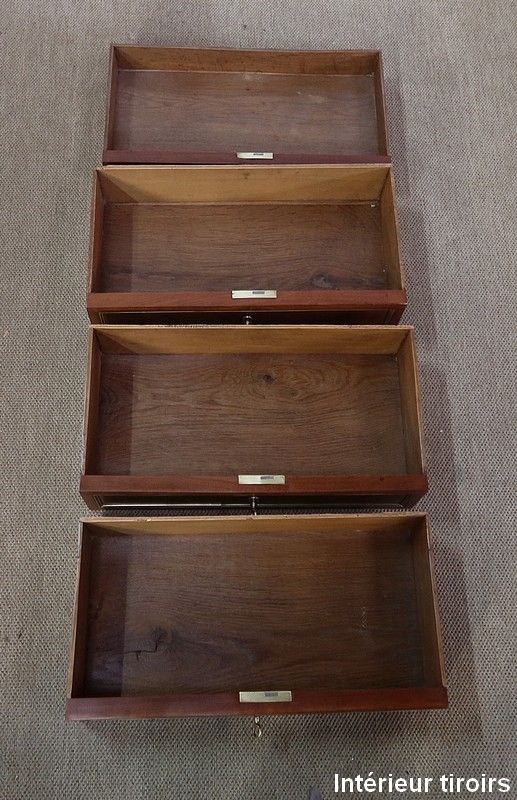 Ce meuble unique ouvre par un tiroir en partie haute, un abattant et trois tiroirs en partie basse. Chacune des façades possède des baguettes en laiton mettant en valeur la teinte profonde de l’acajou.