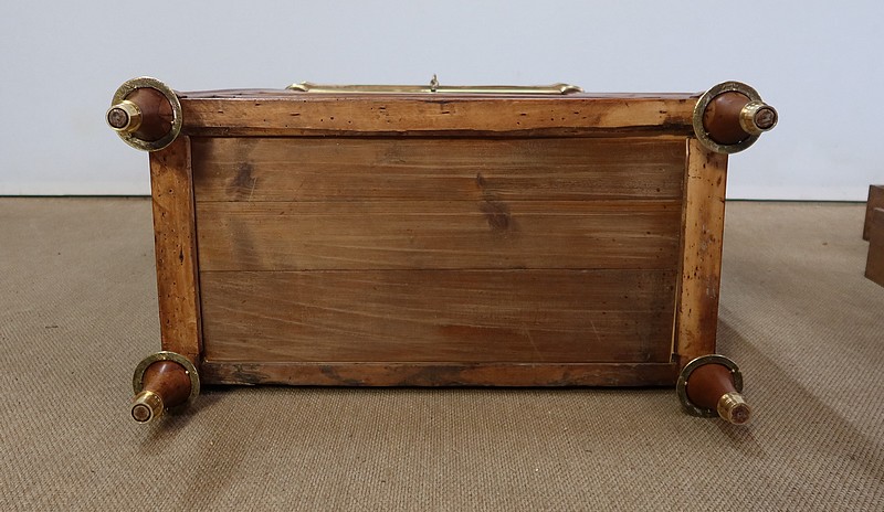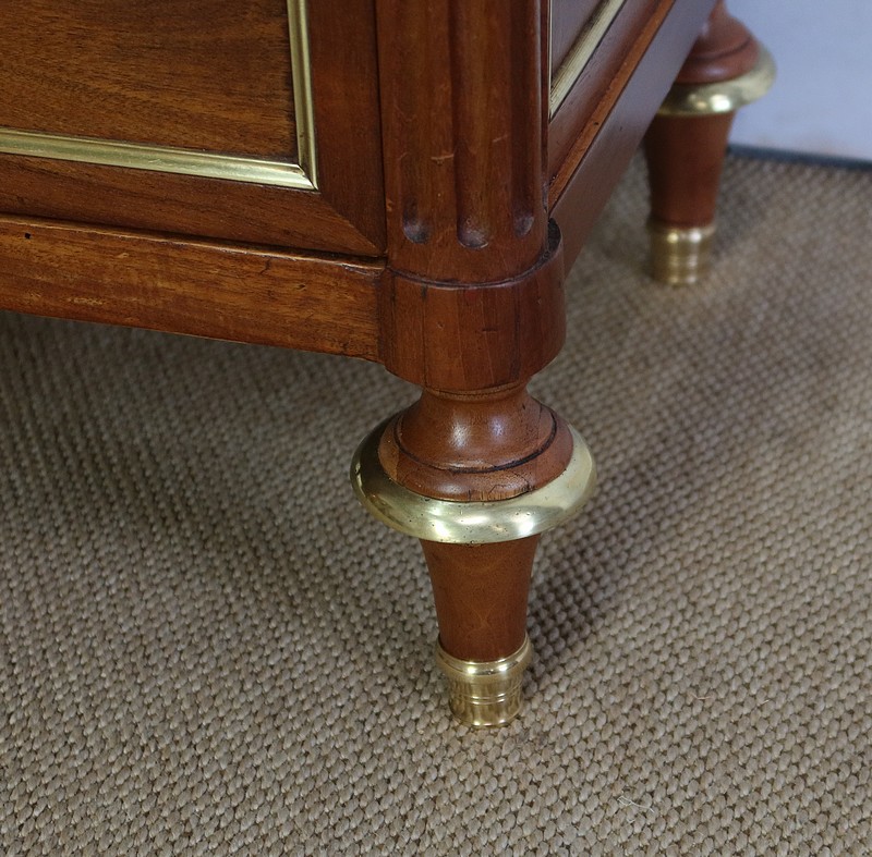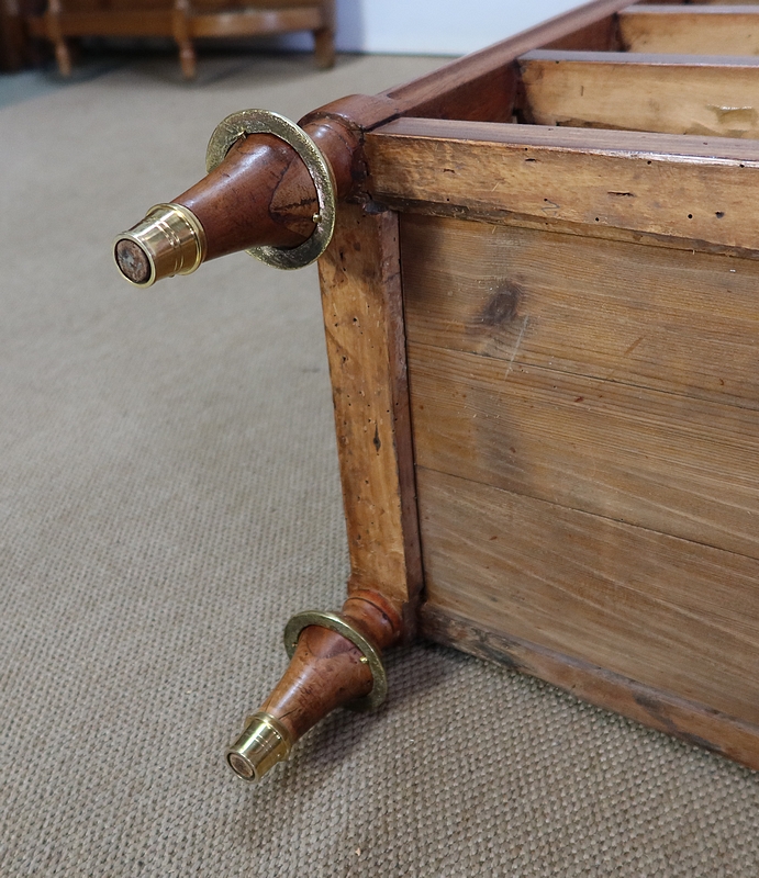 Cet élégant secrétaire possède des pieds en ressaut comportant en partie haute une plaque de laiton striée à motifs. Dessous, une large baguette quart de rond en laiton entoure l’ensemble du mobilier. Le reste des pieds avant présentent quatre cannelures. Ils se terminent par un pied toupie avec collerette et petit sabot en laiton.