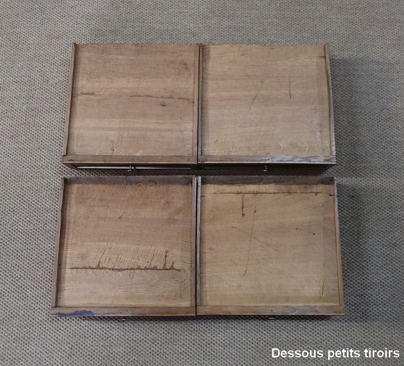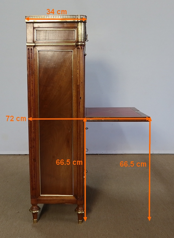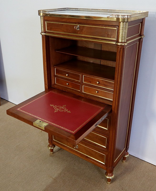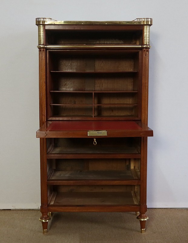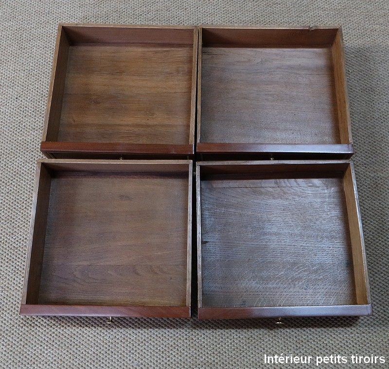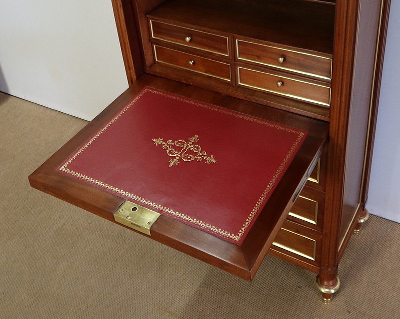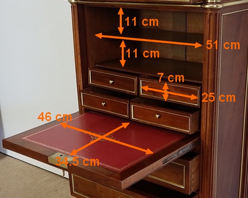 L’abattant ouvre sur un espace de rangement composé de quatre petits tiroirs possédant des boutons lentilles et de deux niches. Il est garni d’un cuir rouge avec vignette à froid et décoré d’un motif central doré.
