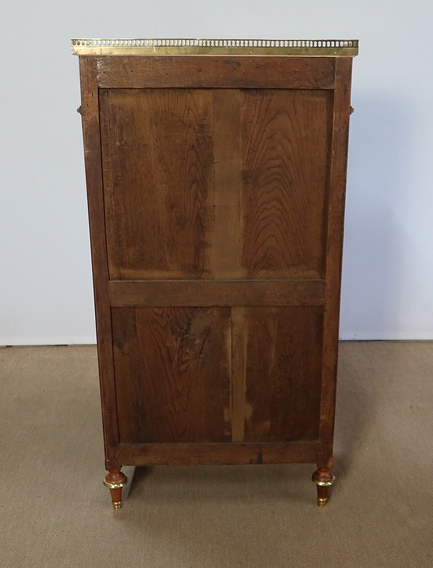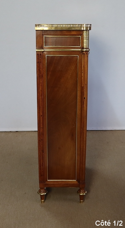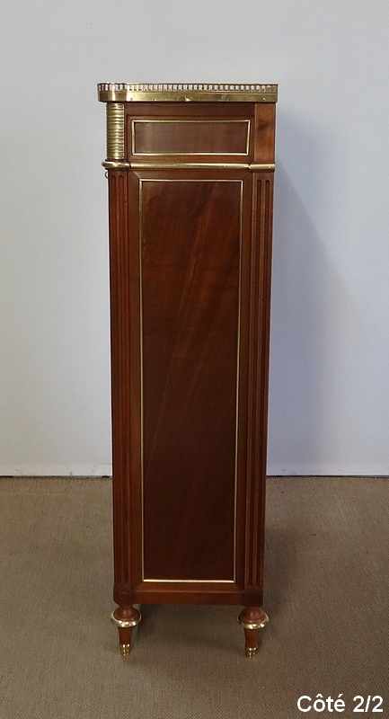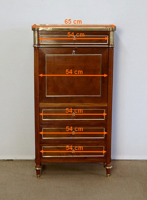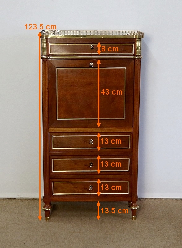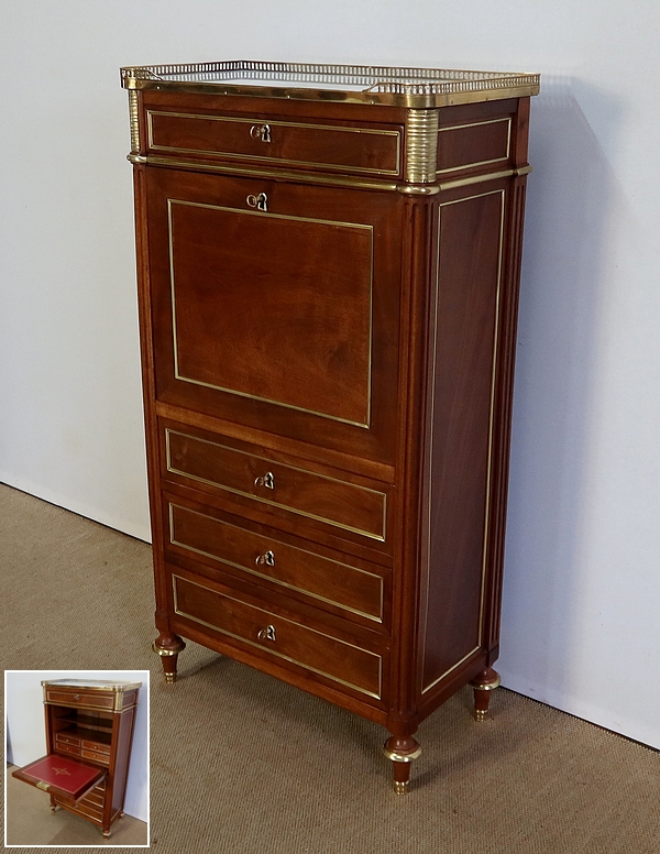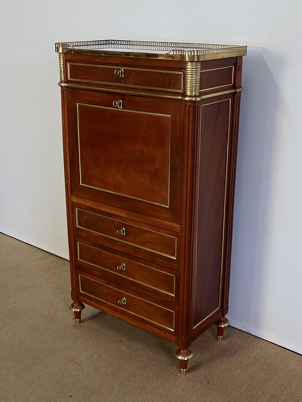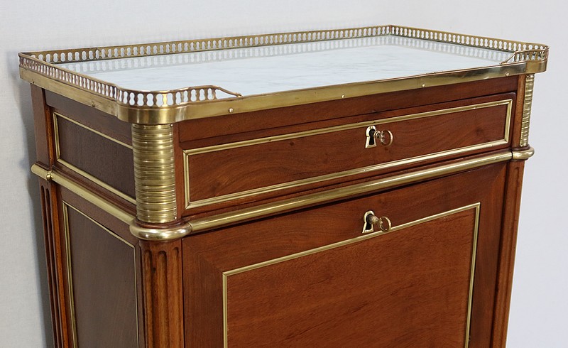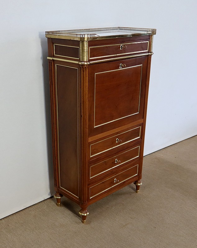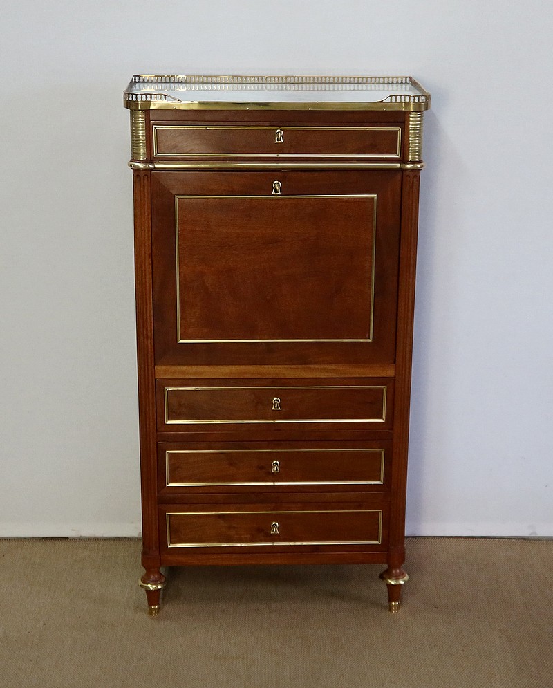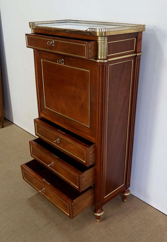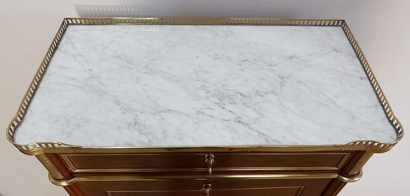 Secrétaire en acajou massif et placage d’acajou surmonté d’un marbre blanc de Carrare légèrement veiné de gris et entouré d’une galerie en laiton à décrochement sur le devant.