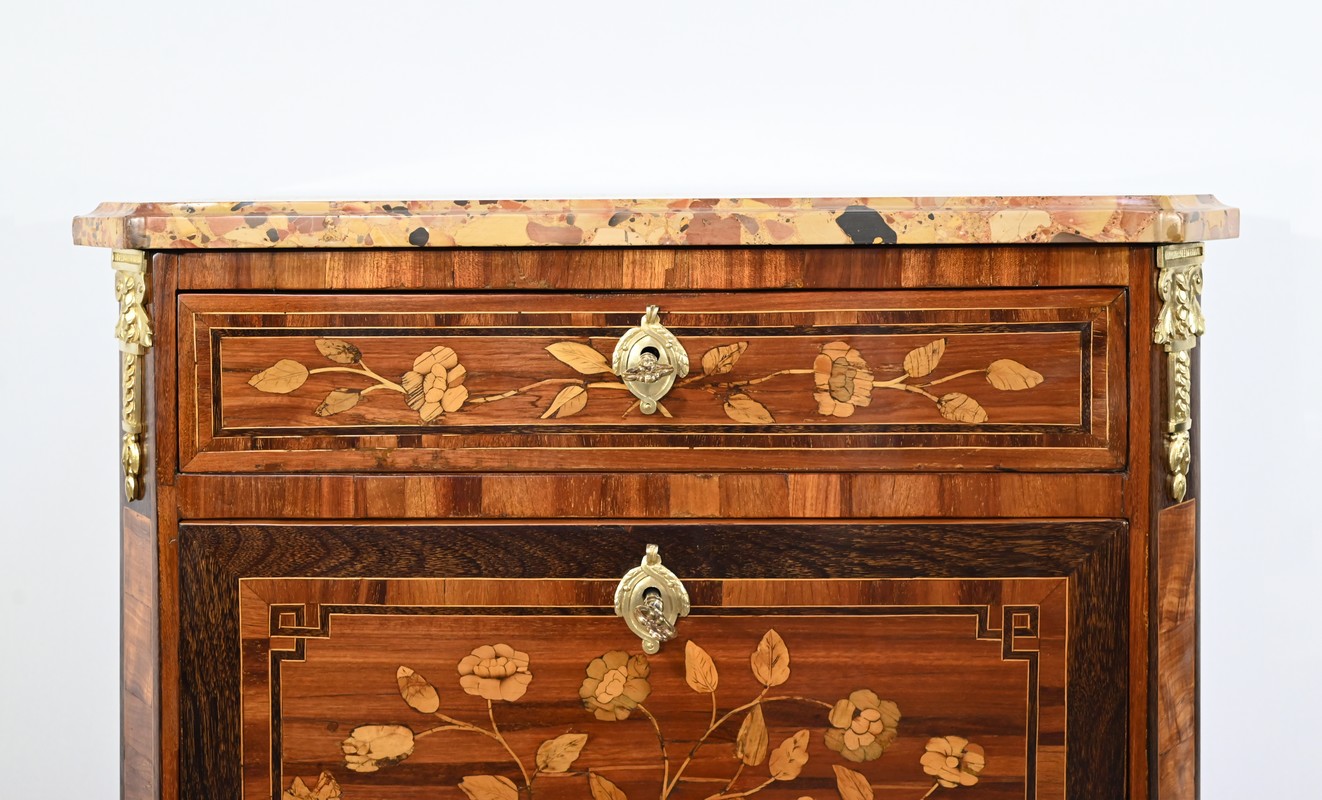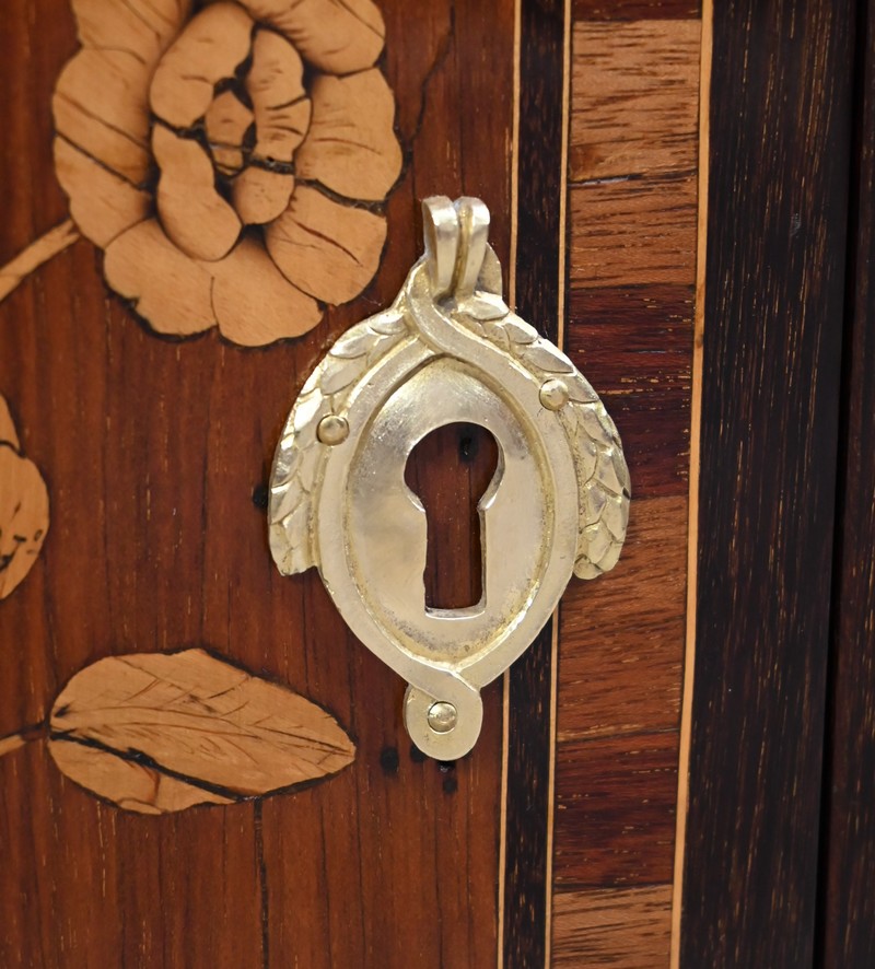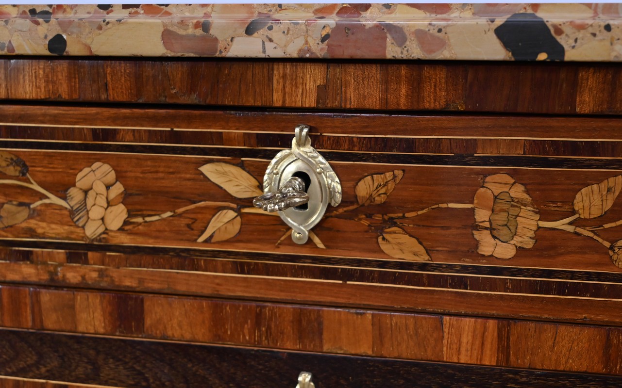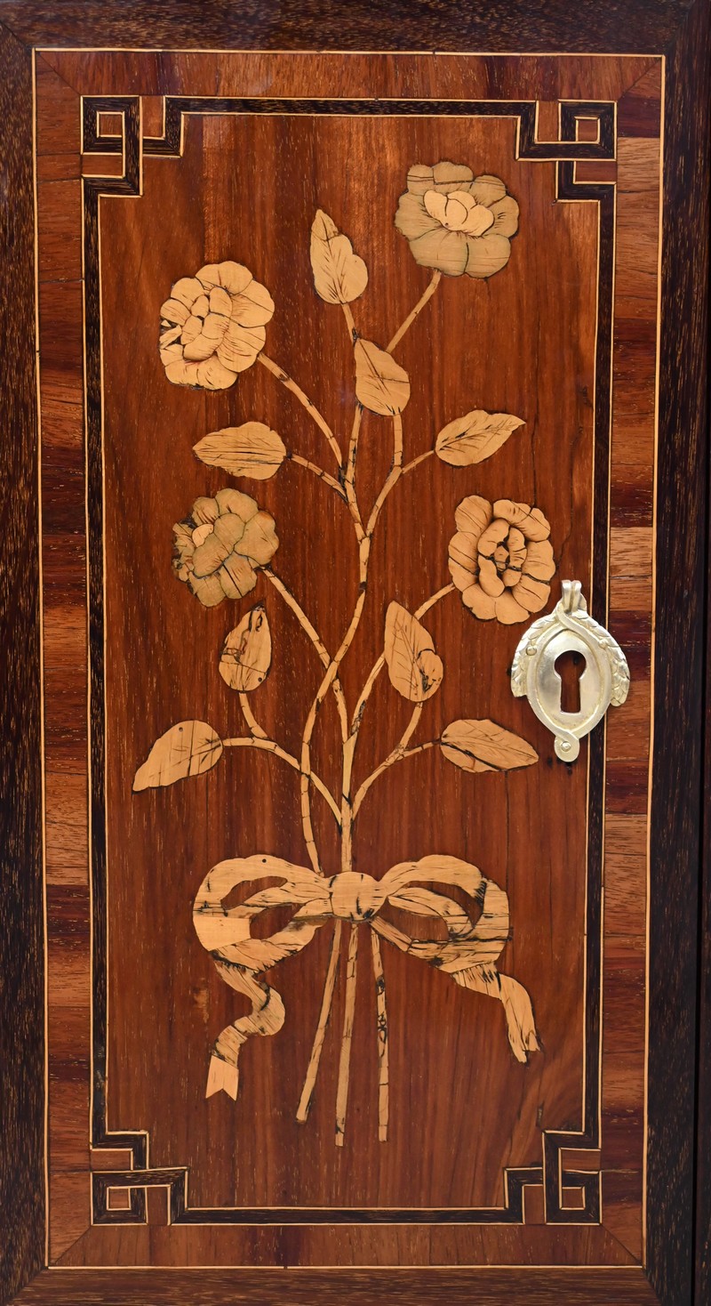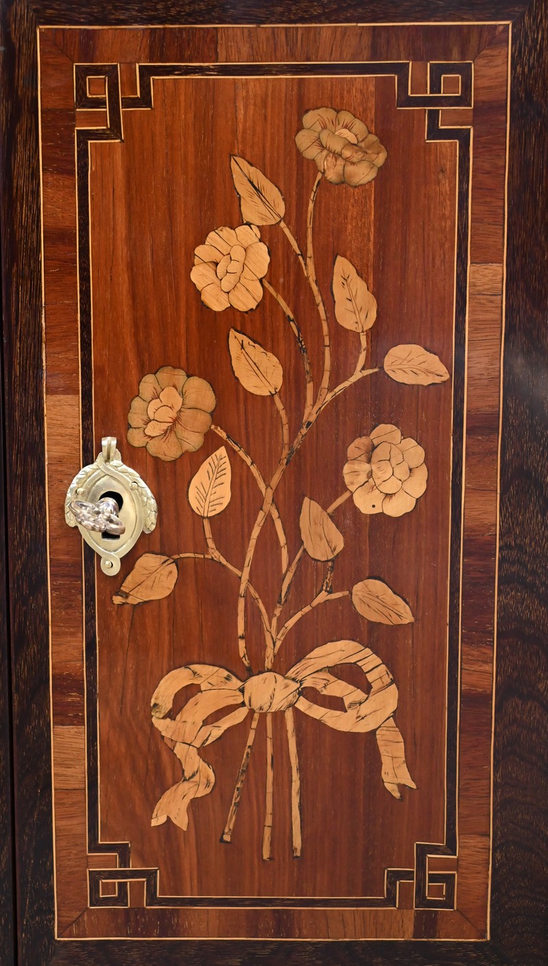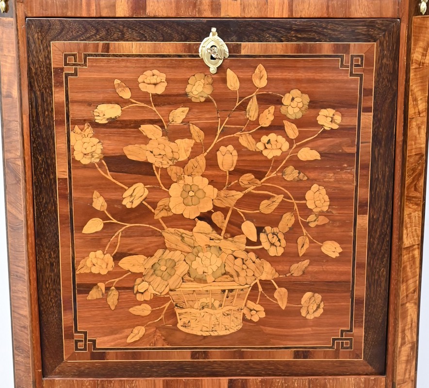 En dessous, l’abattant, également muni d’une serrure d’origine, présente un important décor en marqueterie d’une corbeille de fleurs avec pourtour et coins grecques en amarante.