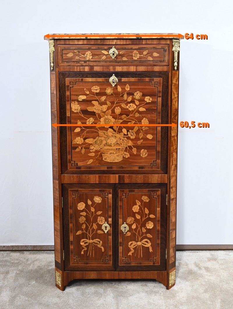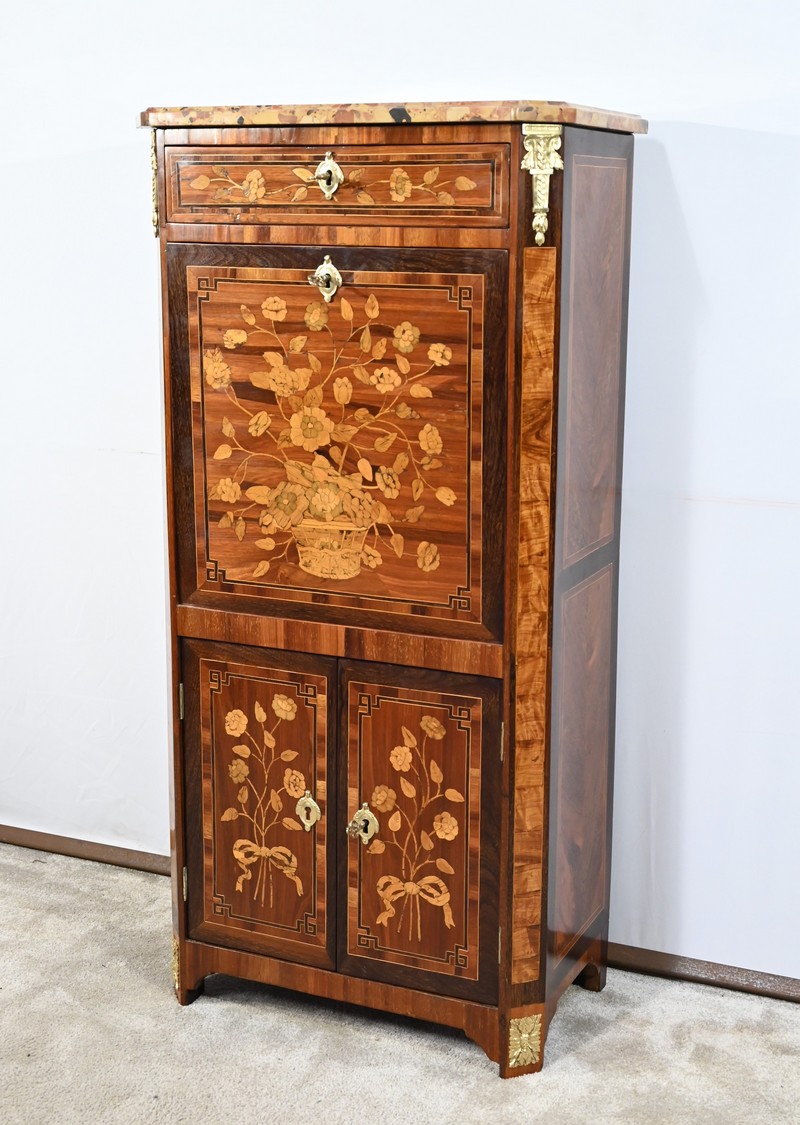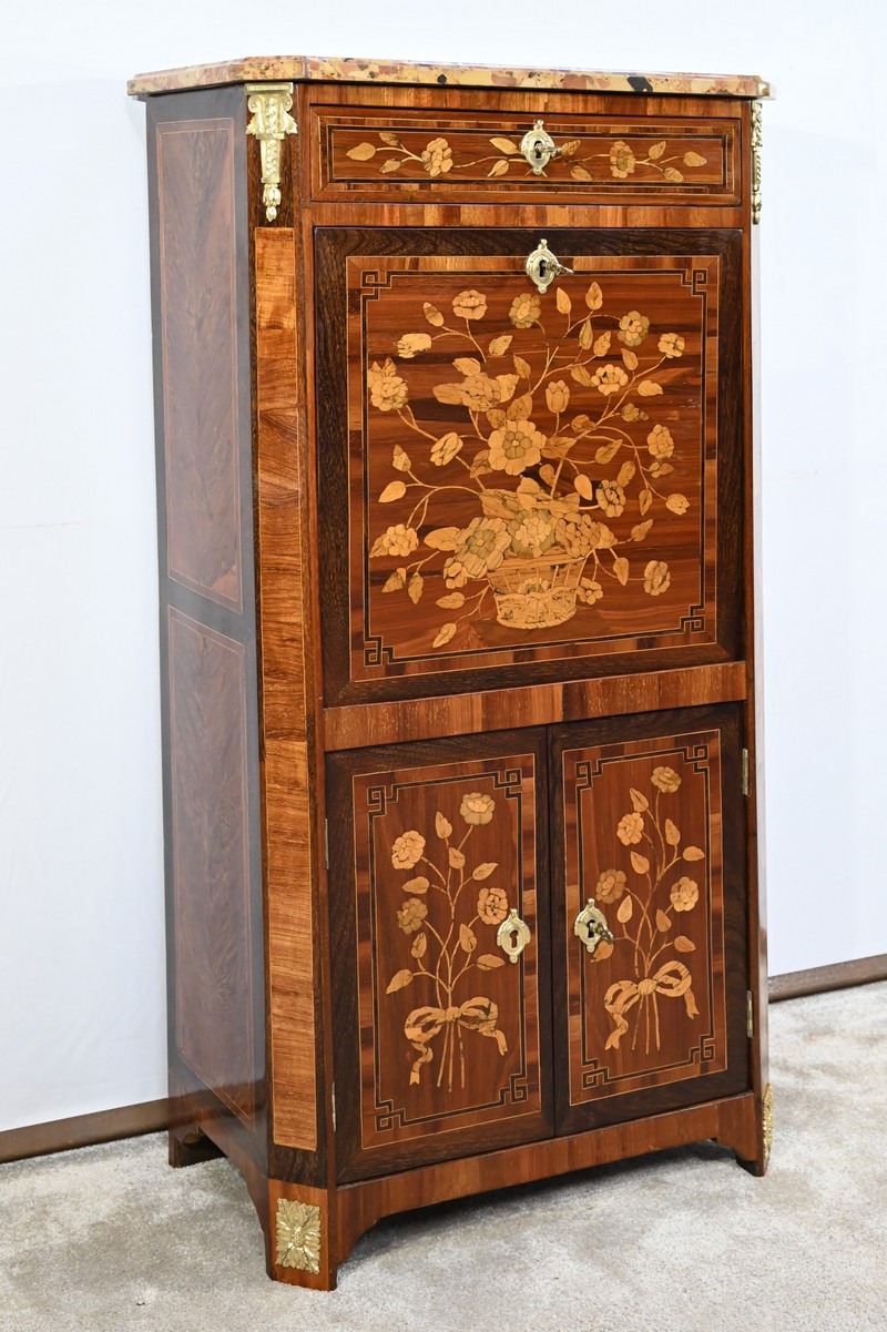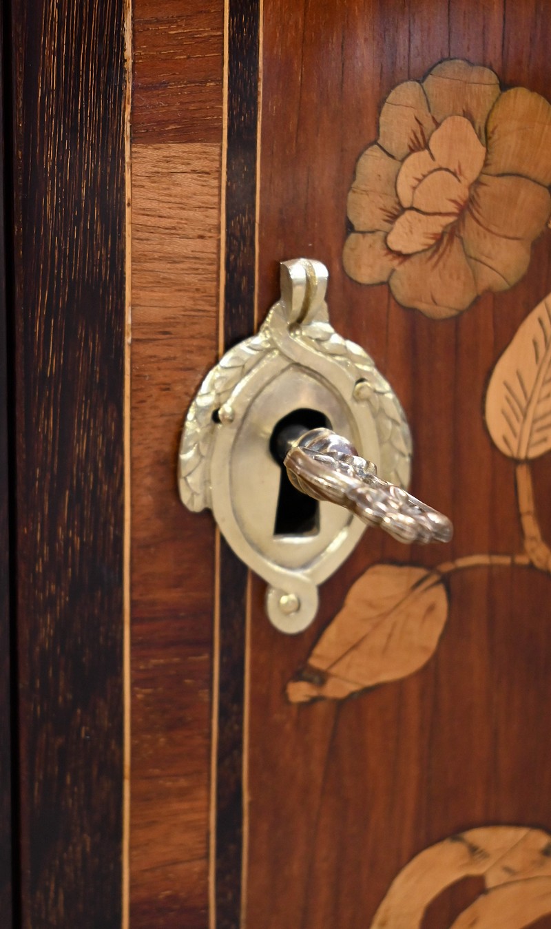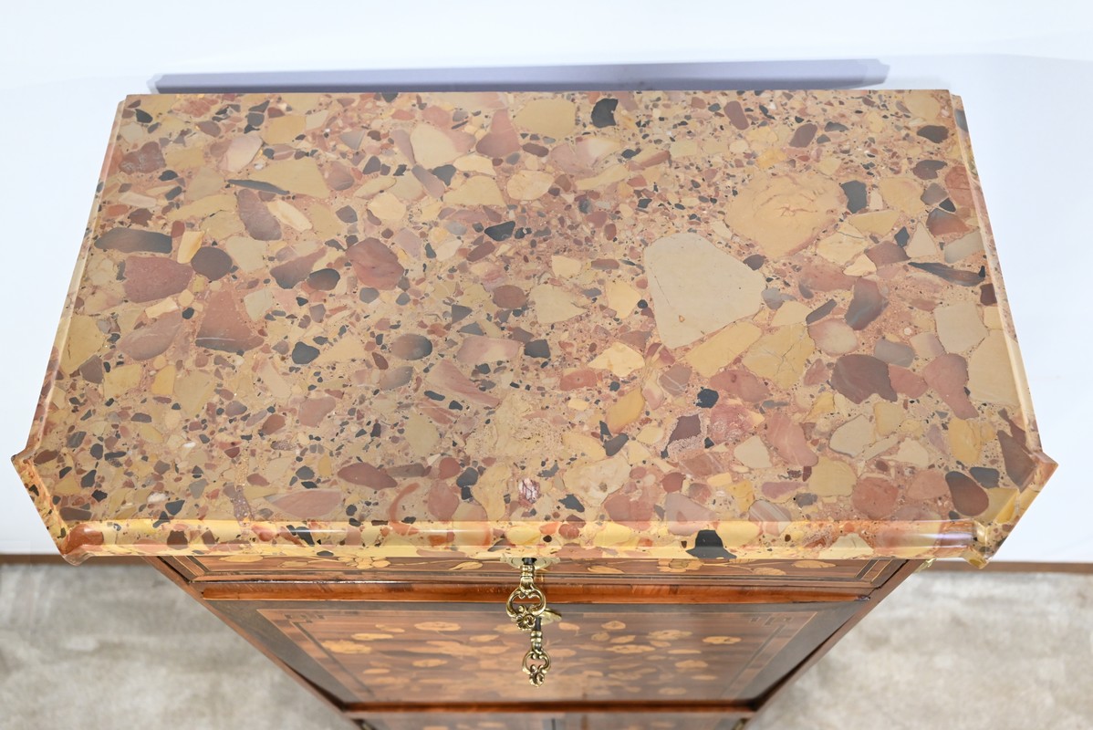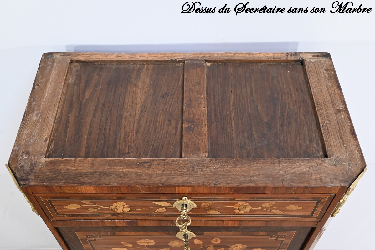 En dessous, l’abattant, également muni d’une serrure d’origine, présente un important décor en marqueterie d’une corbeille de fleurs avec pourtour et coins grecques en amarante.