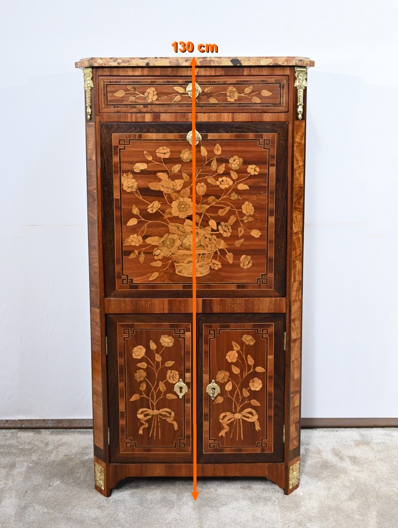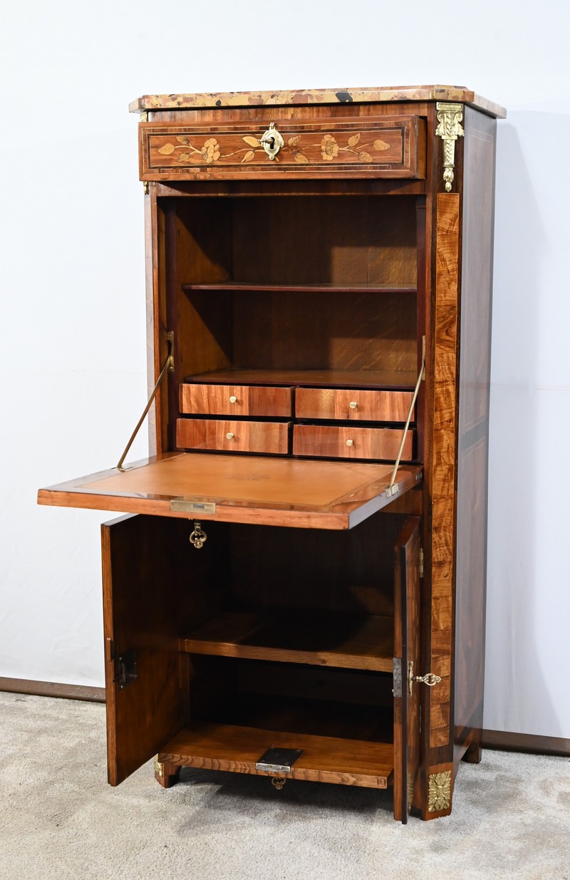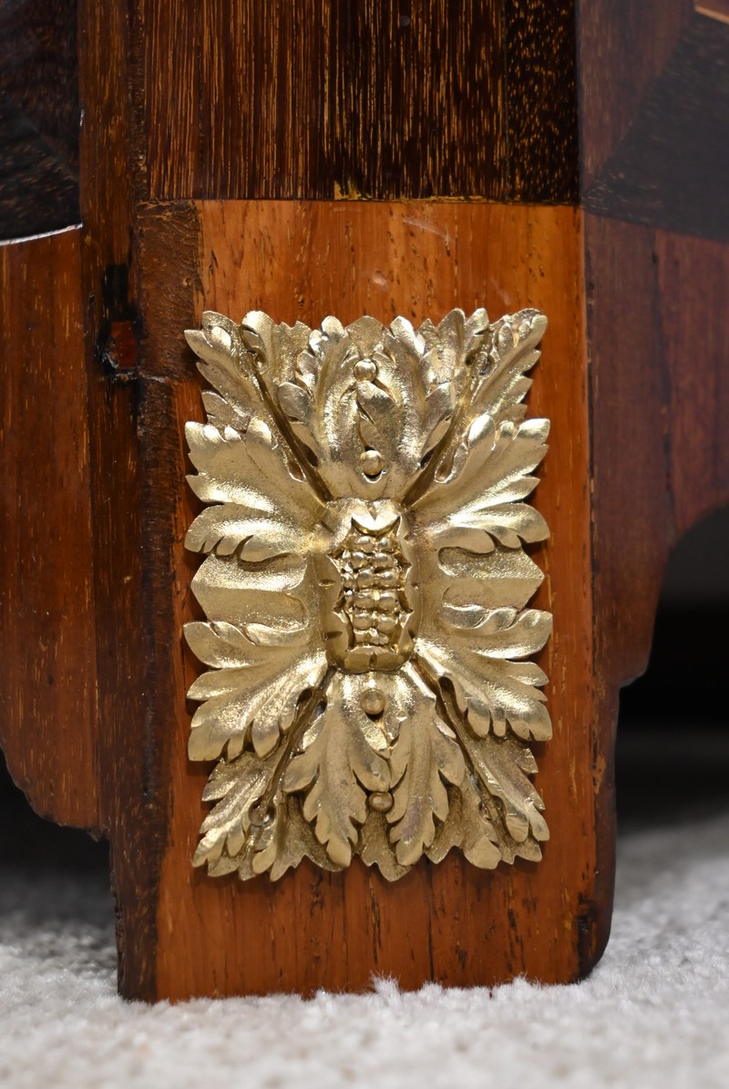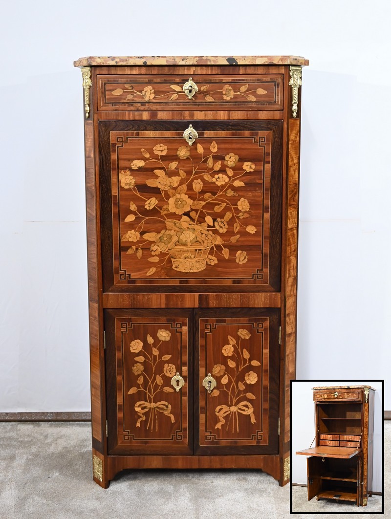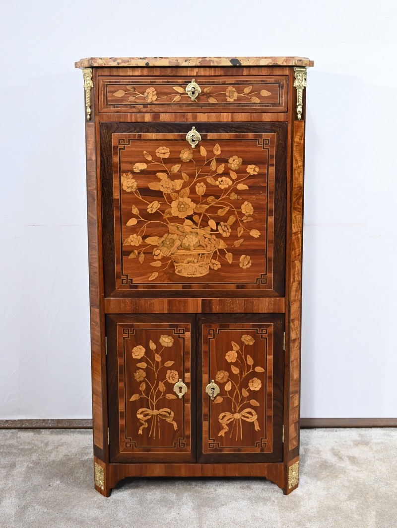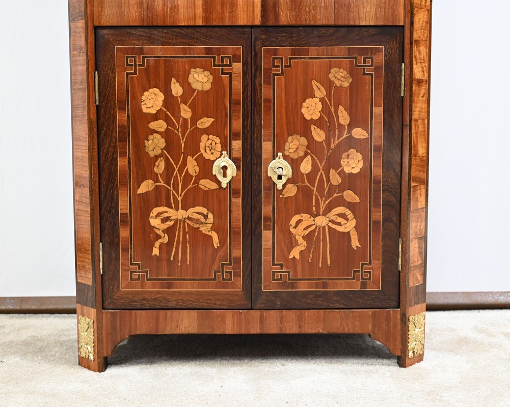 En dessous, l’abattant, également muni d’une serrure d’origine, présente un important décor en marqueterie d’une corbeille de fleurs avec pourtour et coins grecques en amarante.