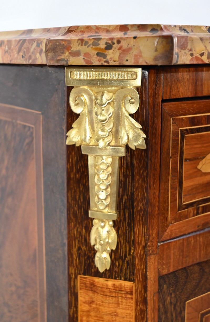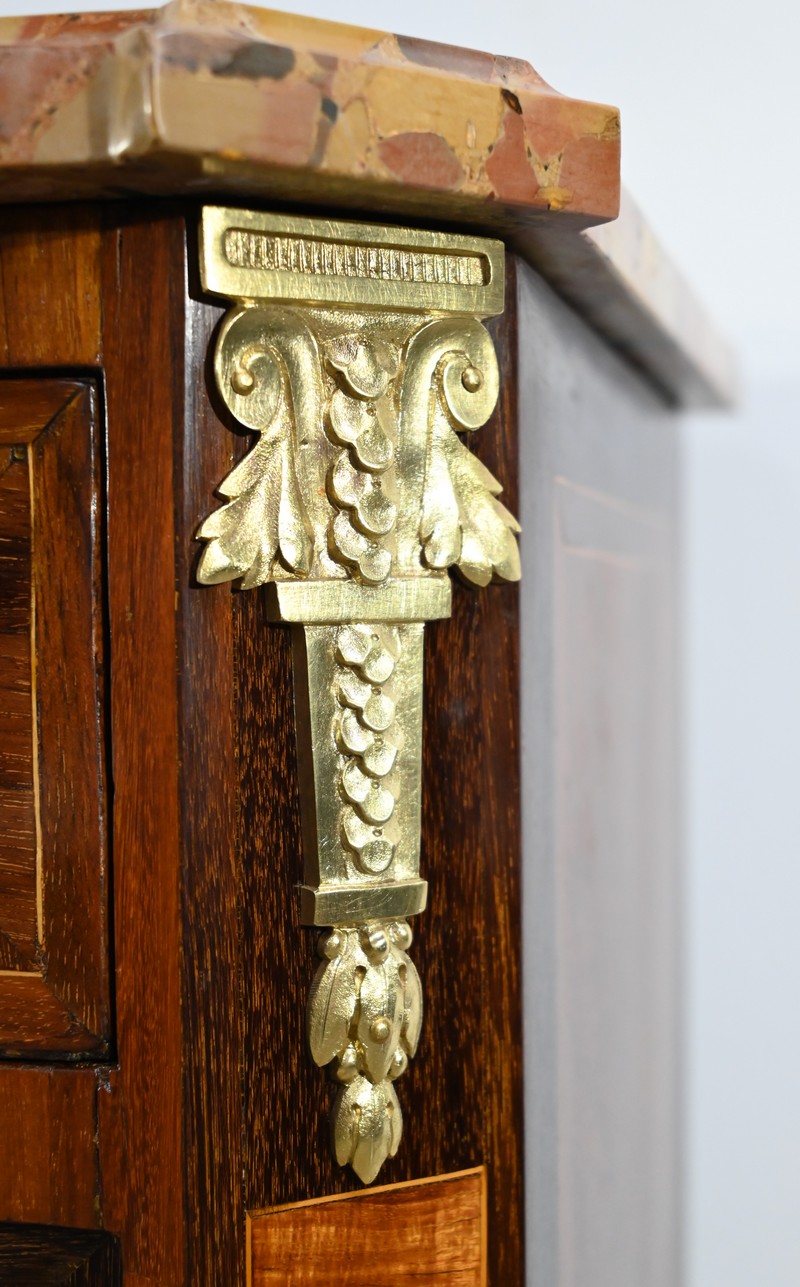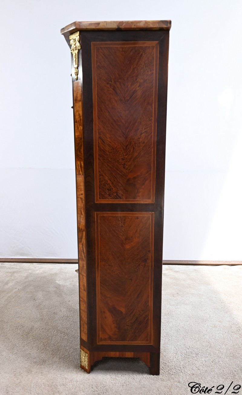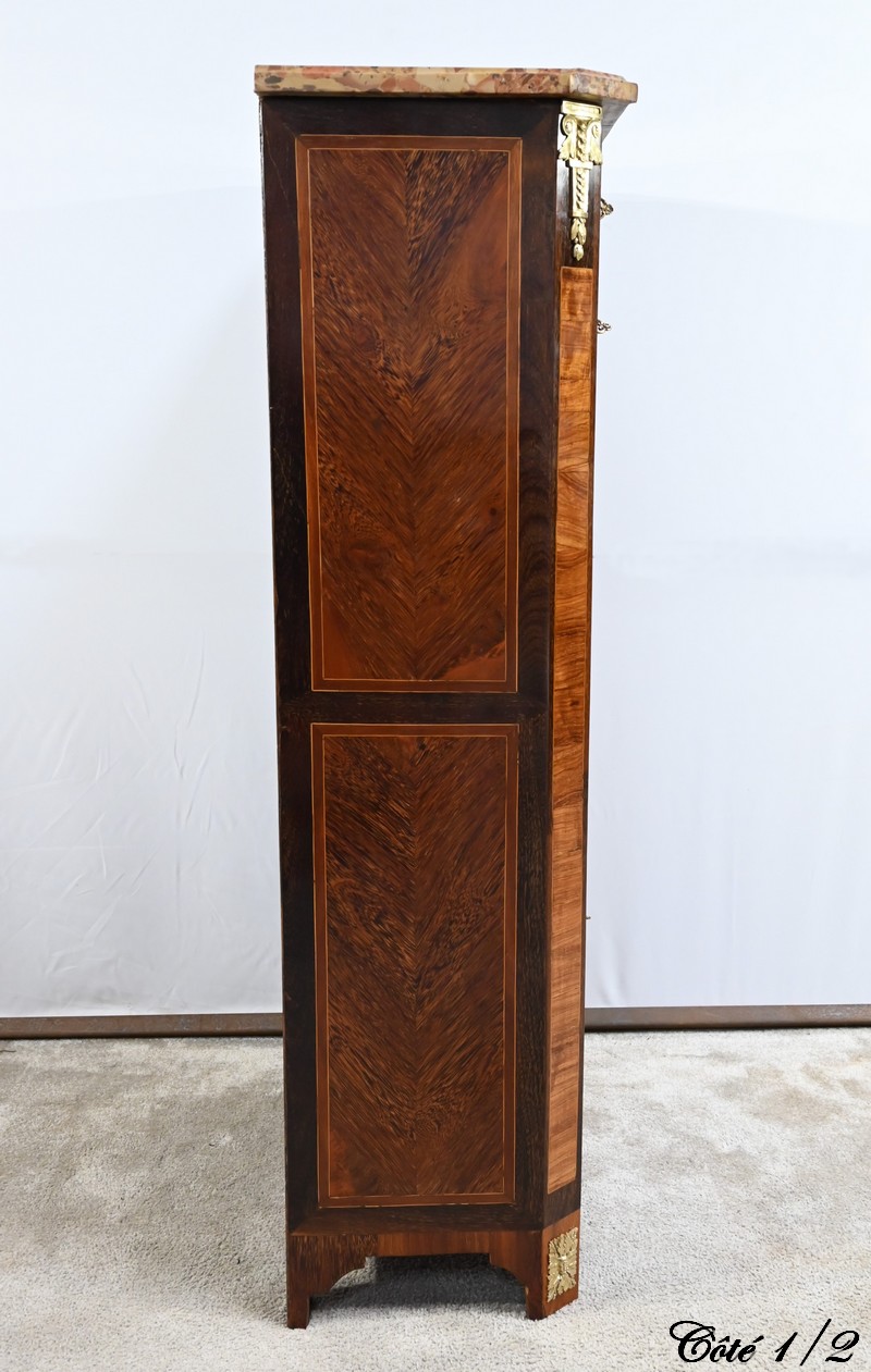 Les montants à pans coupés de ce meuble, en bois de rose et amarante, sont mis en valeur par des chutes « chapiteau » en haut et des motifs en bronze doré en bas.