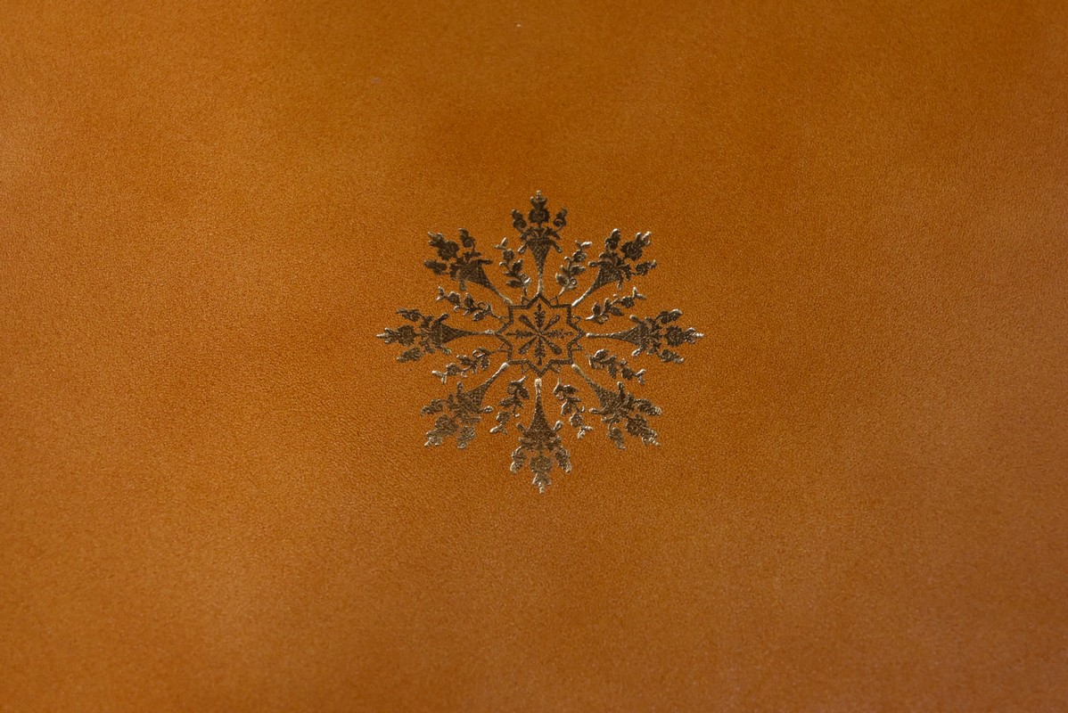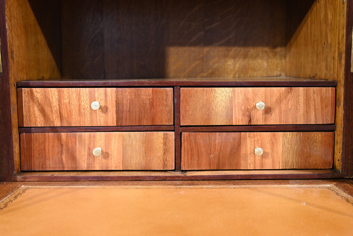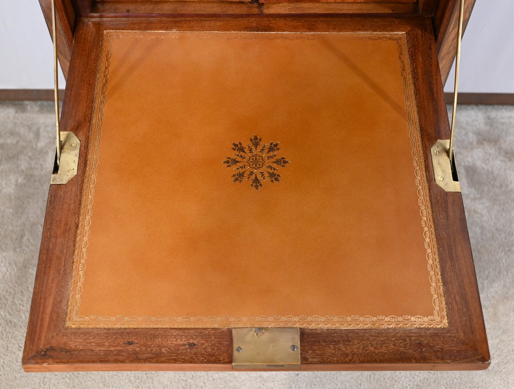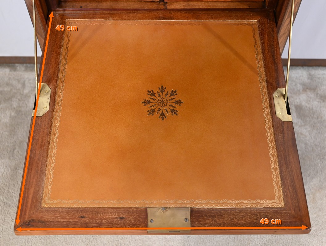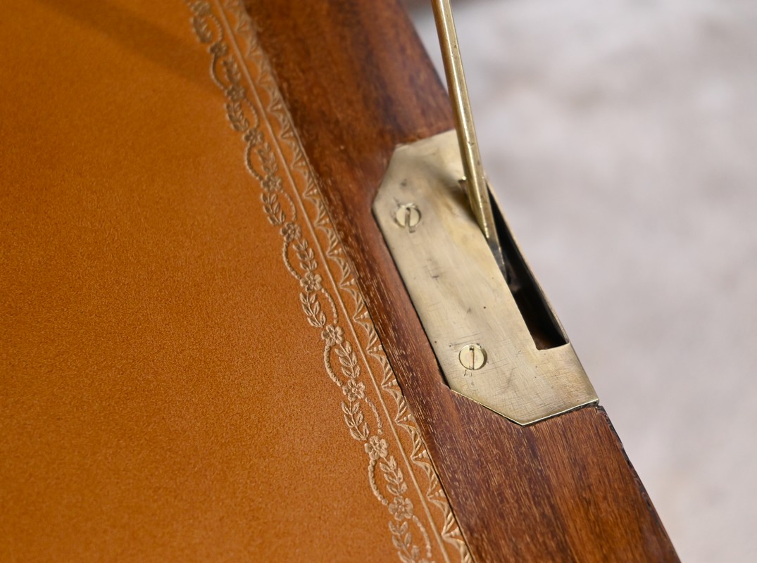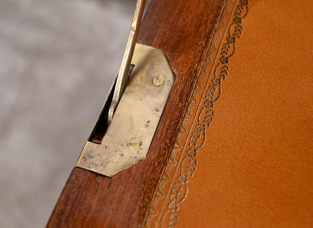 Ouvert, cet abattant, garnis d’un cuir orange refait avec vignette dorée et motif central, est maintenu par deux compas laiton.