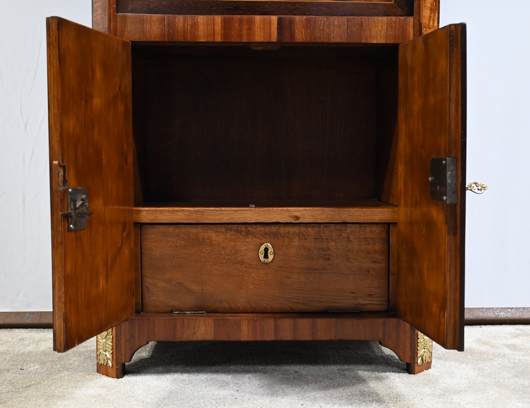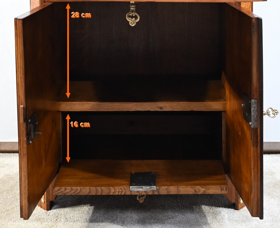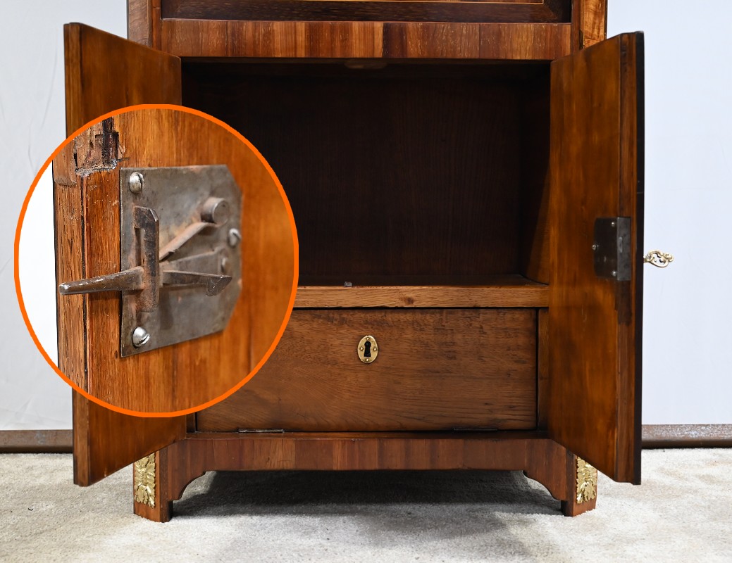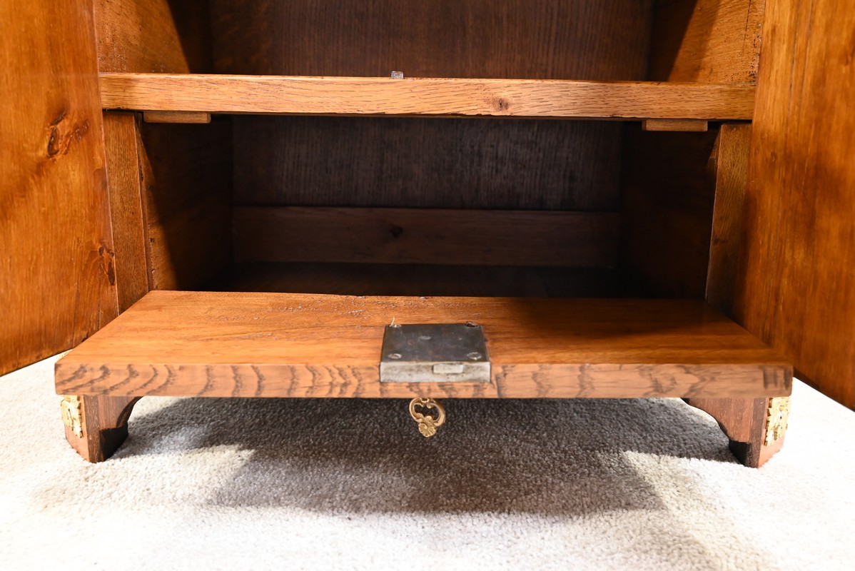 Cet ouvrant donne accès à deux niches dont l’une est équipée d’un abattant, monté sur charnières, munis également d’une serrure entrée ovale en laiton et clé.
