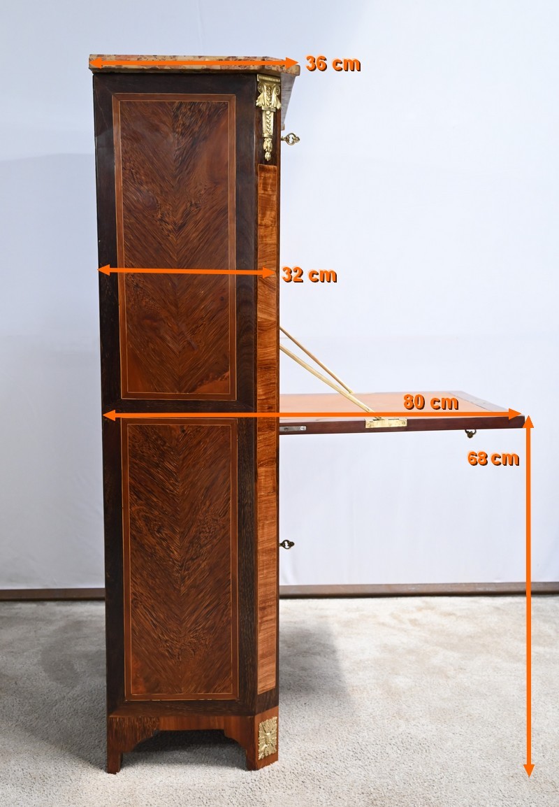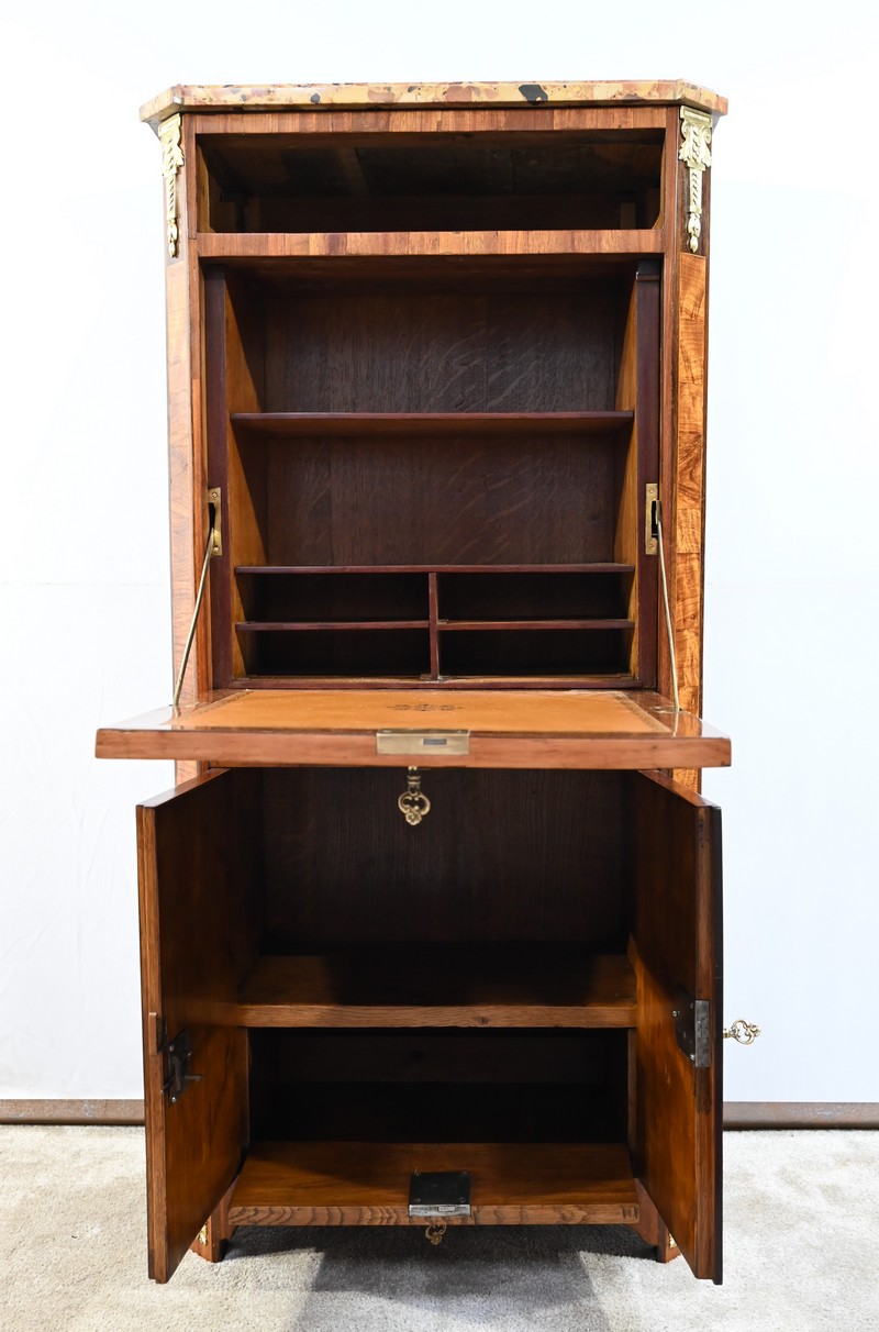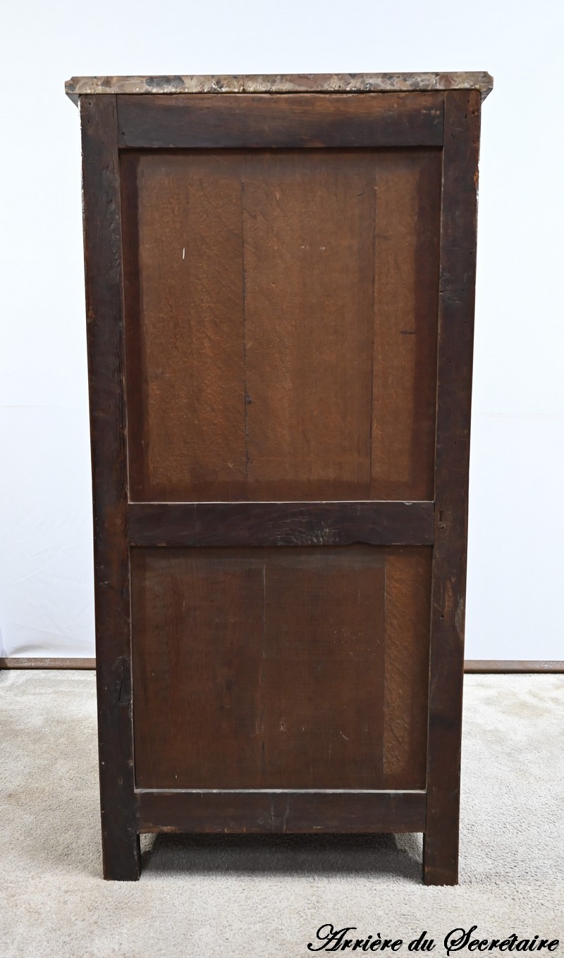 Cet ouvrant donne accès à deux niches dont l’une est équipée d’un abattant, monté sur charnières, munis également d’une serrure entrée ovale en laiton et clé.