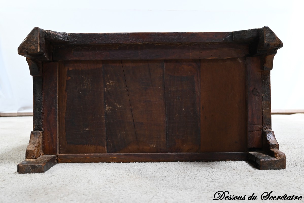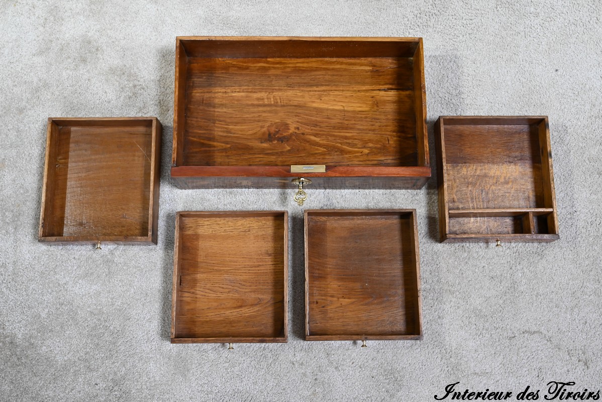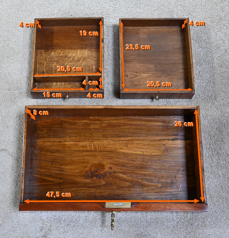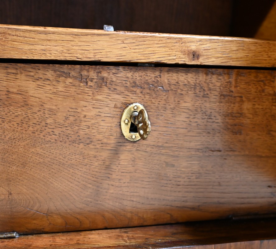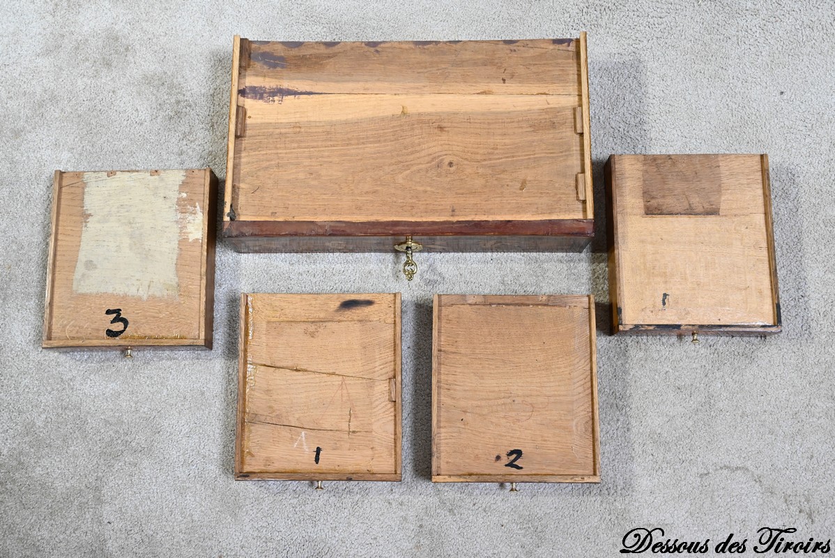 Ce tiroir équipé d’une serrure fonctionnelle authentique avec entrée en bronze doré et clé postérieure.